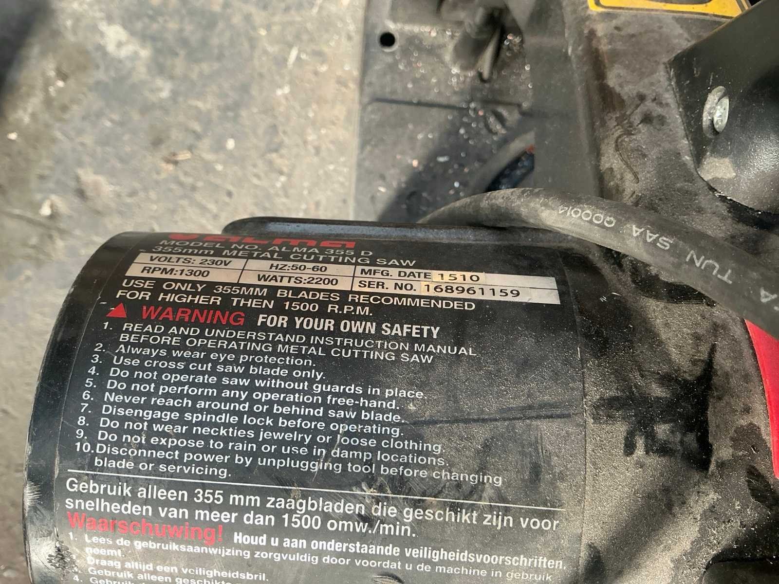 Nee Merk: Alma Type: 355D Bouwjaar: 2015 Zaagblad Ø: 355 Motorvermogen (kW): 2.2kW Aansluiting: 230V