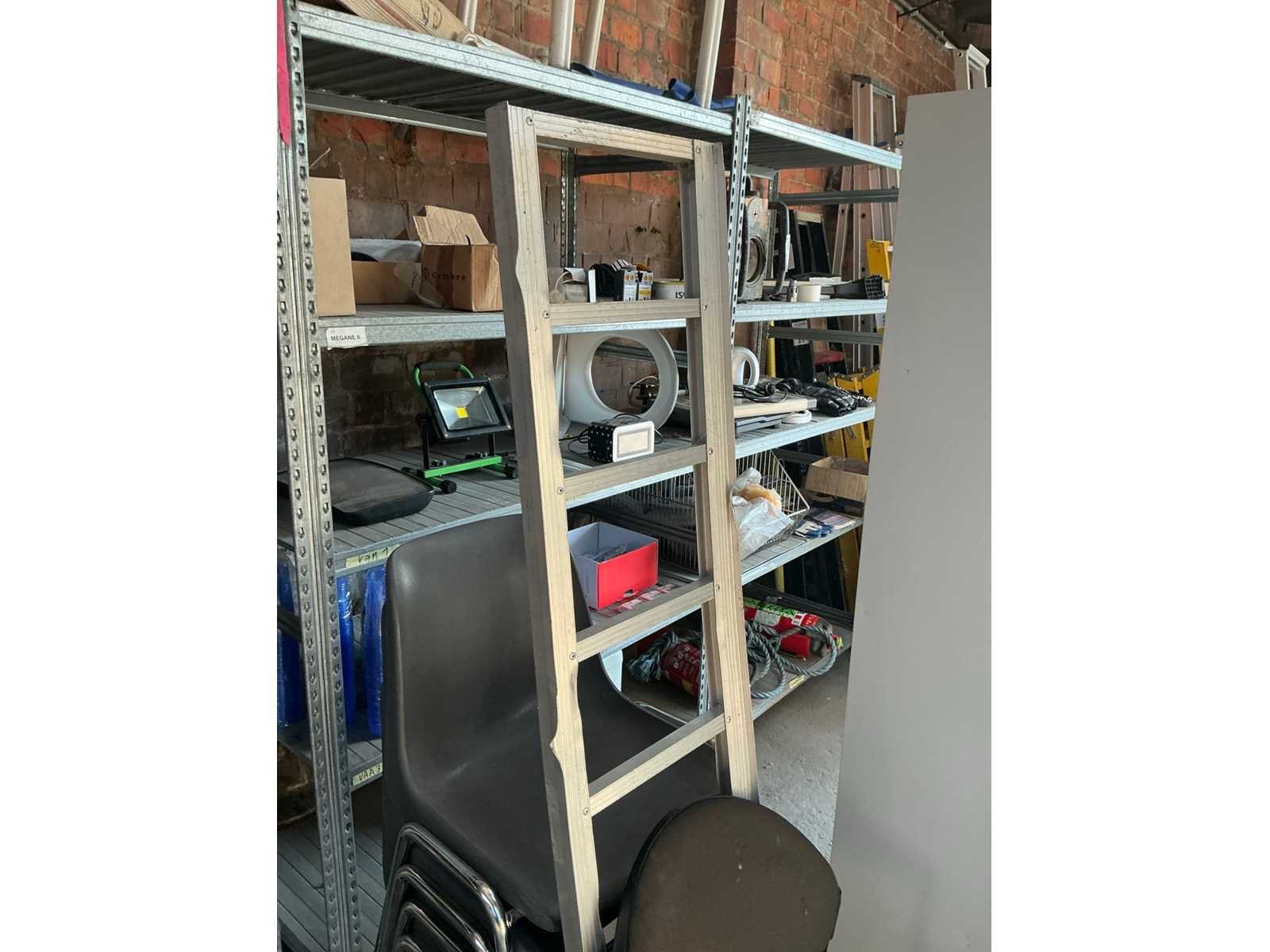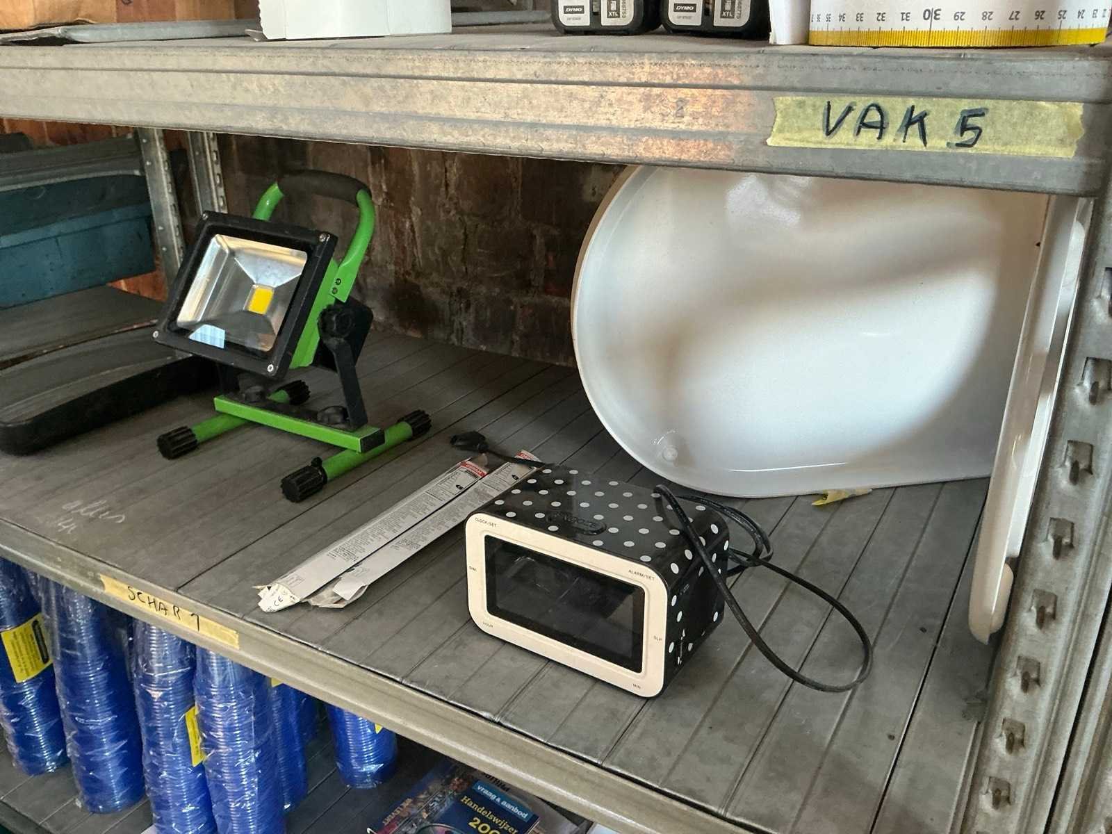Waaronder 7 diverse stoelen, 2 brandblussers, werkhandschoenen, kettingslot, kookplaat, werfradio, 650 drinkbekers, tapijt, Dymo rollen, RVS reiniger, waterkoker enz. Nee