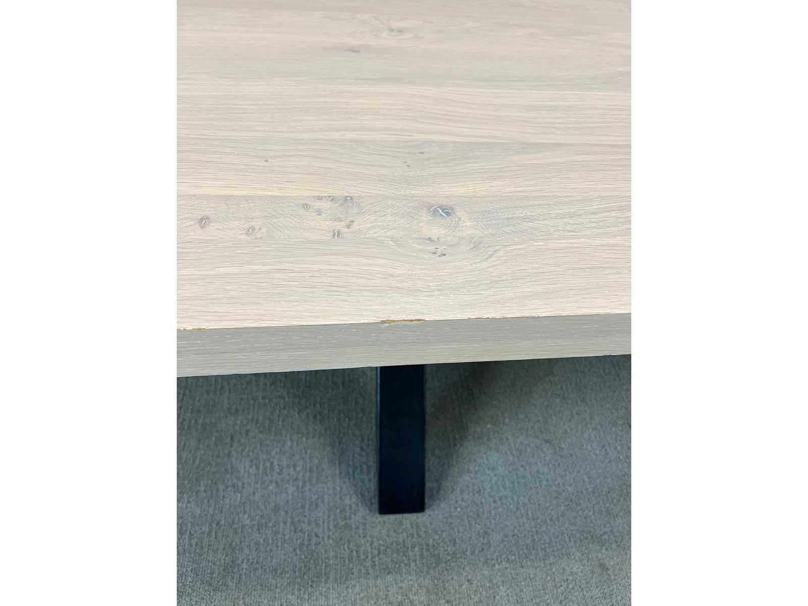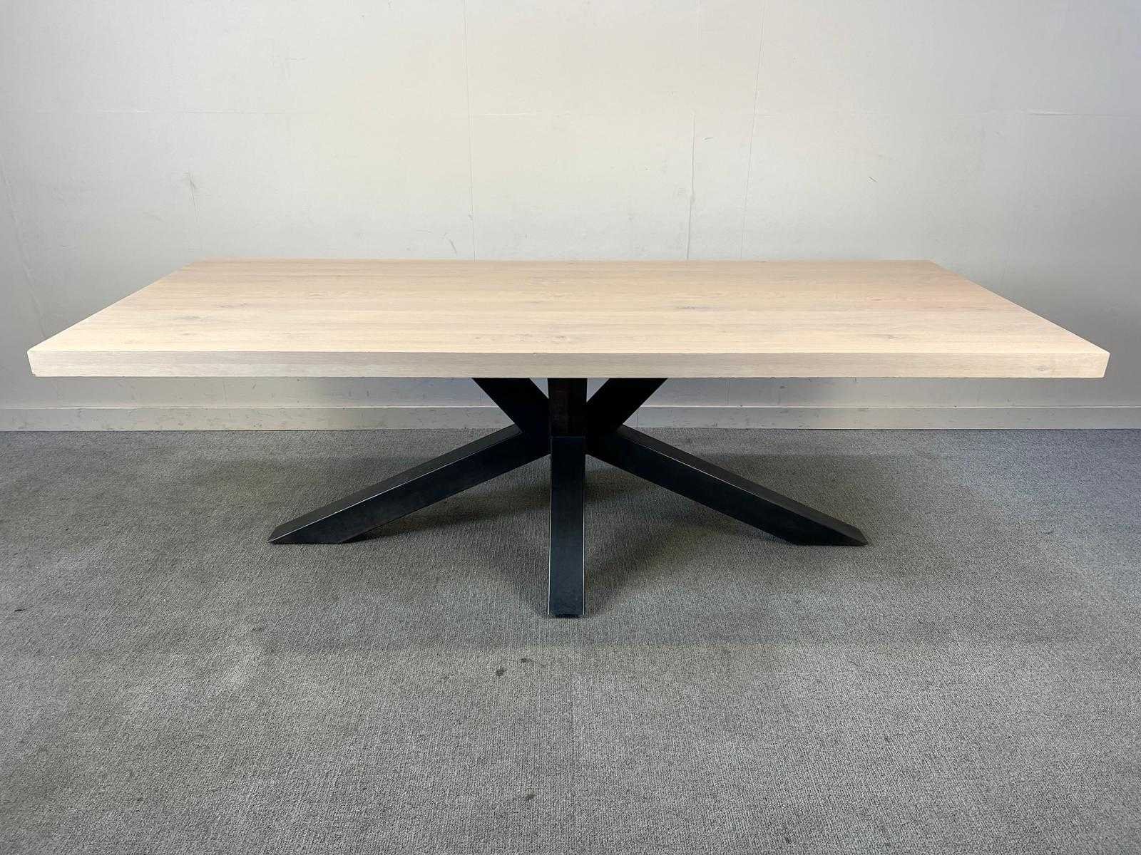 Robuuste tafel van 240 x 100 cm met houten blad en zwart metalen onderstel. Geschikt als vergader- of werktafel binnen kantoor- of projectomgevingen. Gebruikt, in goede staat. Nee Kleur: Hout Gewicht: 100kg Lengte: 240cm Breedte: 100cm Materiaal: Hout