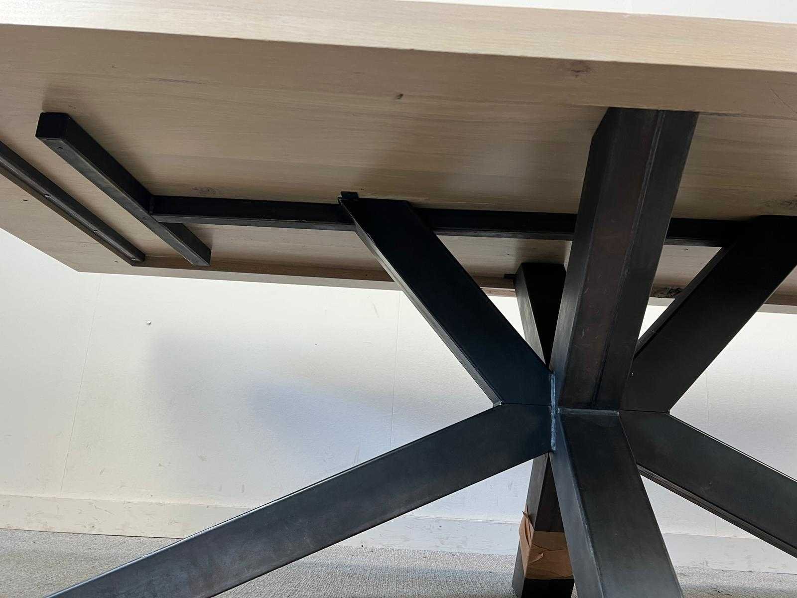 Robuuste tafel van 240 x 100 cm met houten blad en zwart metalen onderstel. Geschikt als vergader- of werktafel binnen kantoor- of projectomgevingen. Gebruikt, in goede staat. Nee Kleur: Hout Gewicht: 100kg Lengte: 240cm Breedte: 100cm Materiaal: Hout