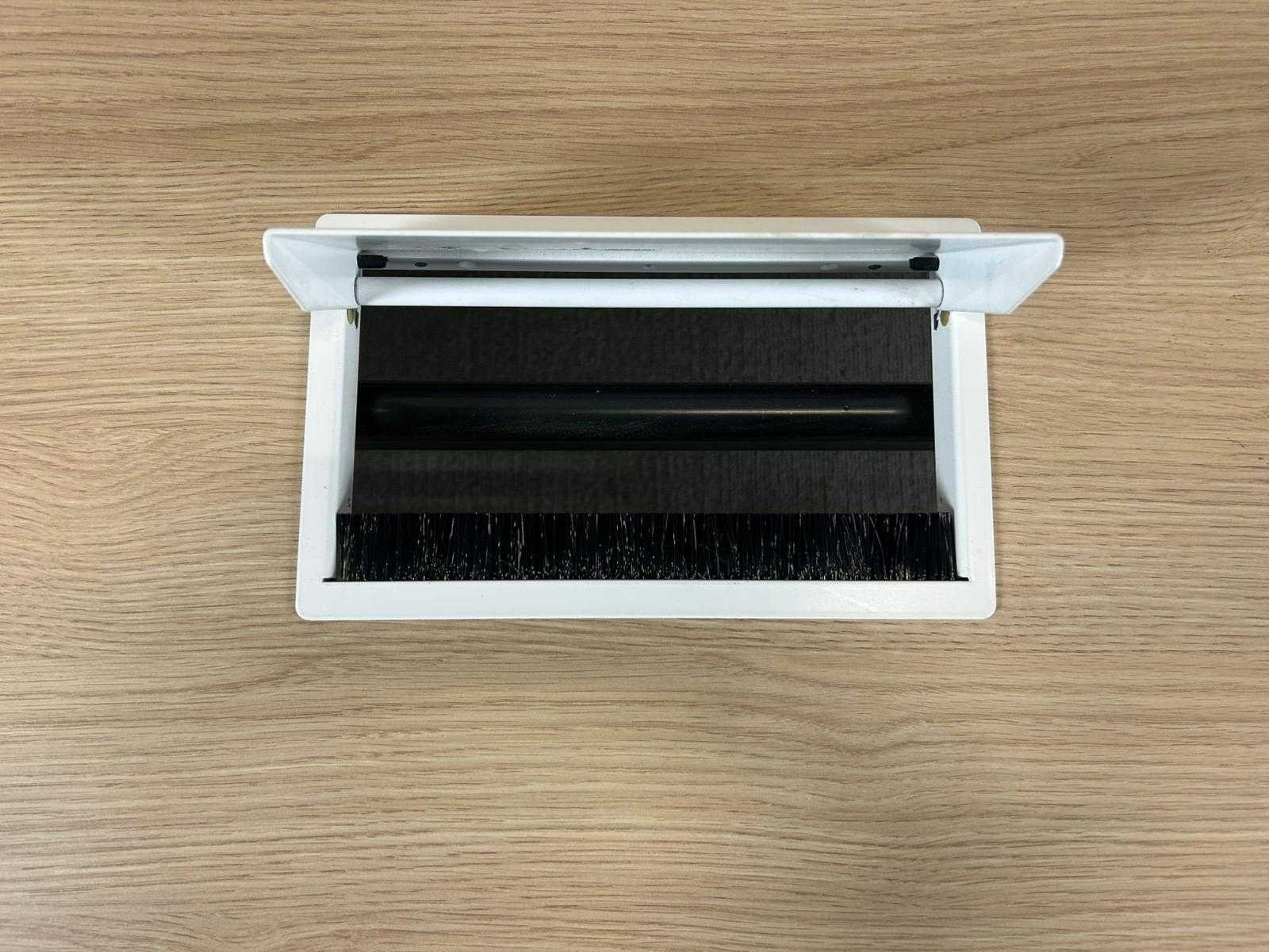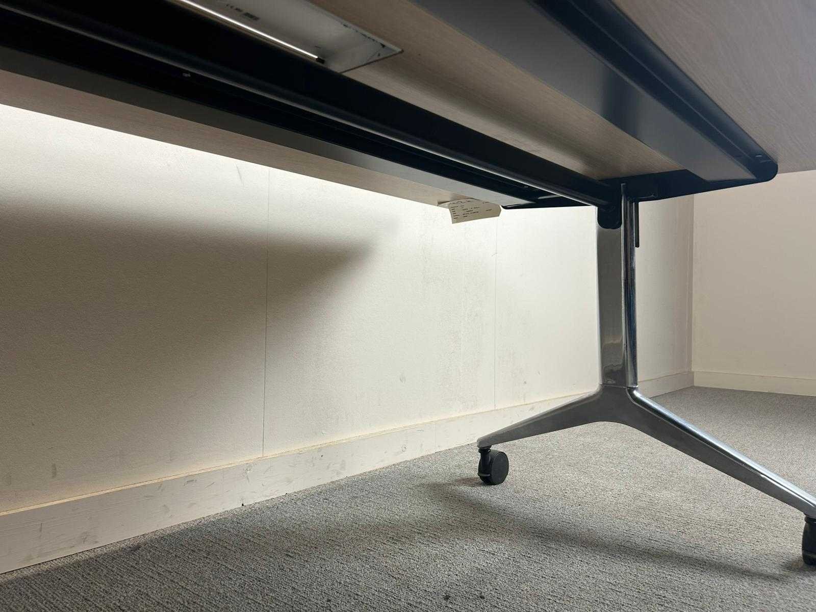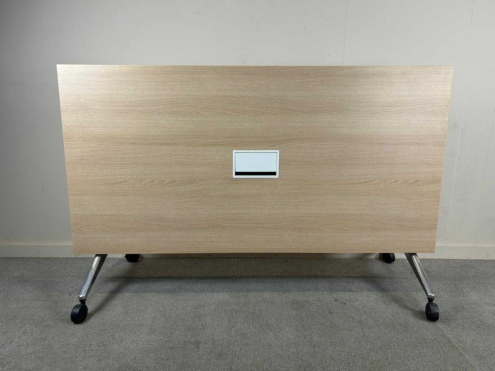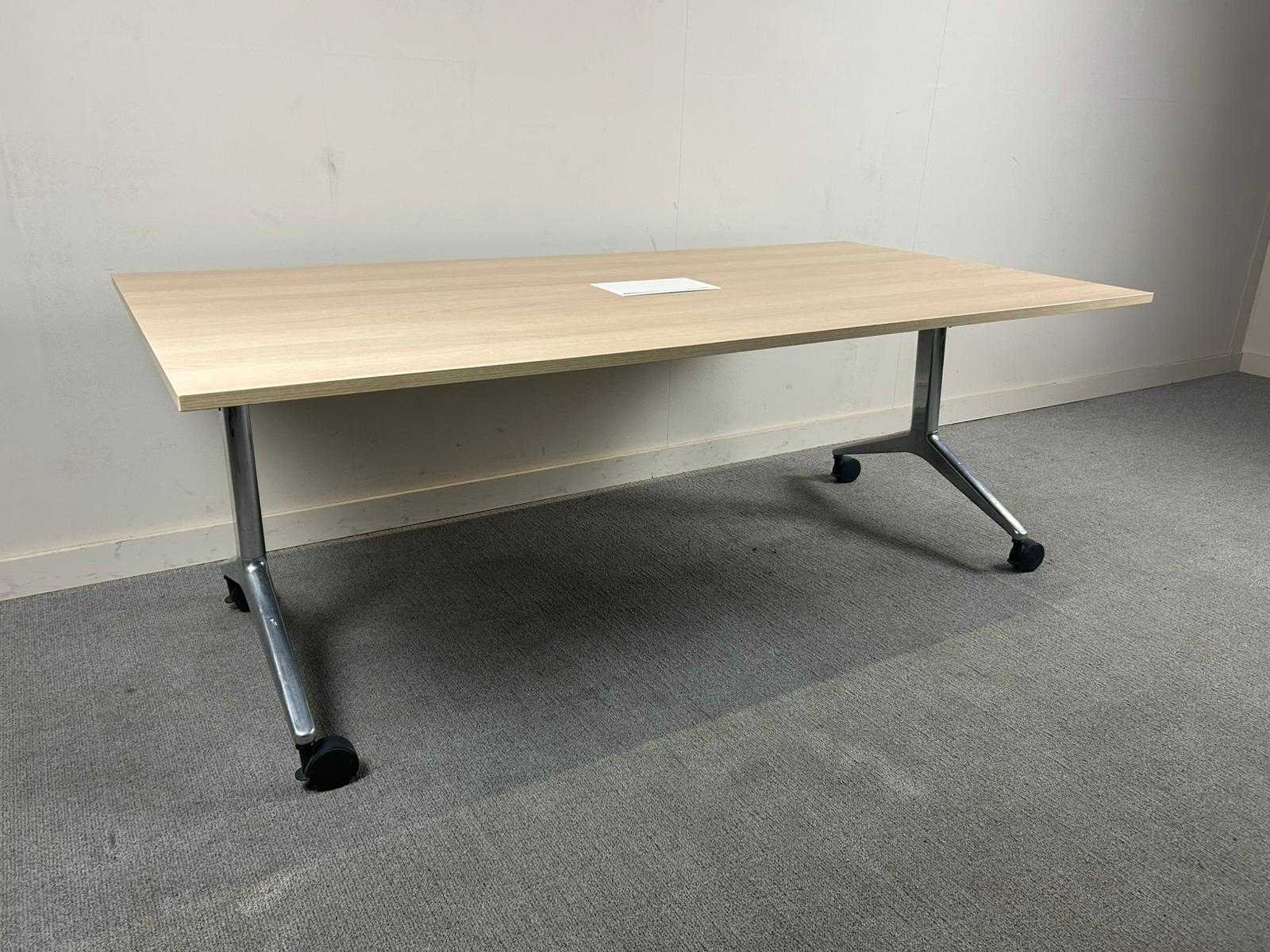 Met Y-poot frame op wielen voor mobiliteit, komt met kabeldoorvoer. Met gebruikssporen. Nee Kleur: Hout Lengte: 100cm Breedte: 200cm Hoogte: 75cm Materiaal: Melamine