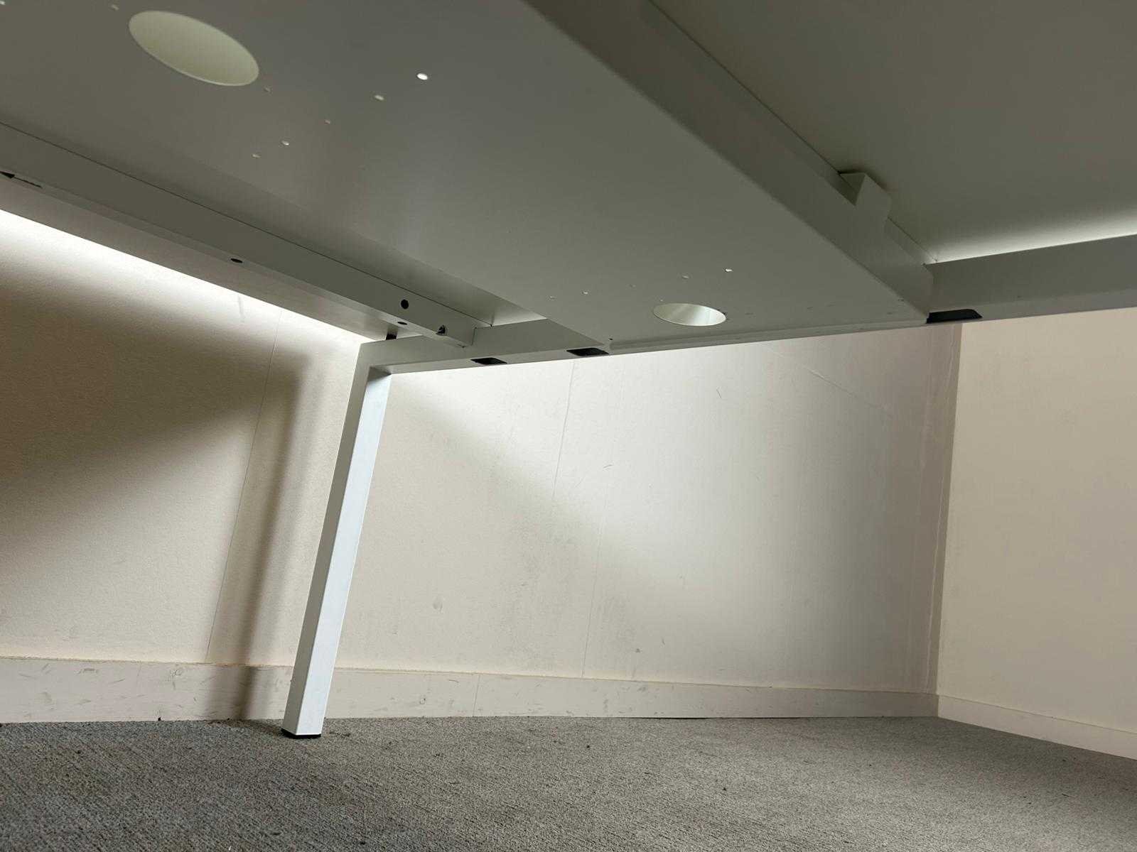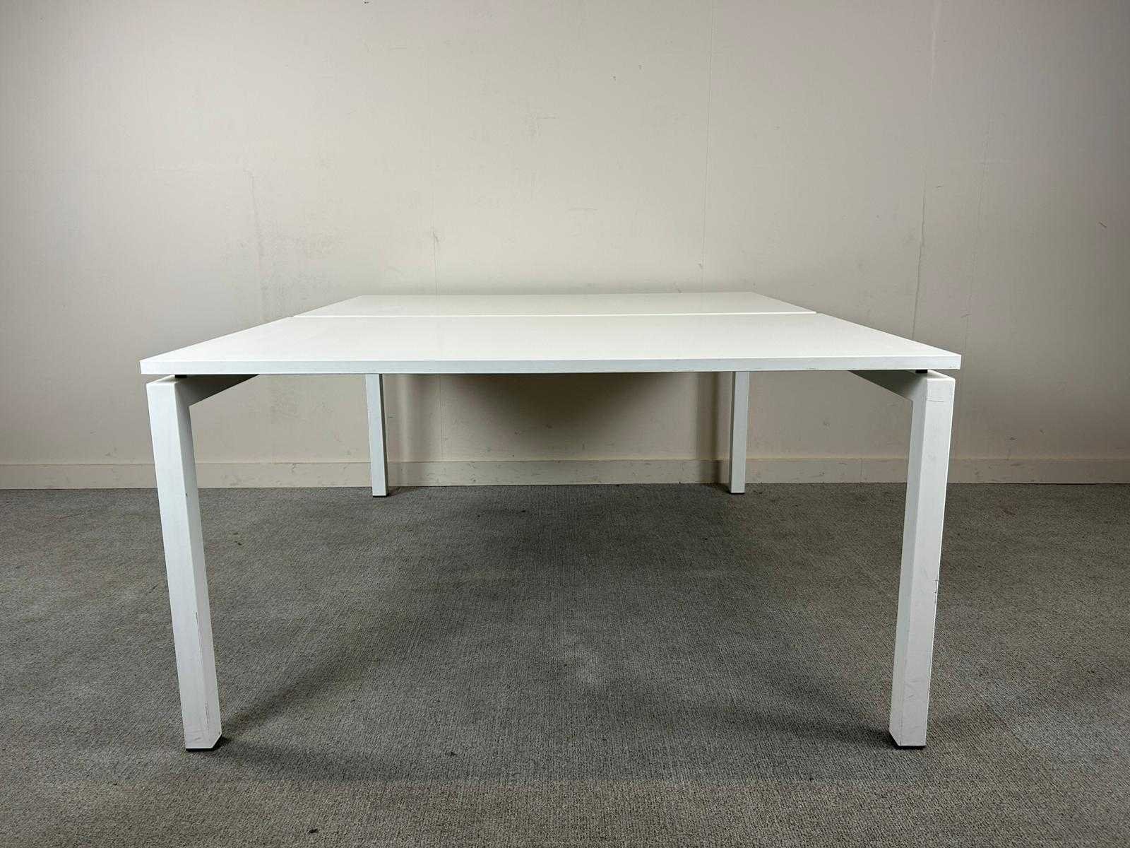 Dubbele workbench in het wit, verdeeld in 2 werkruimtes met individuele melamine bladen. Gebruikssporen aanwezig. Nee Type: 2p-Workbench Kleur: Wit Gewicht: 80kg Lengte: 165cm Breedte: 140cm Hoogte: 75cm Materiaal: Melamine