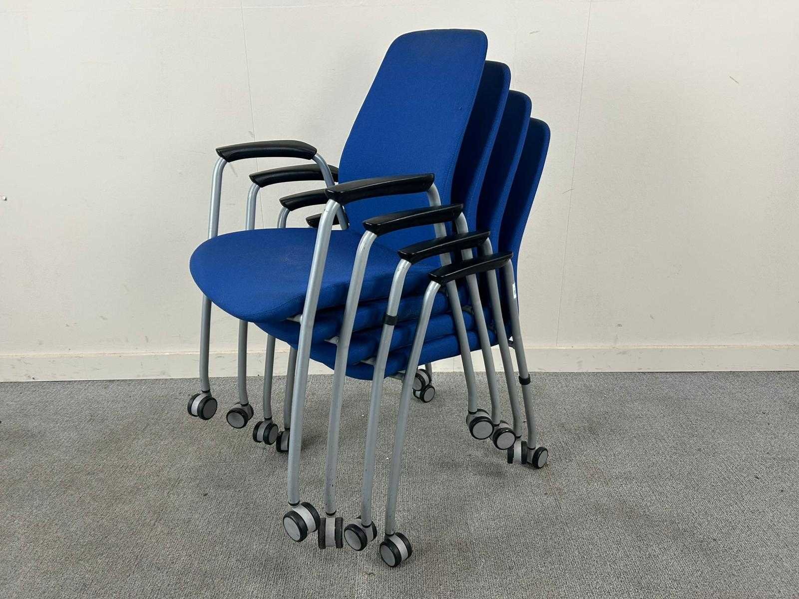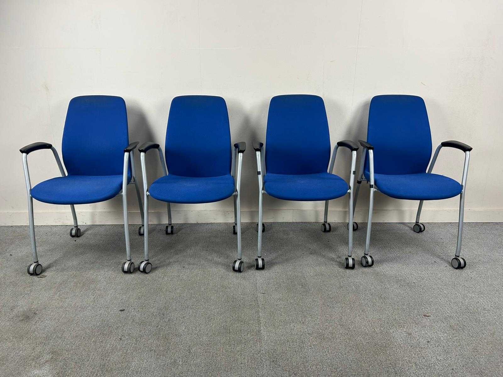 Kavel van 6 Kinnarps ontvangststoelen in blauwe stof. Uitgerust met wielen voor eenvoudige mobiliteit.Met gebruikssporen, staat kan variëren per item. Nee Merk: KINNARPS Type: Ontvangststoelen Kleur: Blauw Gewicht: 400kg Materiaal: Stof
