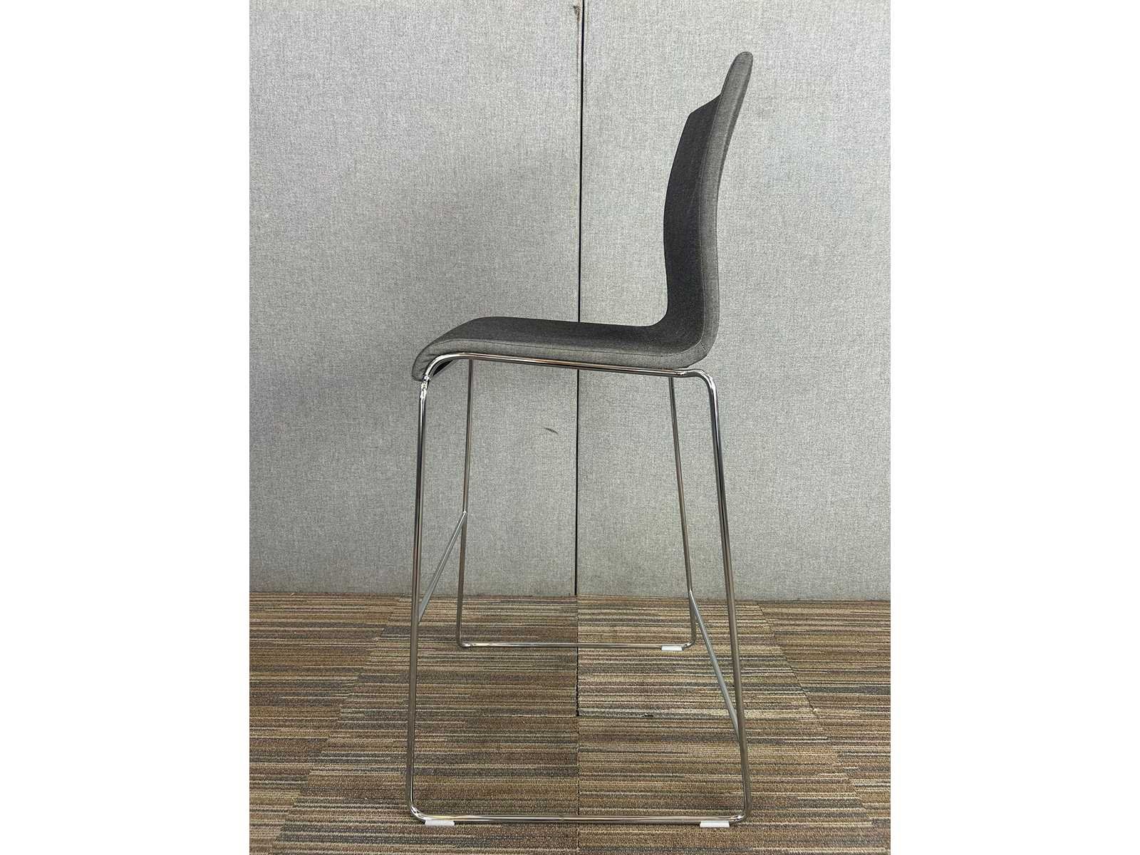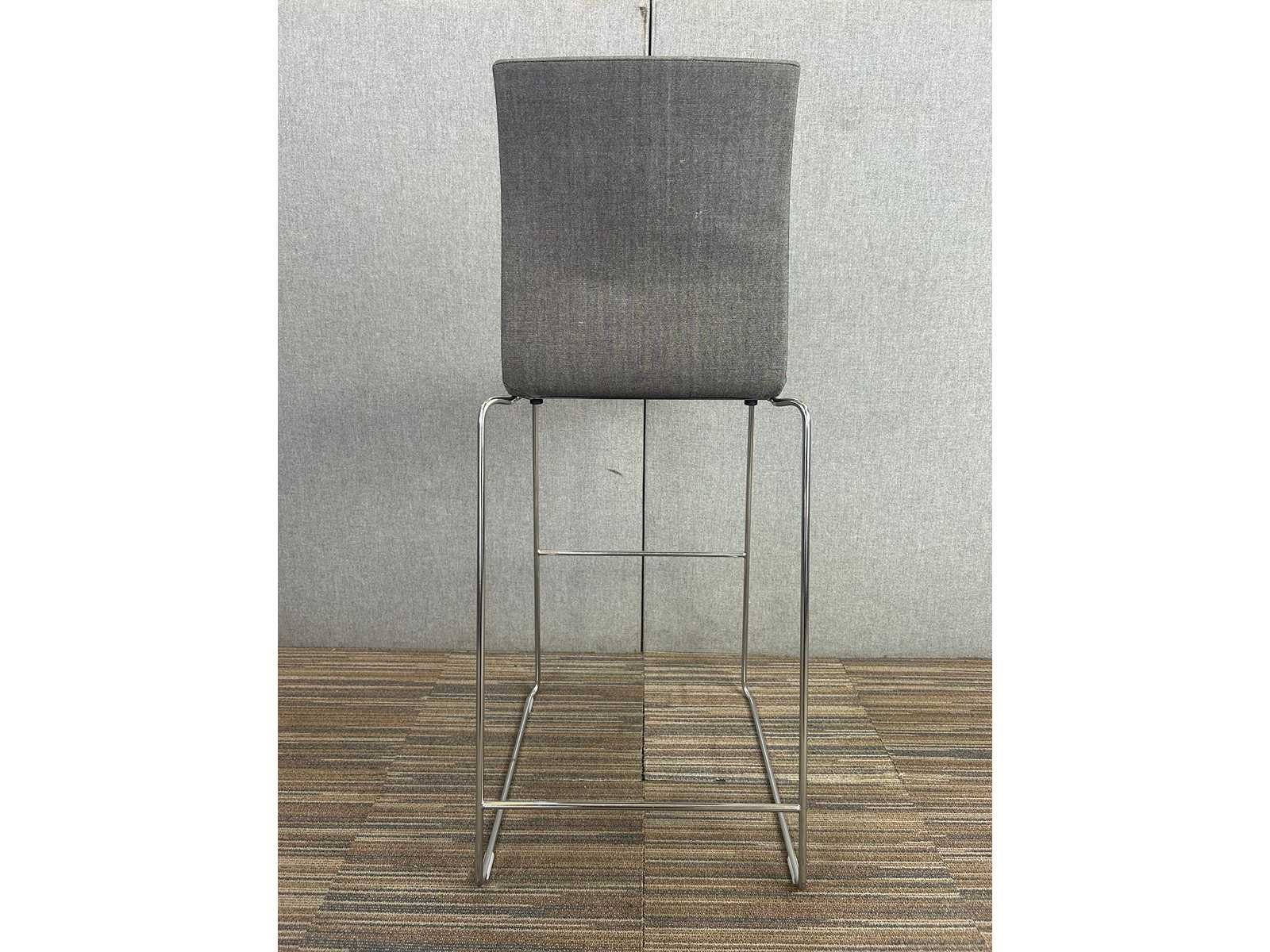 Stijlvolle Ahrend barkruk met hoge rugleuning, bekleed in grijze stof. Voorzien van een slank, verchroomd stalen sledeframe met voetensteun. Comfortabel en stevig, geschikt voor bar- of hoge overlegtafels in kantoor- en projectomgevingen. Netjes gebruikt. Nee Merk: AHREND Kleur: grijs Materiaal: textiel