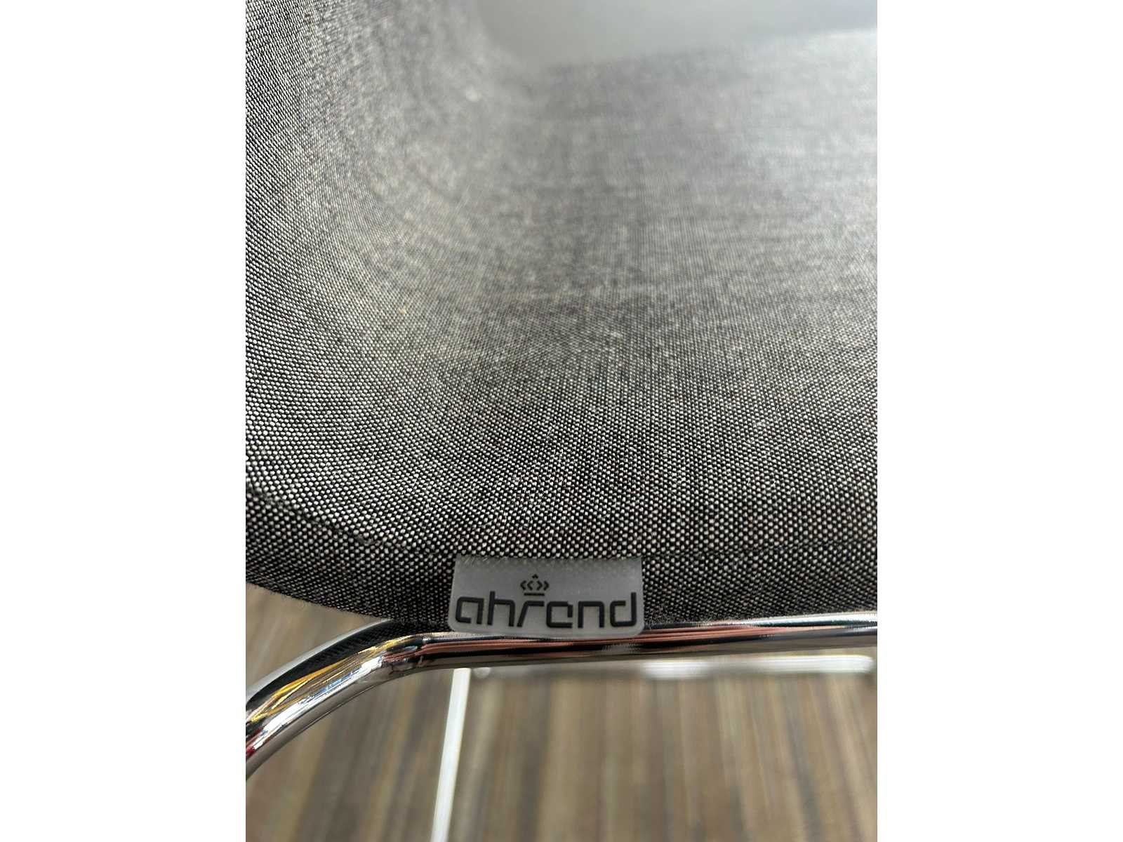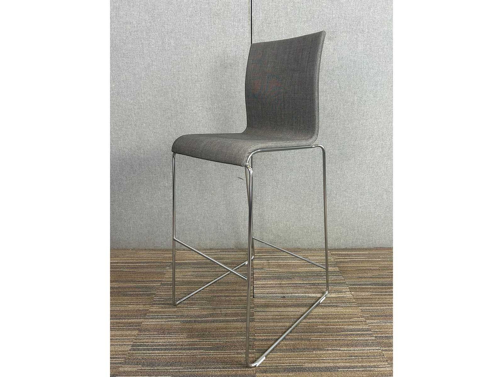 Stijlvolle Ahrend barkruk met hoge rugleuning, bekleed in grijze stof. Voorzien van een slank, verchroomd stalen sledeframe met voetensteun. Comfortabel en stevig, geschikt voor bar- of hoge overlegtafels in kantoor- en projectomgevingen. Netjes gebruikt. Nee Merk: AHREND Kleur: grijs Materiaal: textiel