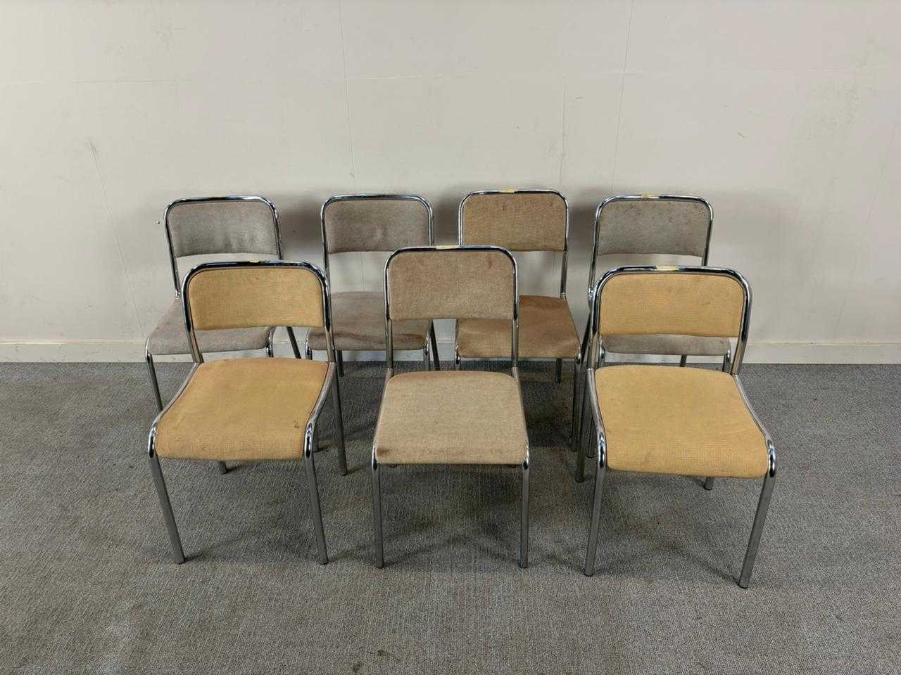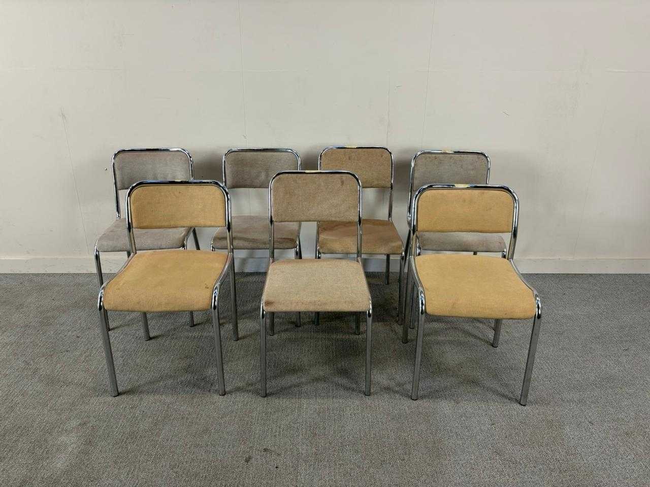 Set van 7 kantinestoelen in beige stof op chroom vierpoot. Vintage. duidelijke gebruiksporen, voor herstoffering. Nee Product type: Kantinestoel Kleur: Beige
