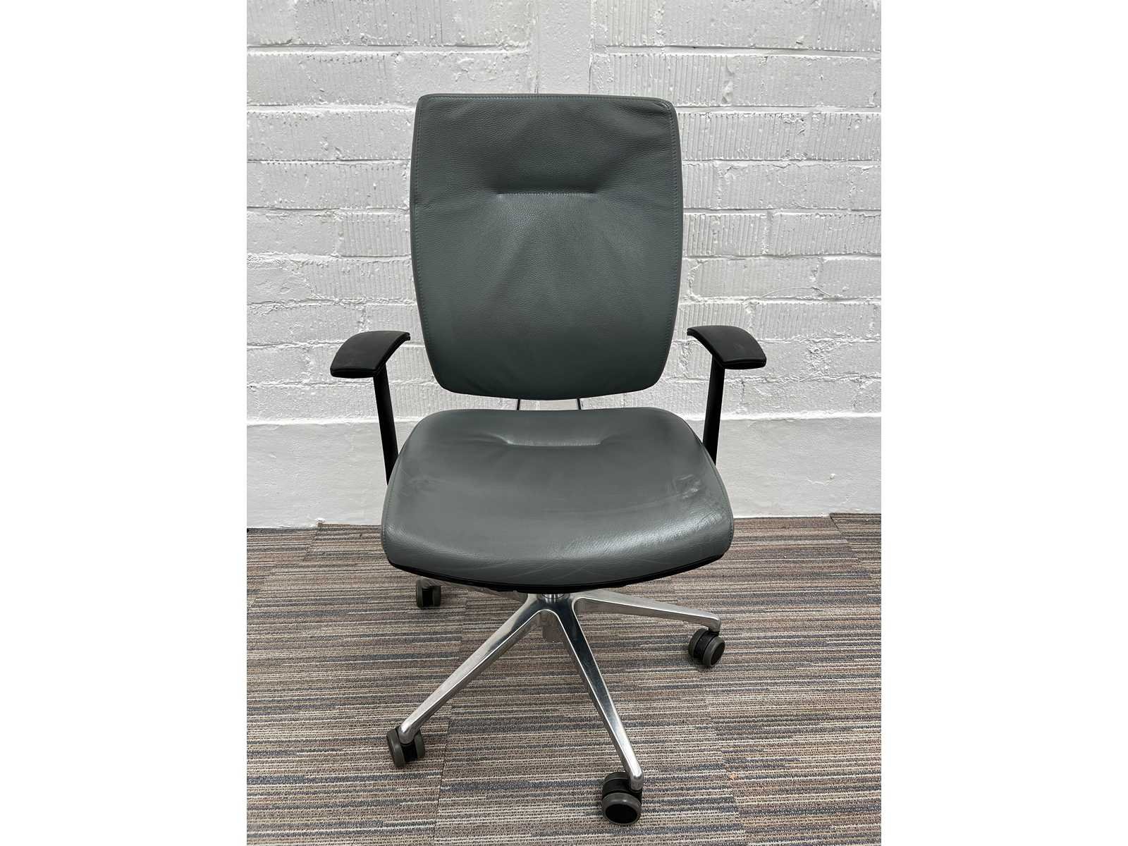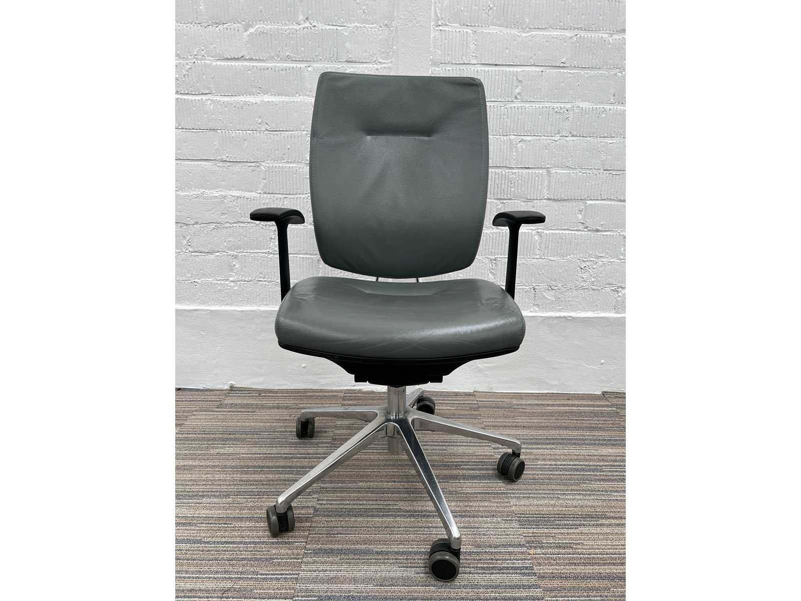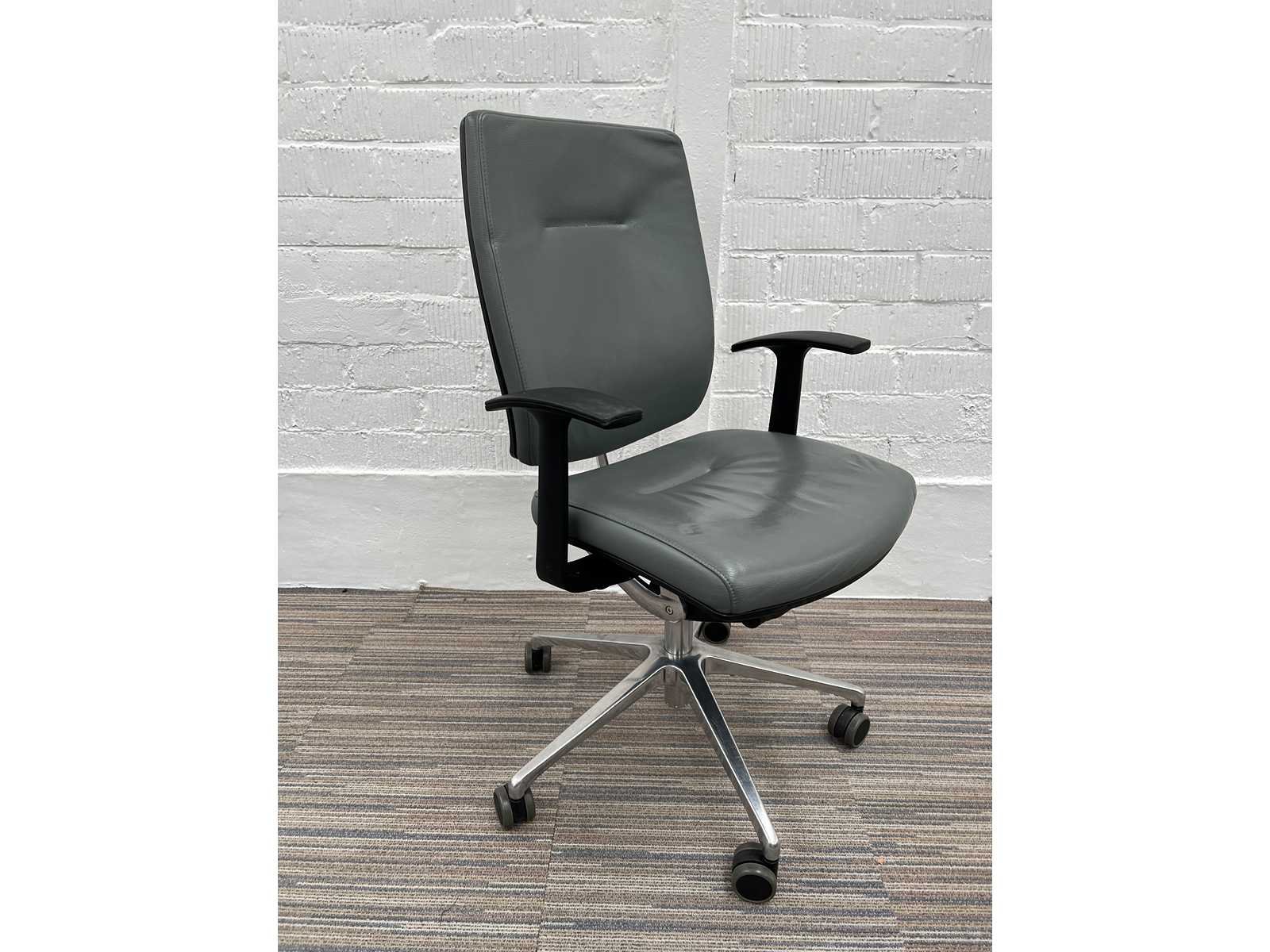 SITLAND Arte's Vergaderstoel - Grijs Leer / Gepolijst Alu Voetkr mt wielen Merk: SITLAND Model / Gamma: Arte's Nieuw / 2de Hands: 2de Hands Staat vh product: ** (Normale gebruikssporen) Soort detail: Vergaderstoel Materiaal Bekleding: Leder Kleur: Grijs Soort onderstel: Voetkruis met wielen Materiaal onderstel: Gepolijst Alu Zithoogte verstelbaar: Ja Zitvlak in diepte verstelbaar: Neen Lendesteun verstelbaar: Ja Rugleuning kantelbaar: Ja Rugleuning weerstand instelbaar: Ja Rugleuning in hoogte verstelbaar: Neen Freefloat / Synchroonmechanisme: Neen Armsteunen: Vast - Opmerkingen: krassen op de armpads Nee Merk: SITLAND Type: Arte's Kleur: grijs Gewicht: 20kg