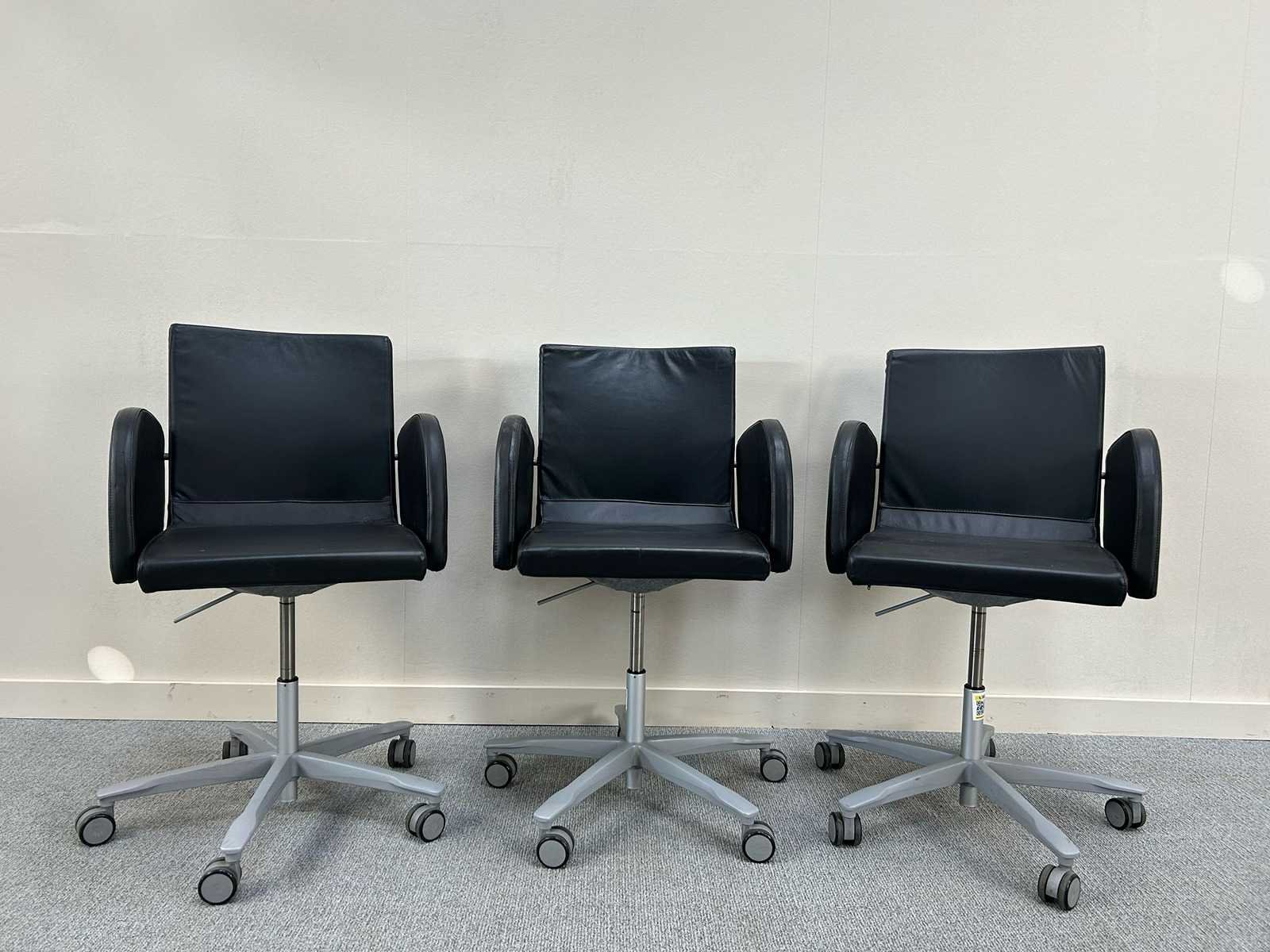 Set van 3x Bureaustoelen – Zwart (Kunstleer) Set van drie bureaustoelen in zwart kunstleer met metalen voetkruis en wielen. Comfortabele en praktische stoelen, geschikt voor kantoor- of projectomgevingen. Met gebruikssporen en lichte verzadiging op bepaalde oppervlakken, exacte staat kan variëren bij afhaling. Nee Kleur: Zwart Gewicht: 45kg Materiaal: leder