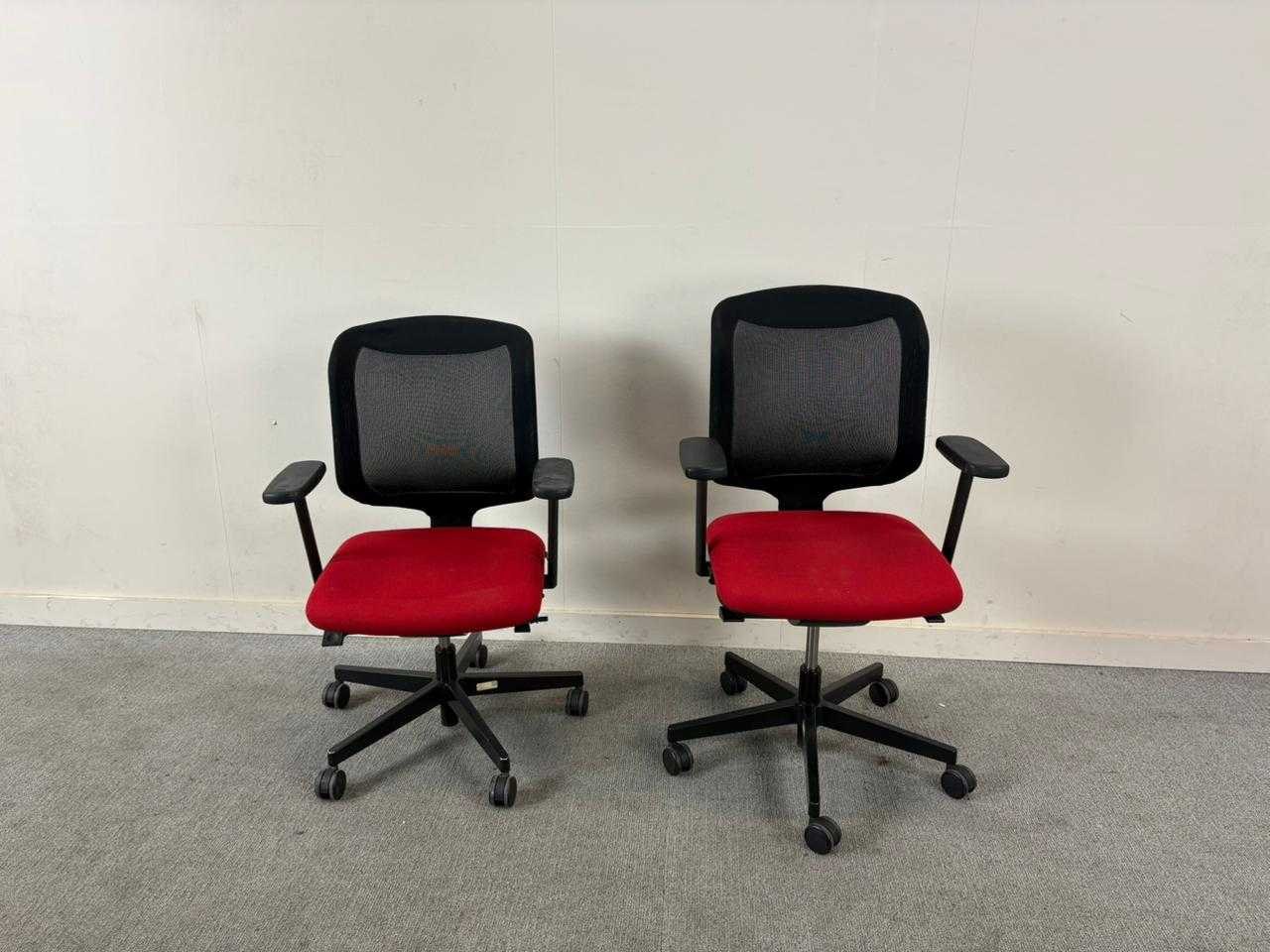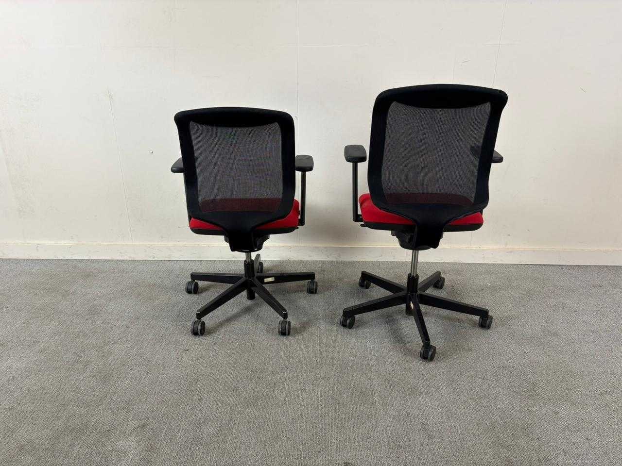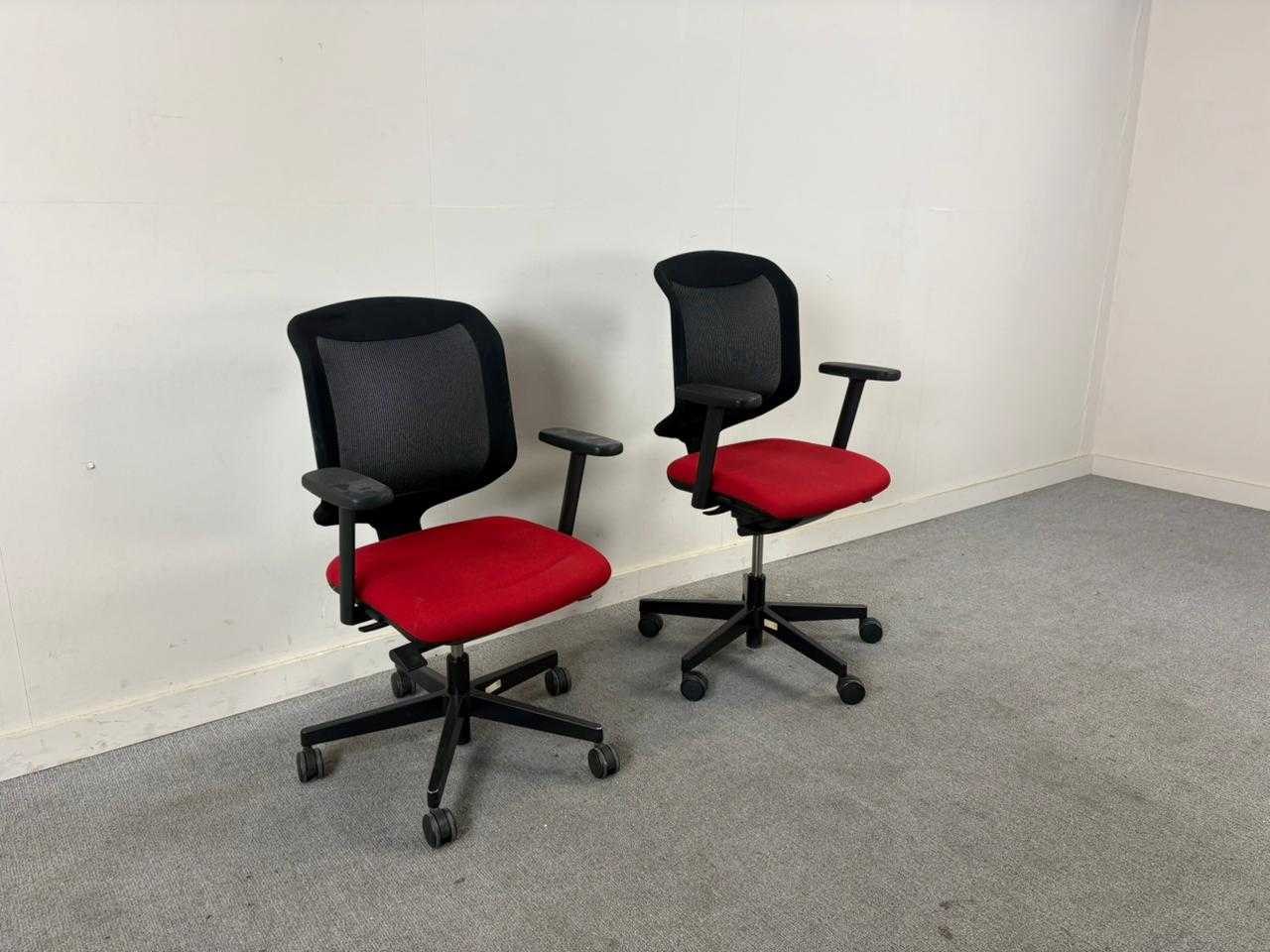 Set van 2 rode Giroflex bureaustoelen op voetkruis op wielen met mesh rugleuning. Met gebruikssporen, staat kan variëren Nee Merk: GIROFLEX Kleur: Rood Gewicht: 40kg Materiaal: Stof
