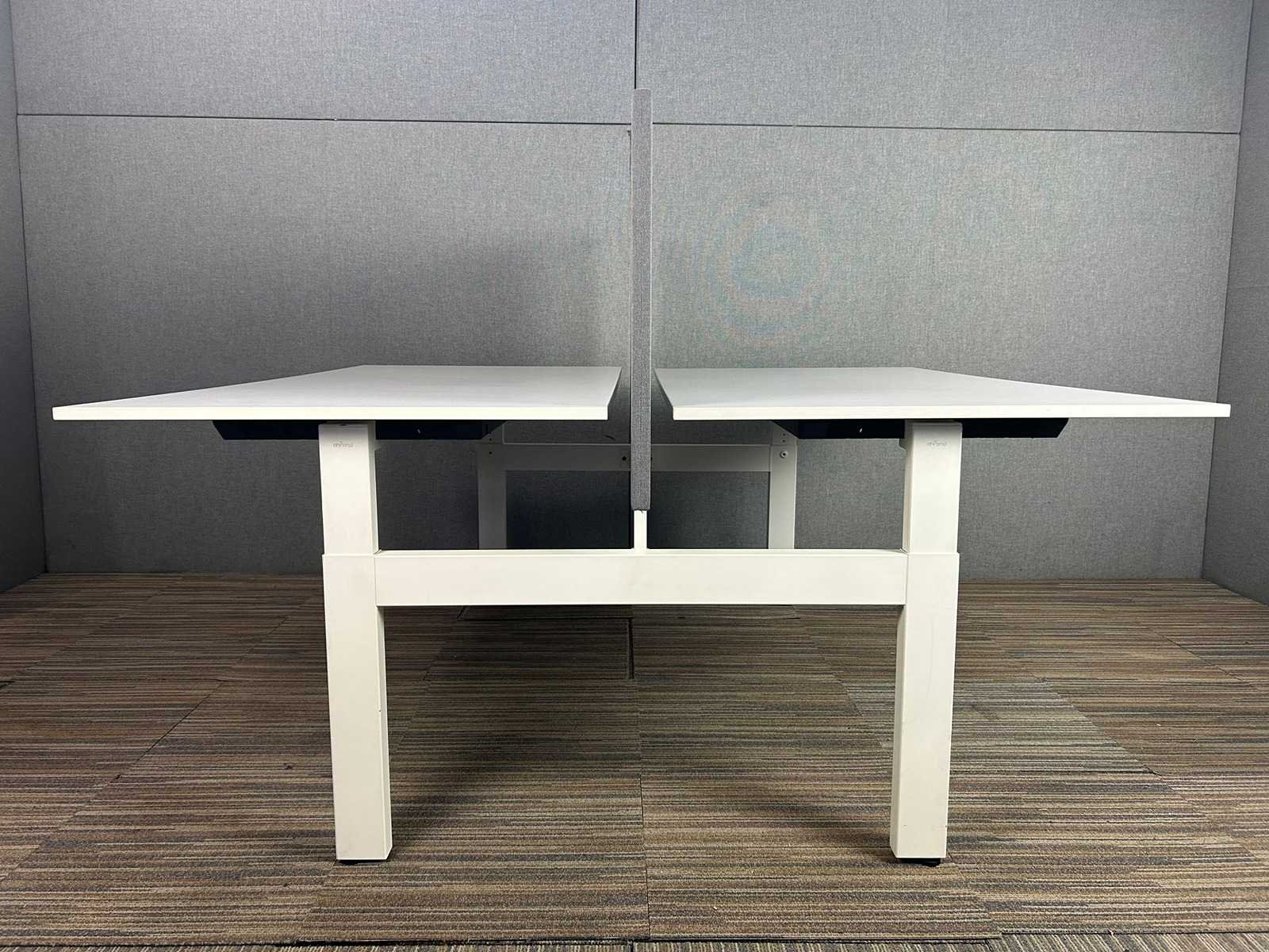 Modern duo bureau in bench-opstelling, uitgevoerd met twee afzonderlijke manueel verstelbare werkplekken. Voorzien van een wit werkblad en een stabiel metalen onderstel in bijpassende kleur. In het midden is een akoestisch scheidingspaneel geplaatst voor extra focus en privacy. Ideaal voor open kantooromgevingen en flexwerkplekken. Nee Merk: AHREND Type: Dubbele werkplaats Model: For Duo Kleur: wit Gewicht: 50kg Lengte: 160cm Breedte: 160cm Hoogte: 62-86cm Materiaal: melamine/metaal