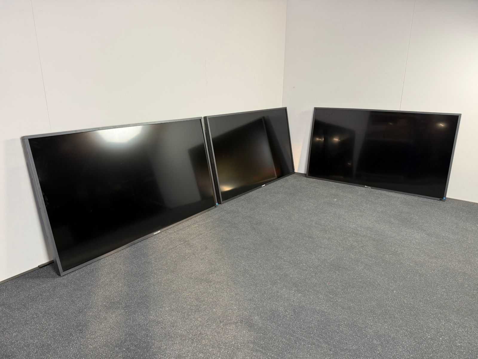 Set van 3x Philips Beeldschermen – 125 × 72 × 7 cm Set van drie Philips schermen met afmetingen ca. 125 × 72 × 7 cm. Niet getest en geleverd zonder stroomkabel of afstandsbediening. Geschikt voor onderdelen, herstel of hergebruik in een technische omgeving. Met gebruikssporen, exacte staat kan variëren bij afhaling. Nee Breedte: 125cm Hoogte: 72cm