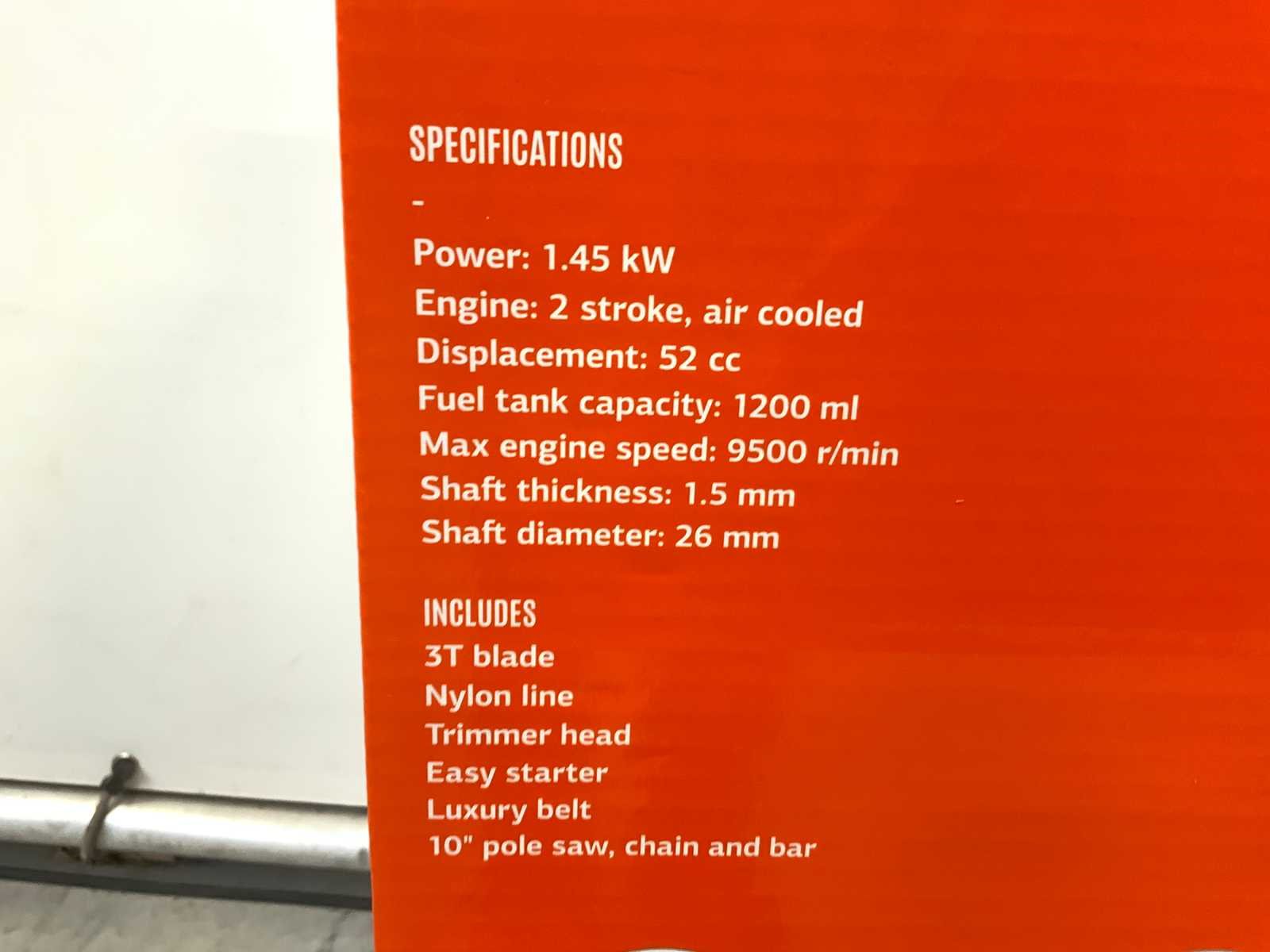 Power 1.45kw; 2 takt; 52cc; tankcapaciteit 1200ml; Max 9500 rpm; shaft thickness 1.5mm; shaft diameter 26mm; 3T blade; nylon trimmer; trimmer head; easy starter; belt; 10" pole saw, chain and bar; Nee Merk: Daewoo Product type: DAMTX520 Kleur: grijs