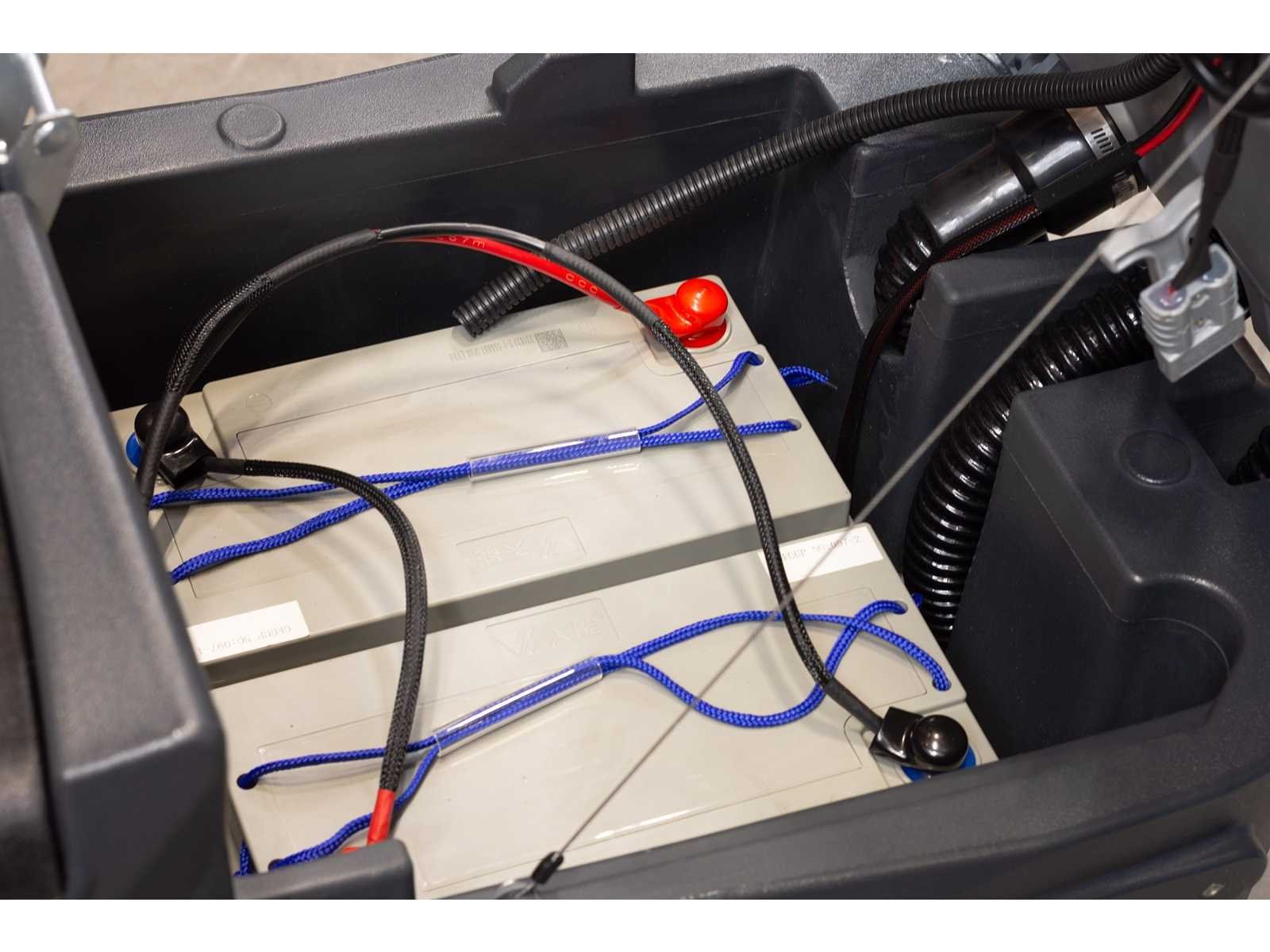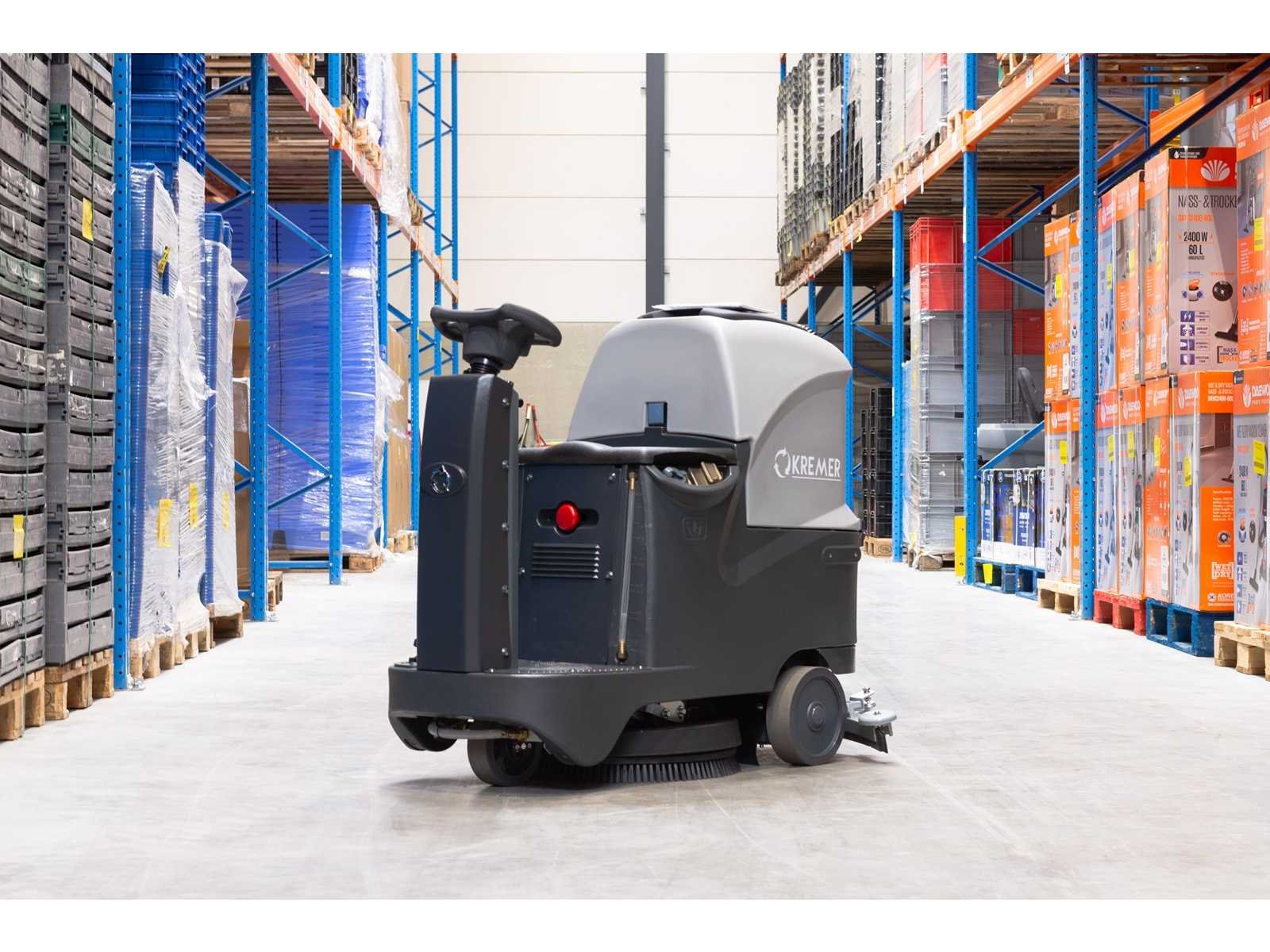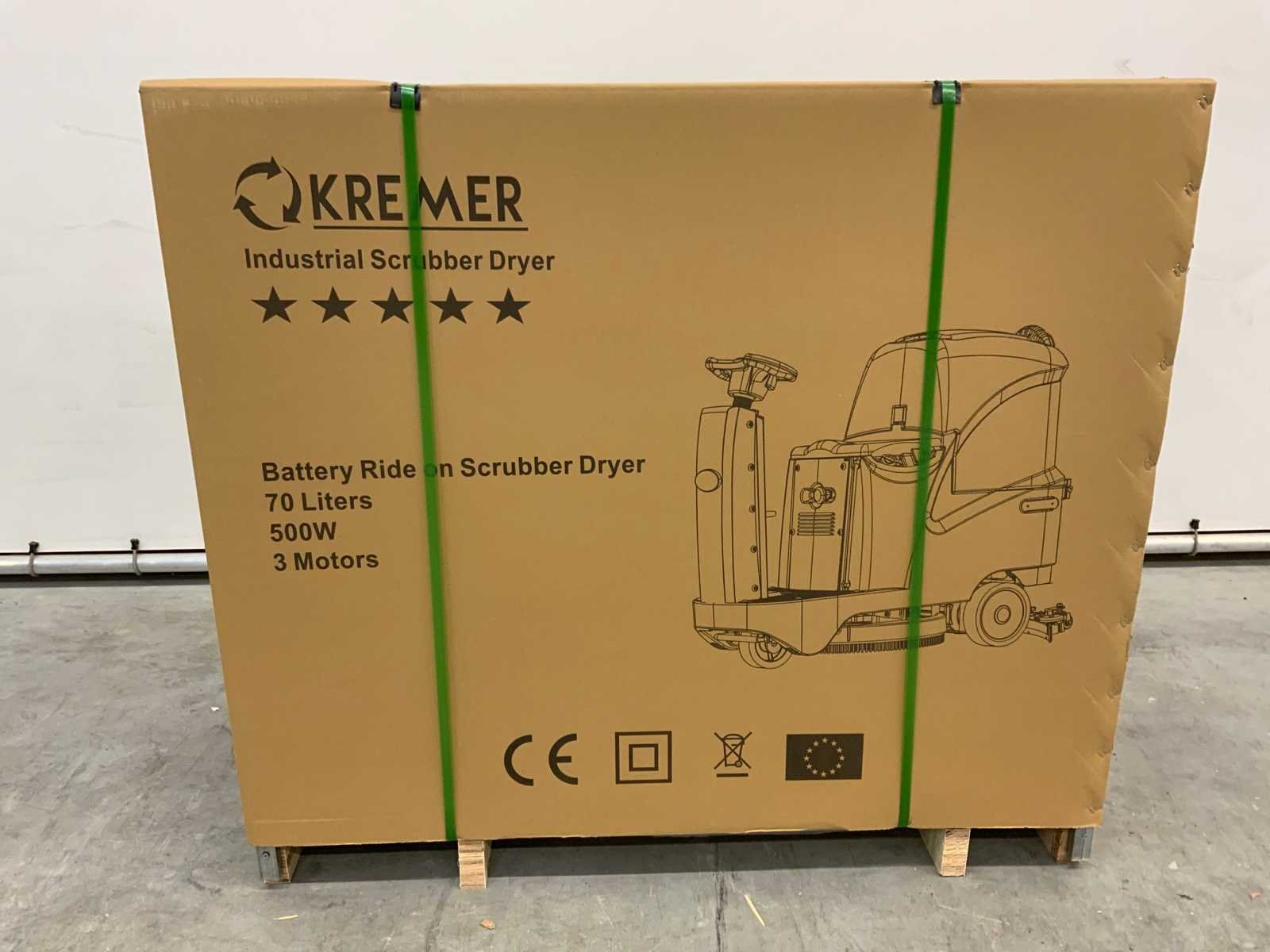 Batteries: 2 x 12 V, 100 Ah; Brush Speed: 170 rpm; Suction / Brush motor power: 500 W; Driving motor power: 300 W; Running Speed: 5.5km/h max; Recovery tank capacity: 50 L; Solution tank capacity: 50 L; Efficiency: 4500 m²/h; Brush diameter: 560 mm; Suction width: 800 mm; Cleaning width: 560 mm; 4866 Nee Merk: Kremer Type: KR-FR70 Bouwjaar: 2025 Werkbreedte: 560mm Elektrisch: true Afgelezen urenstand: 0hr Accu lader: true Eigen gewicht: 220kg Totale afmeting L: 1310mm Totale afmeting Breedte: 620mm Totale afmeting Hoogte: 1080mm