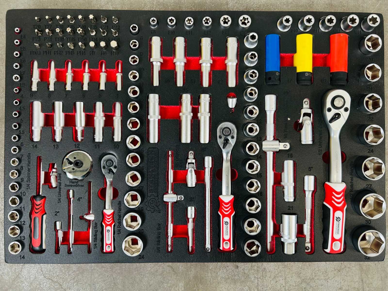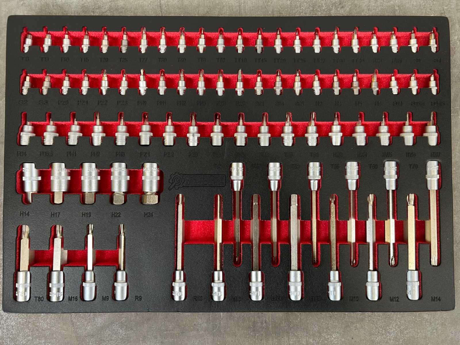 Ongebruikt; gereedschap in plastic verpakt; 12-delig tangenset; 13-delig hamerset; 14-delig meetset; 36-delig slagmoersleutel set; 21-delig sleutels met T-greep; 41-delig schroevendraaierset; 29-delig combinatiesleutels; 12-delig ringsleutels; 125-delig doppenset; 84-delig bitjes set; 7483 Nee Merk: Stahltech Type: 387-delig Lengte: 148cm Breedte: 52cm Hoogte: 110cm