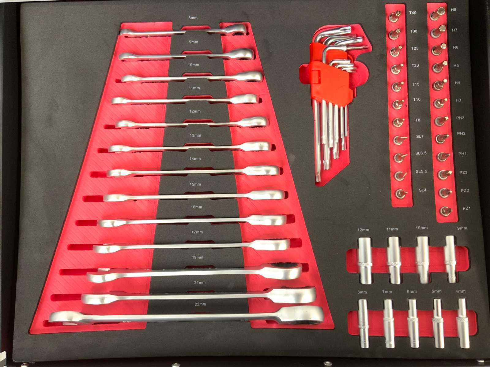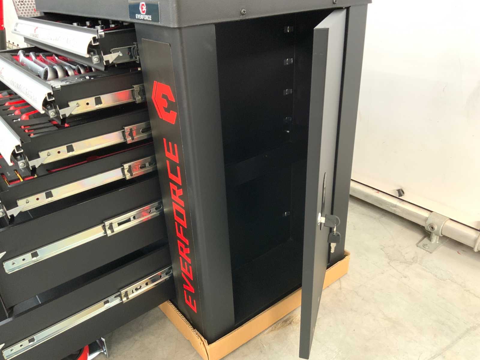 4 laden gevuld; verrijdbaar; afsluitbaar; lade 1 Doppenset 1/2” en 1/4” 4 tot en met 32 en toebehoren; Lade 2 steek ringsleutelset 8 tot en met 22 torx imbusset bitjes; lade 3 schroevendraaiers en imbusset; lade 4 tangen, hamer, pendrijvers; lade 4 & 5 zijn leeg voor opslag; 5769 Nee Merk: Everforce Aantal laden: 6 Met inhoud: true Totale afmeting L: 840mm Totale afmeting Breedte: 460mm Totale afmeting Hoogte: 830mm