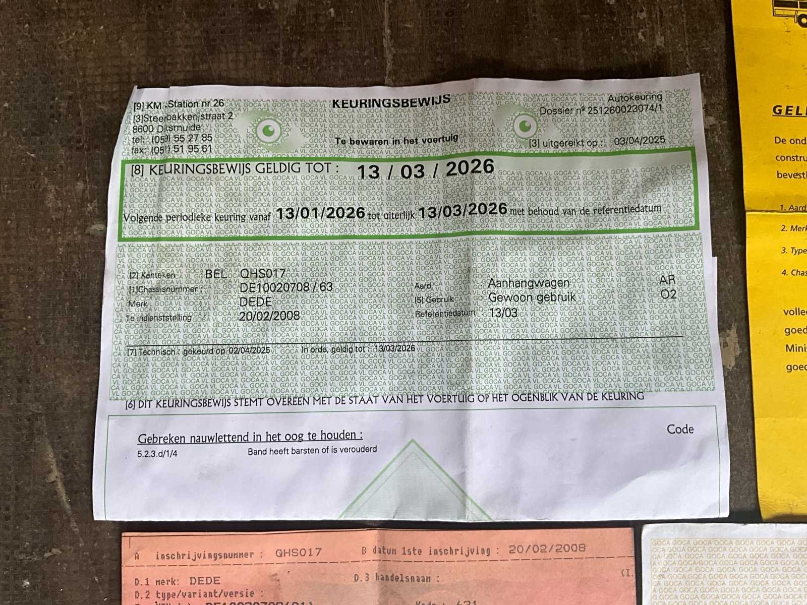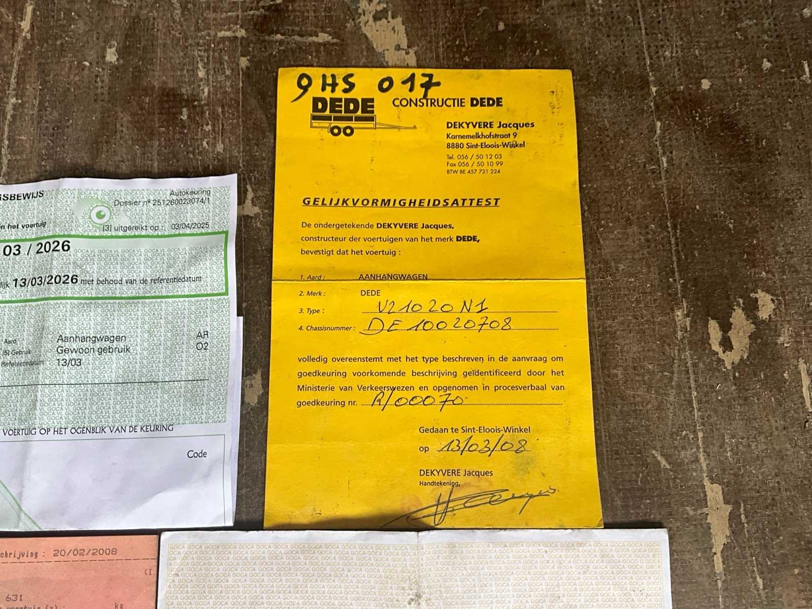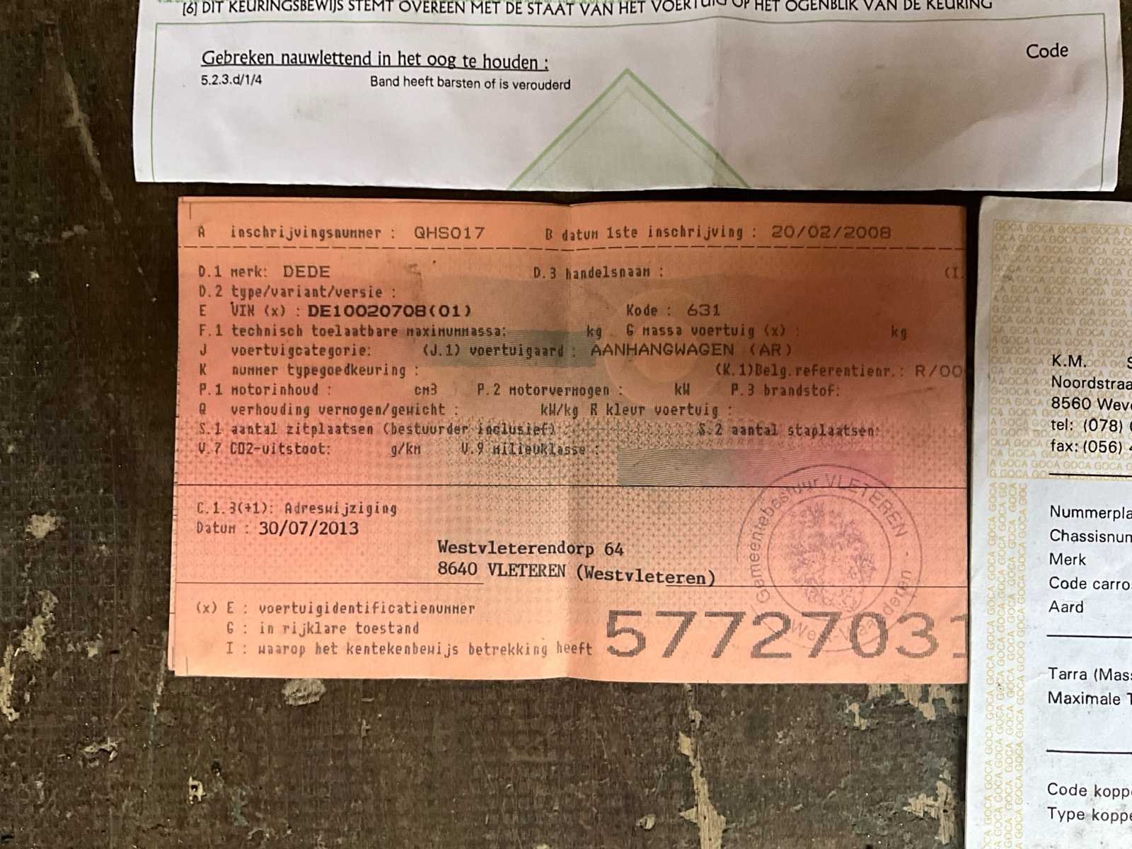 No Merk: Dede Bouwjaar: 2008 Chassisnummer: DE10020708 Aantal assen: 2 Laadbak afmeting l: 350cm Laadbak afmeting b: 170cm Datum eerste toelating: 20/02/2008 Hoogte: 215cm Nationaliteit documenten: Belgie