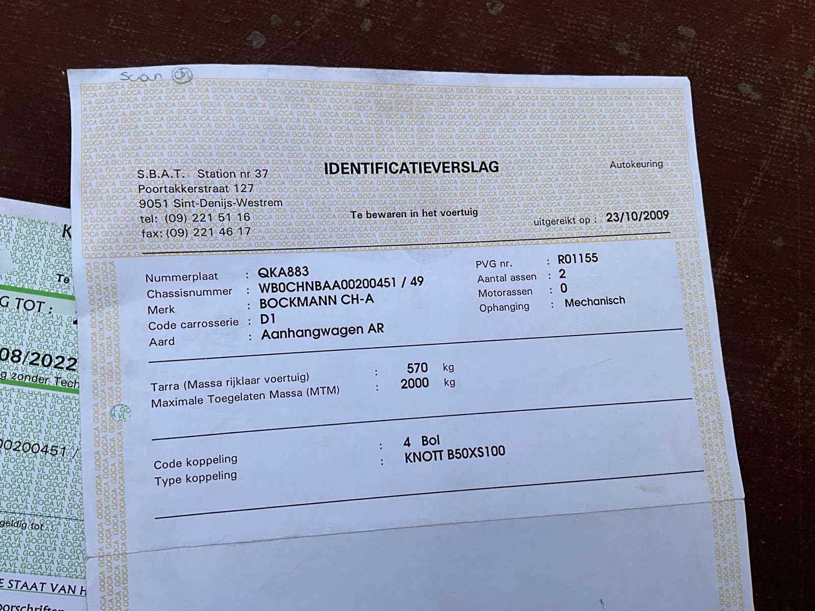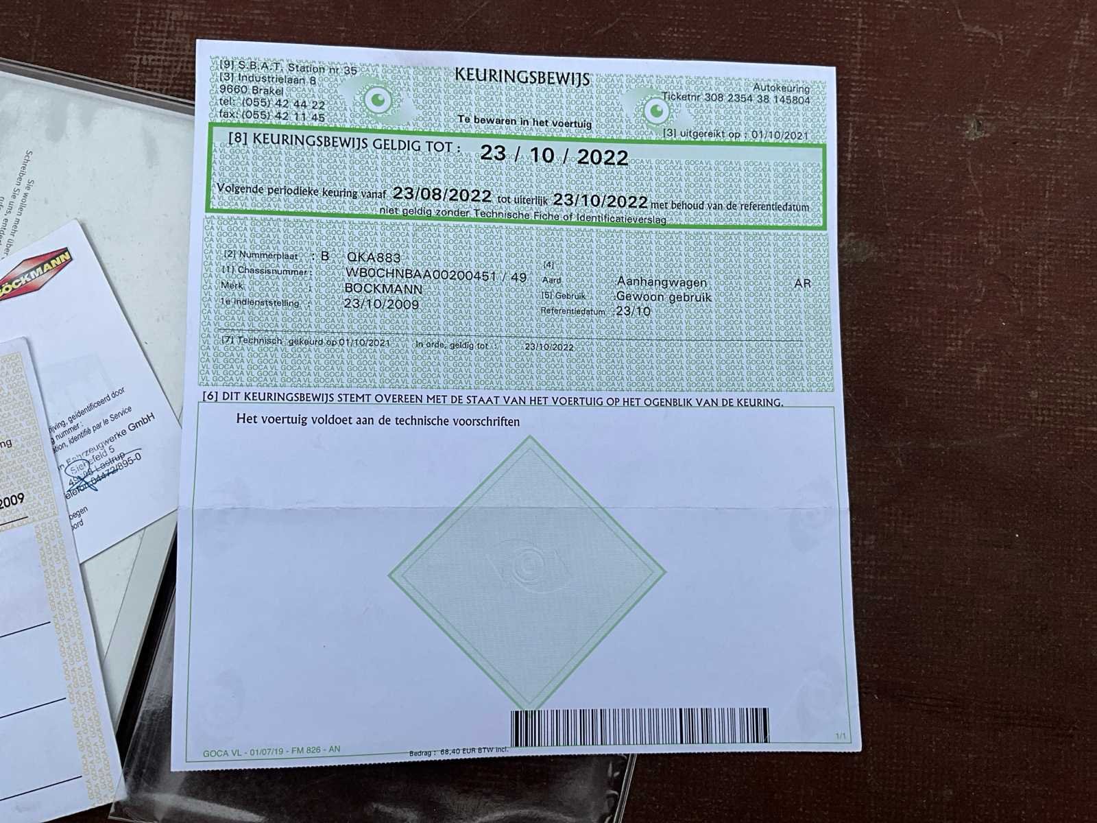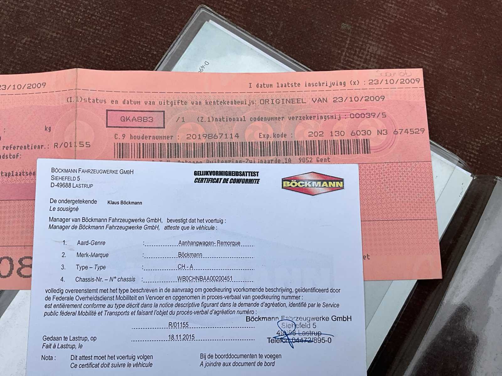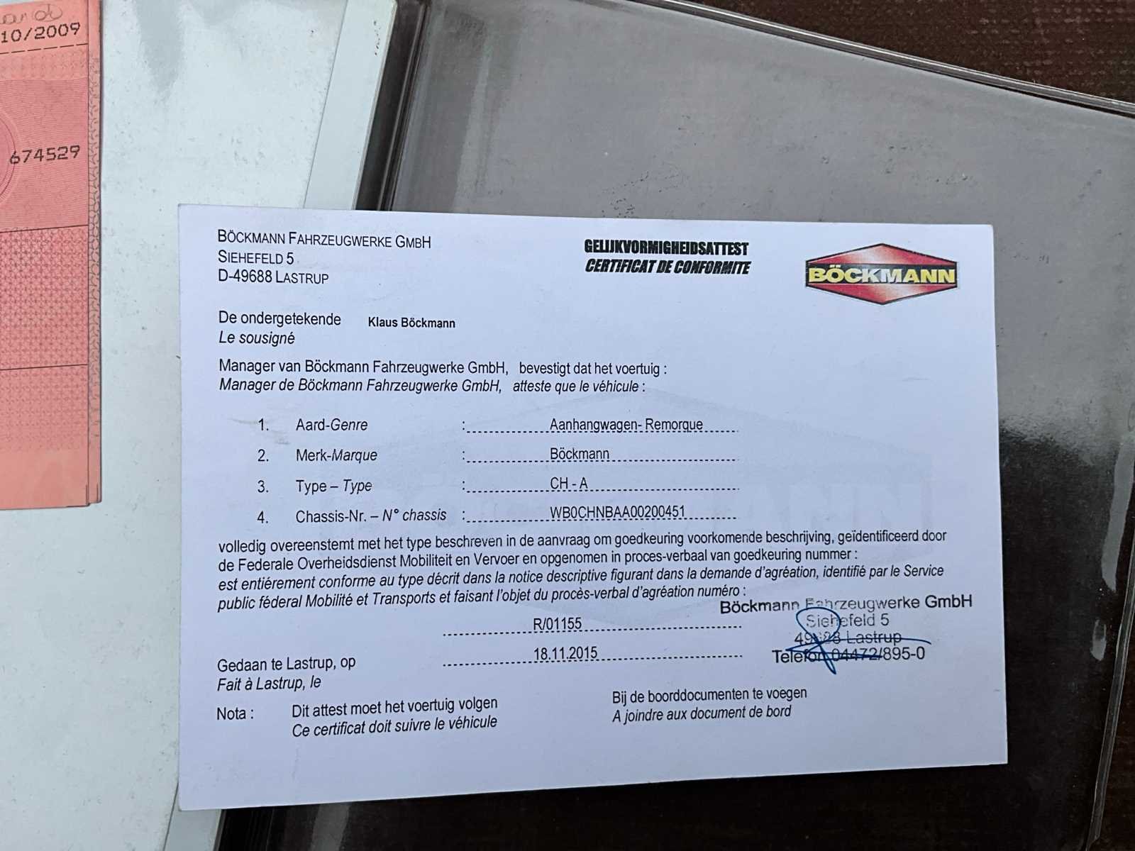 Nee Merk: Böckmann Type: CH-A Bouwjaar: 2009 Chassisnummer: WBOCHNBAA00200451 Laadbak afmeting l: 377cm Laadbak afmeting b: 187cm Datum eerste toelating: 23/10/2009 Nationaliteit documenten: Belgisch