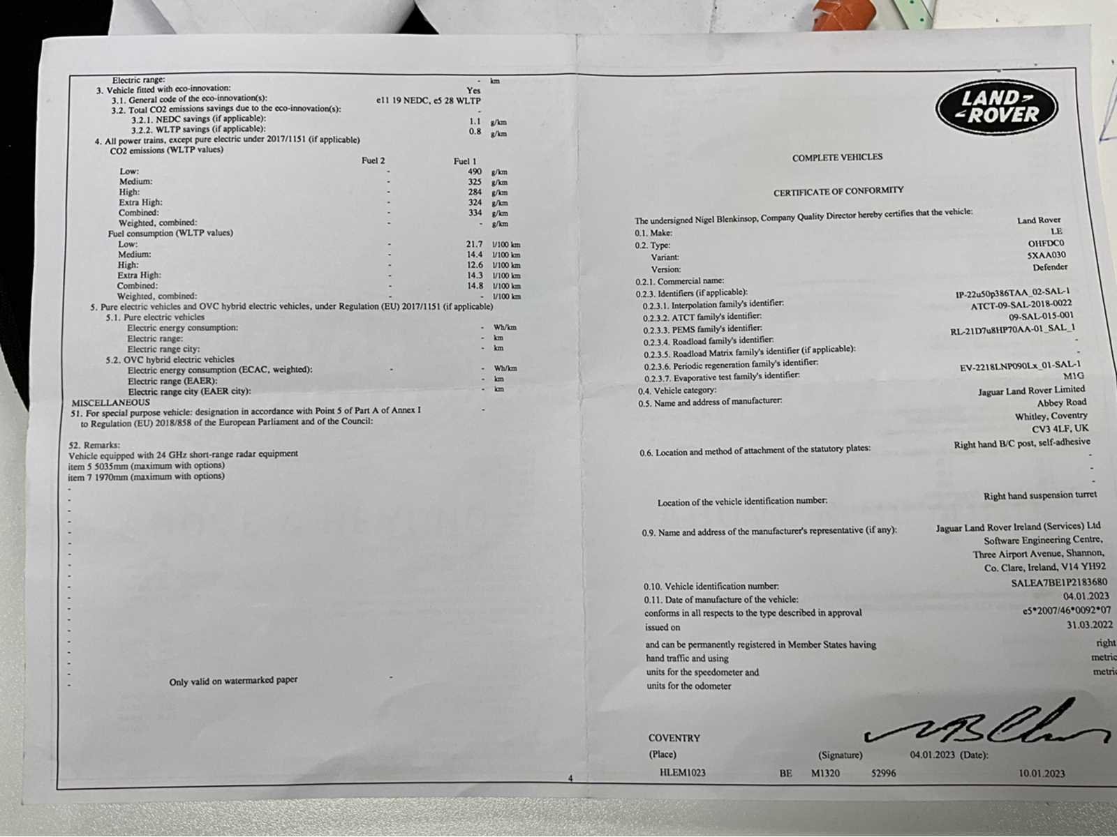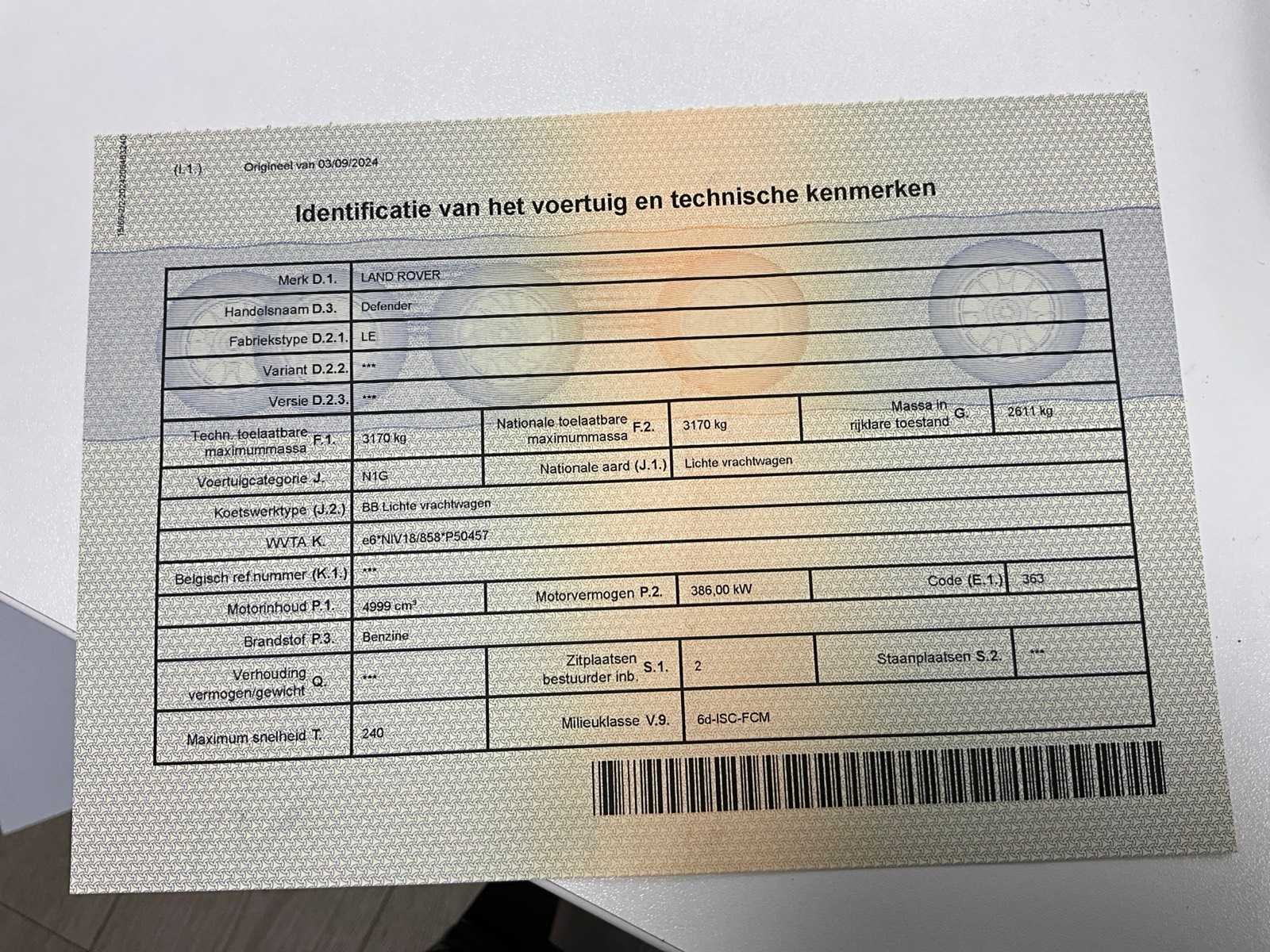 Nee Merk: Land Rover Model: Defender Bouwjaar: 2023 Afgelezen kilometerstand: 55594km Cilinderinhoud: 4999cc Vermogen (kW): 386kW Brandstof: benzine Chassisnummer: SALEA7BE1P2183680 Datum eerste toelating: 31/01/2023 Aantal zitplaatsen: 2 Transmissie: Automaat Emissieklasse: Euro 6d Aantal deuren: 5 Nationaliteit documenten: Belgisch Start en rijdt: Ja startinformatie : Start & rijdt Vavato voert geen technische keuring uit.: true Airconditioning: true Navigatie: true Inschrijvingsbewijs - deel 1 : Aanwezig Inschrijvingsbewijs - deel 2: Aanwezig