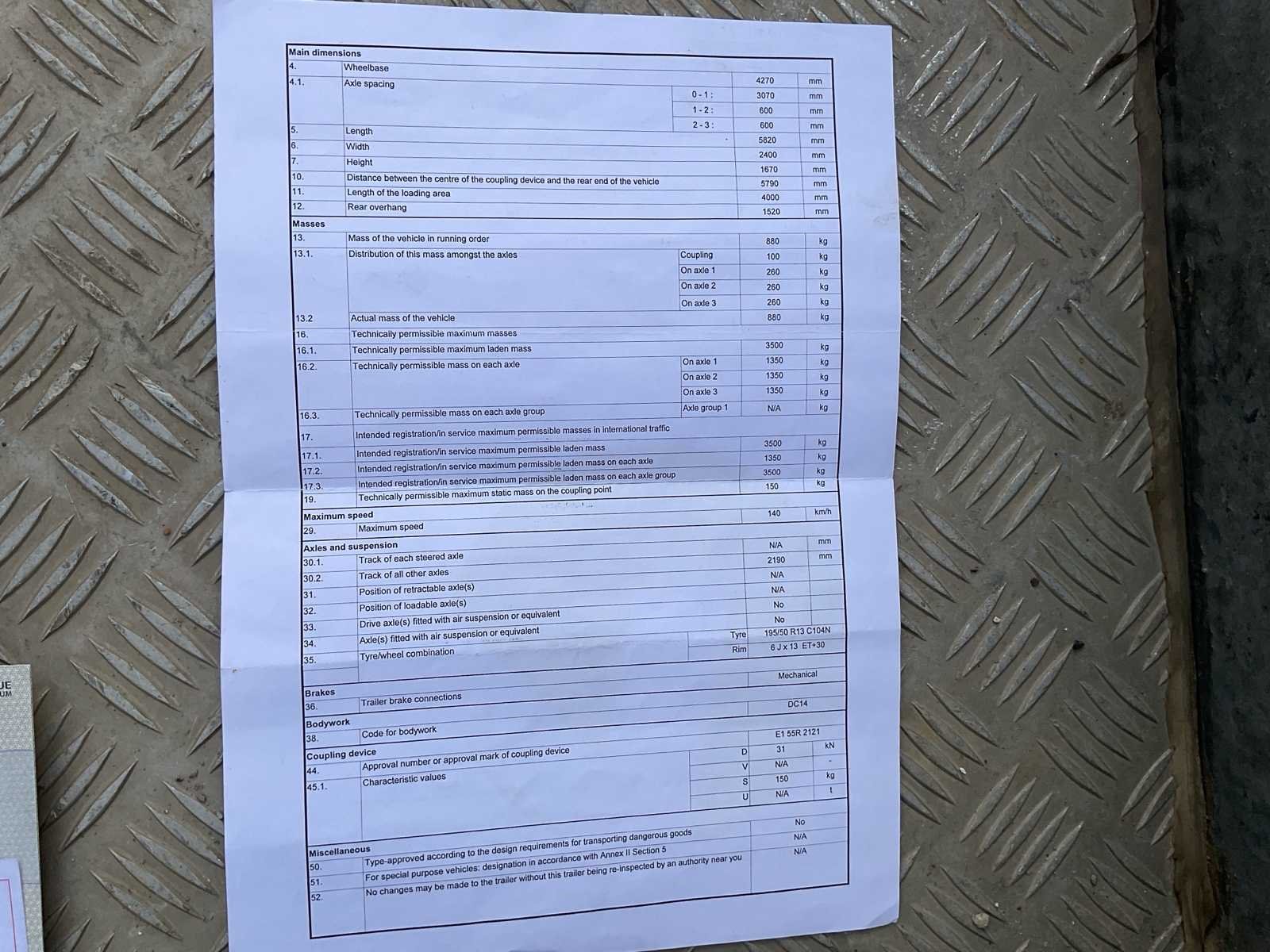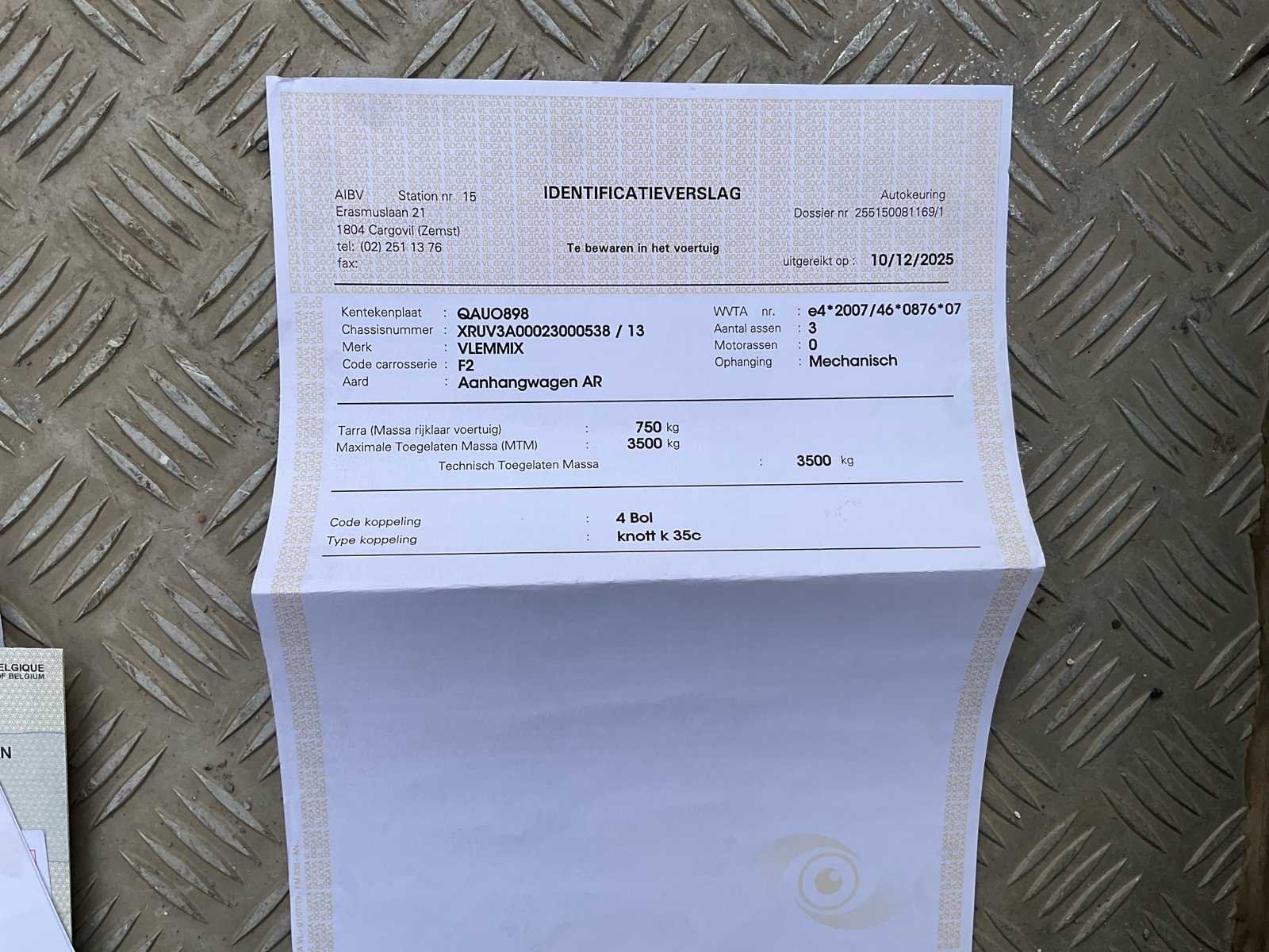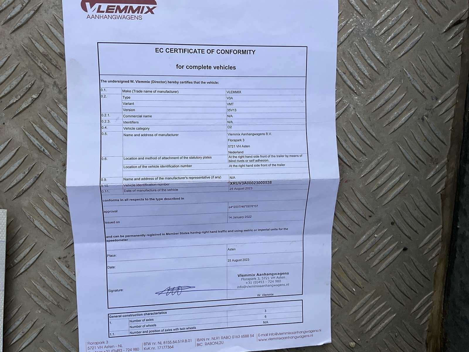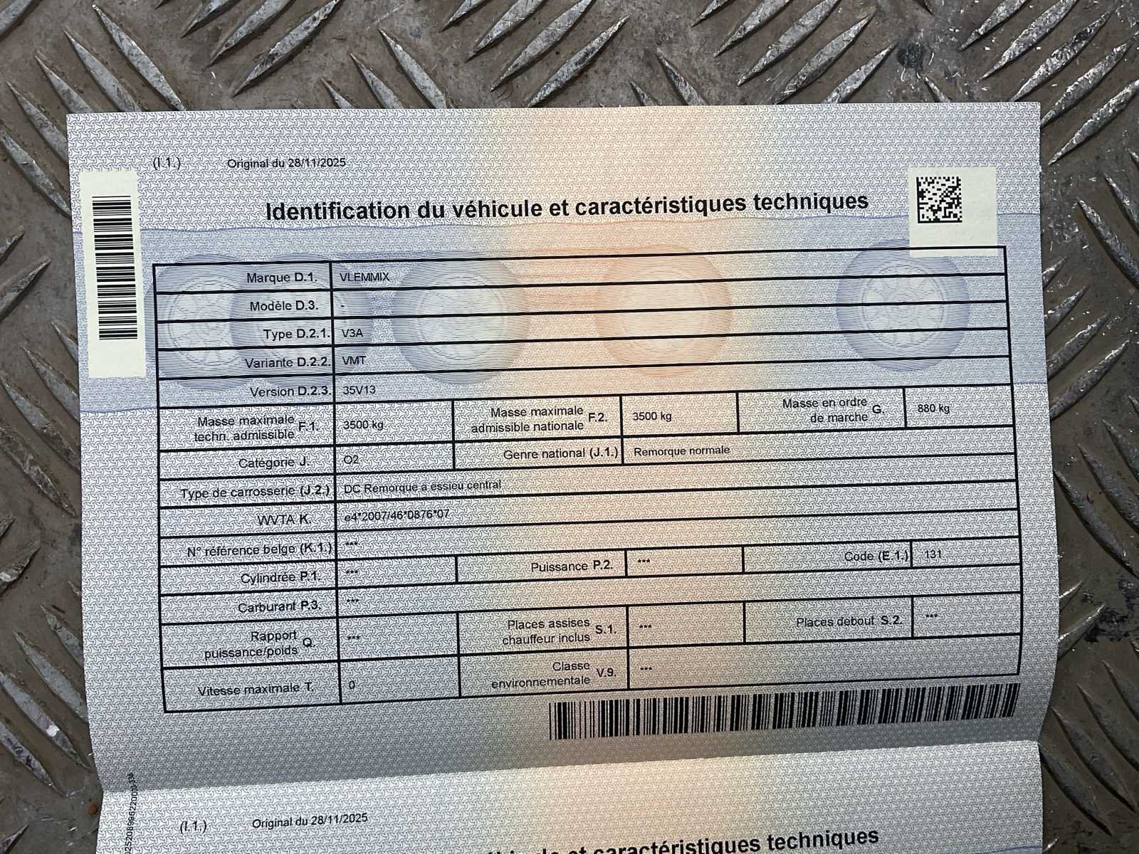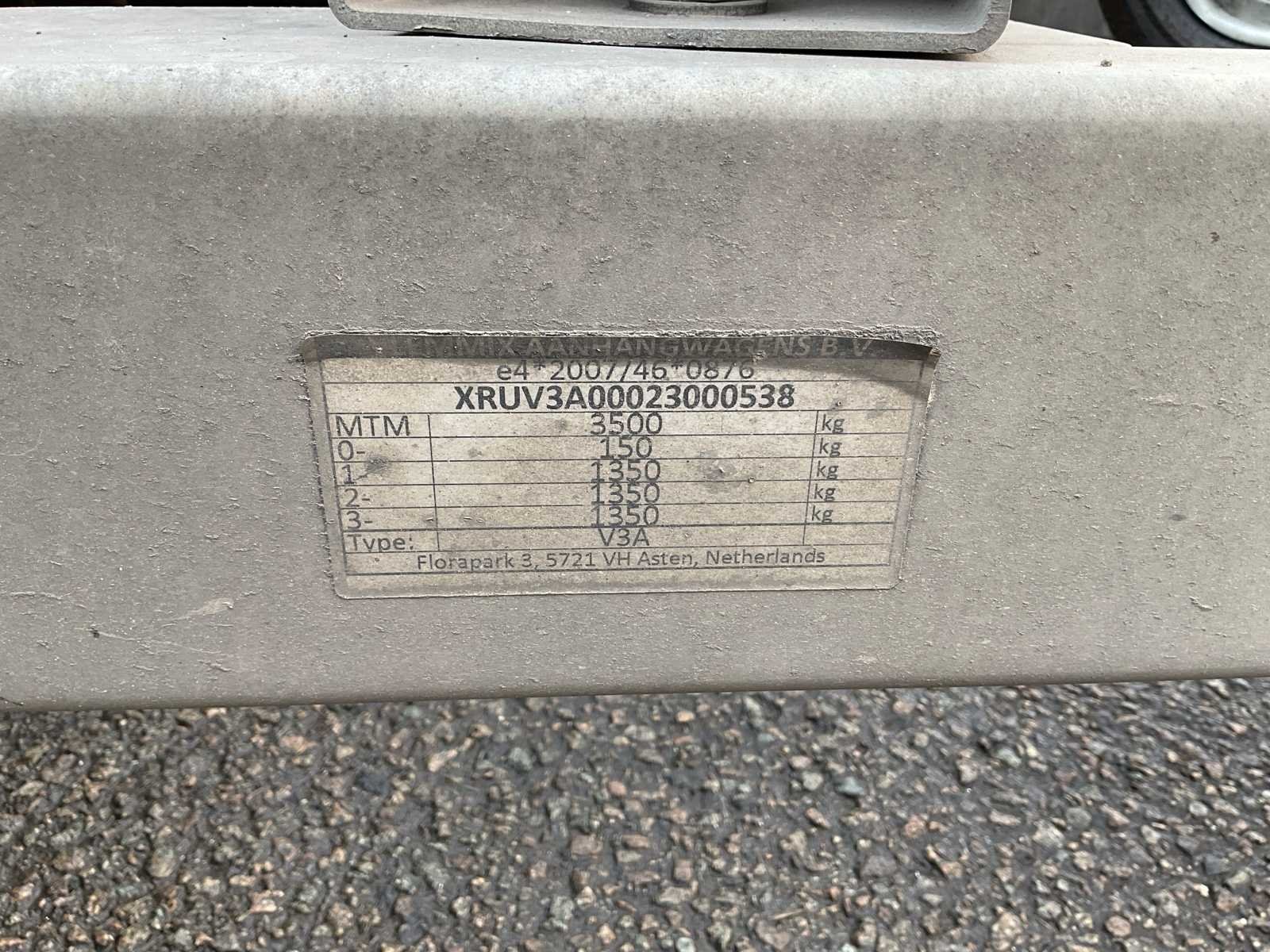 No Merk: VLEMMIX Type: 35V13 Bouwjaar: 2023 Chassisnummer: XRUV3A00023000538 Aantal assen: 3 Laadbak afmeting l: 400cm Ledig gewicht: 880kg Laadvermogen: 3500kg Datum eerste toelating: 11/09/2023 Kentekenpapieren compleet?: true Lengte: 582cm Breedte: 240cm Nationaliteit documenten: Belgi¨ë