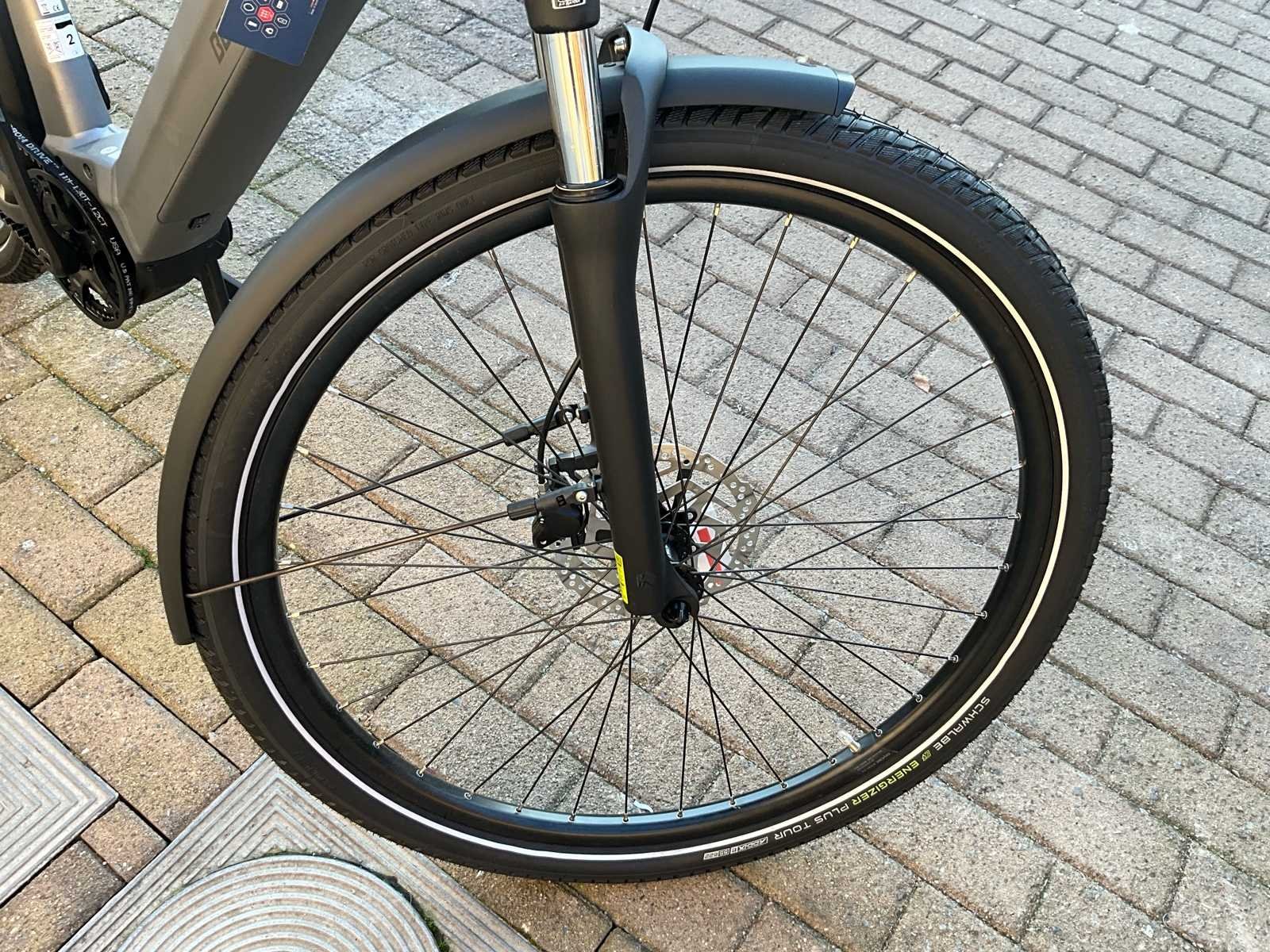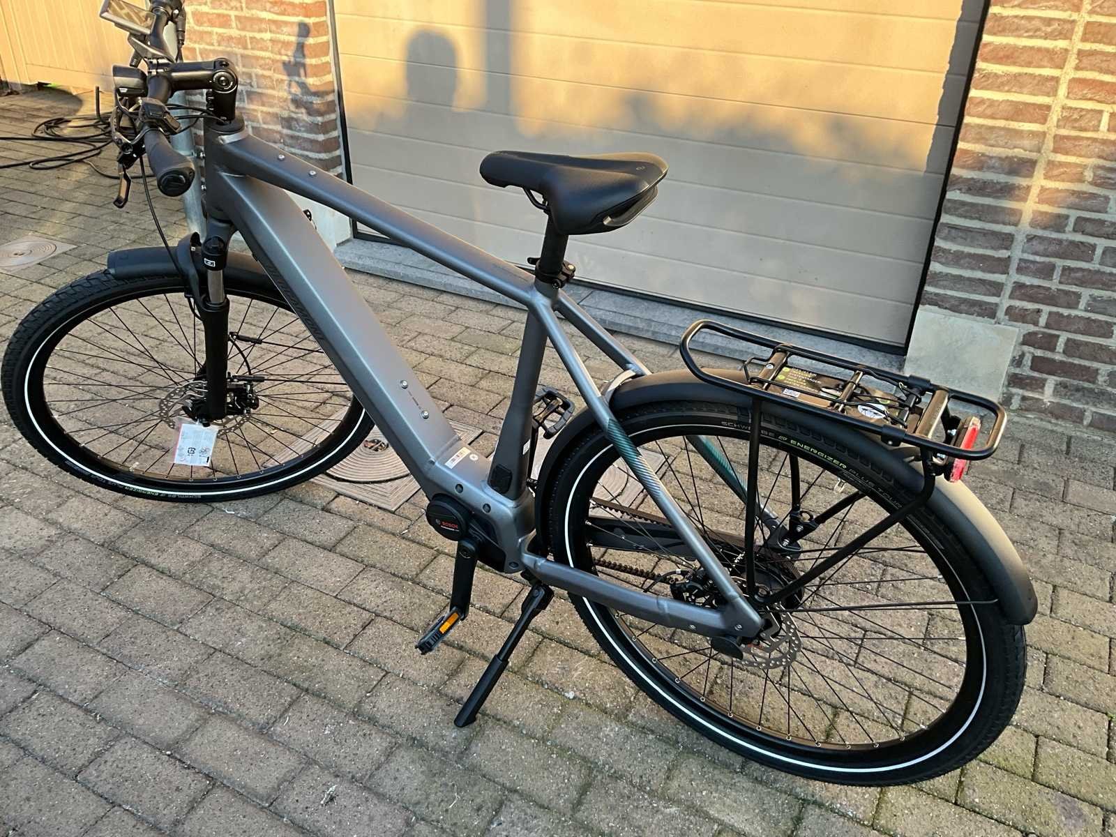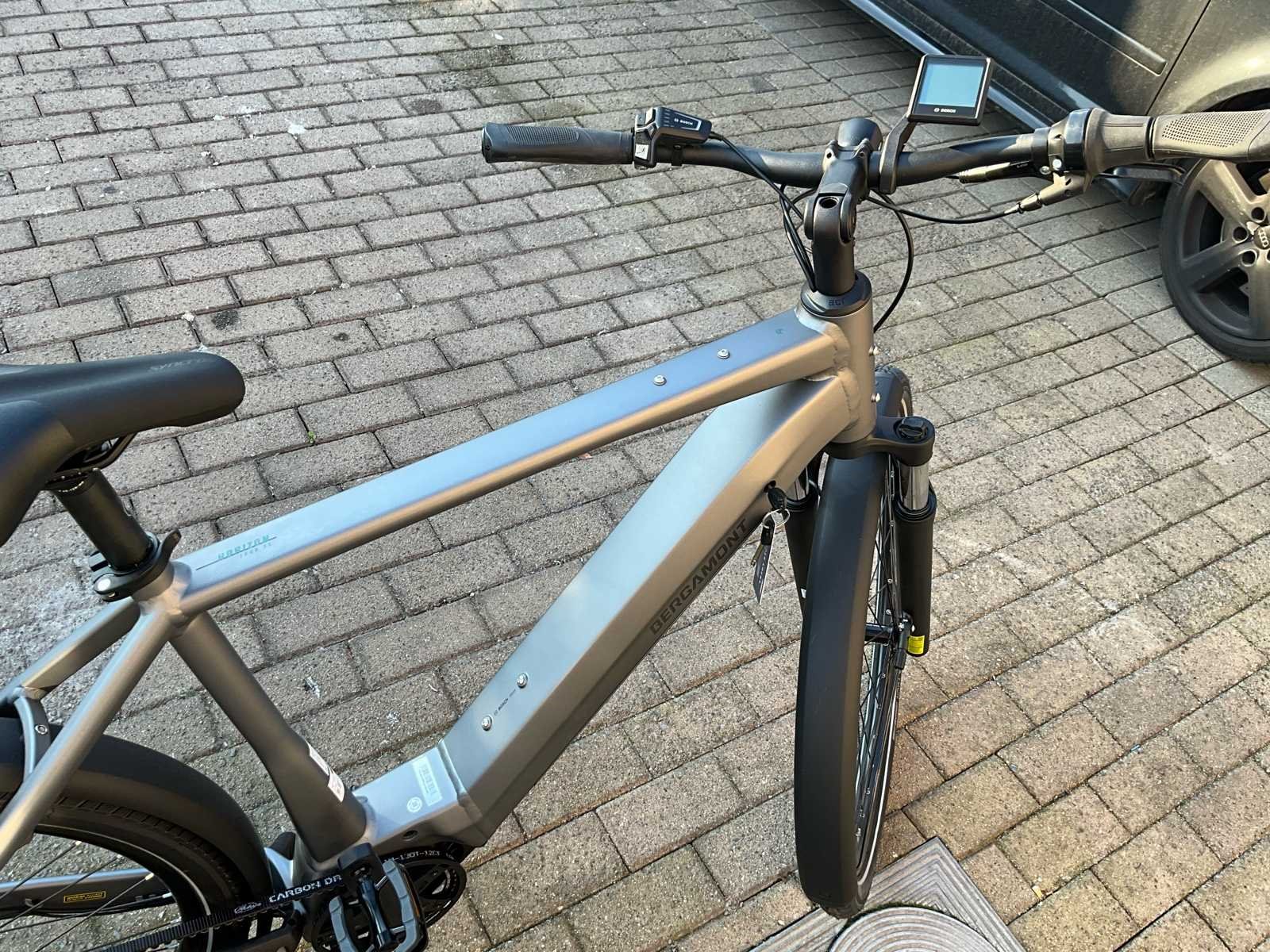 Bergamont Horizon Tour 3.5 elektrische fiets met krachtige Bosch middenmotor en onderhoudsarme Gates Carbon belt drive. Ideaal voor woon-werkverkeer, recreatieve ritten en dagelijks gebruik. Maat is XL. De fiets is voorzien van een strak aluminium frame met geïntegreerde accu, comfortabele voorvorkvering en een stabiele zithouding. Dankzij de riemaandrijving is er vrijwel geen onderhoud nodig (geen ketting, geen roest, geen smering). De Bosch Performance Line middenmotor zorgt voor krachtige en natuurlijke ondersteuning tot 25 km/u - geïntegreerde Bosch accu in frame - inclusief lader - Gates Carbon Drive riemaandrijving - Schwalbe Energizer Plus-banden - Comfort & Uitrusting: geïntegreerde verlichting, bagagedrager, spatborden, Bosch display, comfortabele rechte zithouding, ergonomisch stuur, stevige bagagedrager (max. 25 kg) geschikt voor fietstassen en kinderzitje. Nee Merk: Bergamont Model: Horizon Tour 3.5 Framemaat: XL Remsysteem: hydraulische schijfremmen Kleur: mat grijs Gewicht: 27 Materiaal: aluminium