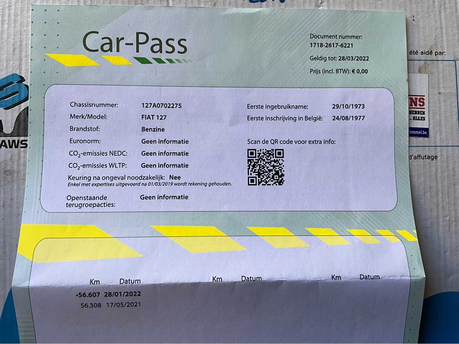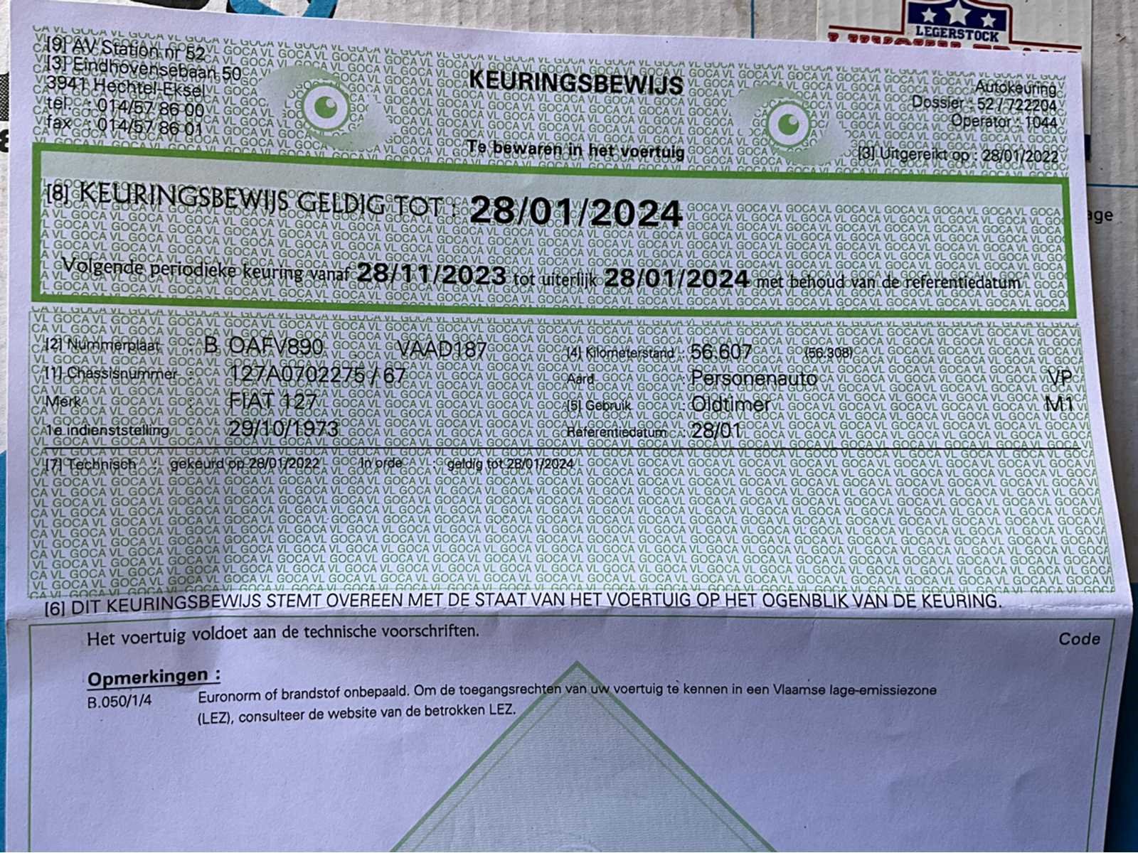 Zeer mooie en verzorgde Fiat 127 oldtimer uit 1973. Een charmante en iconische Italiaanse klassieker die steeds meer in waarde stijgt en overal aandacht trekt. De wagen bevindt zich in zeer nette staat en werd duidelijk met zorg behandeld. Zowel het interieur, de kofferruimte als de onderzijde ogen verzorgd en proper. De auto rijdt en schakelt goed en is ideaal voor oldtimerritten, hobbygebruik of als verzamelwagen. **Technische gegevens** * Merk / model: Fiat 127 * Bouwjaar: 1973 * Motor: 903 cc benzine * Vermogen: 33 kW (±45 pk) * Kilometerstand: ±56.600 km * Zitplaatsen: 4 * Oldtimer **Extra’s** * Alpine radio met Bluetooth / USB * Alpine luidsprekers * Alpine subwoofer in de koffer * Alpine versterkers * Sportstuur met Abarth-logo * Mooie sportieve uitstraling De Alpine installatie zorgt voor een verrassend goed en vol geluid, terwijl het karakter van de klassieke wagen behouden blijft. **Staat** De wagen verkeert algemeen in zeer mooie en verzorgde staat. Interieur is netjes, zetels zijn mooi en de wagen oogt zeer fris. Enkel **links voor kleine blaasjes in de lak** (zie foto’s). Verder een zeer nette carrosserie. **Documenten**: Alle documenten worden meegeleverd (inschrijvingsdocumenten, Car-Pass en keuringsdocument). De huidige eigenaar heeft de wagen zelf nooit opnieuw ingeschreven. Een **stijlvolle en leuke oldtimer** die klaar is om van te genieten. Nee Merk: Fiat Type: 127 Abarth uitvoering oldtimer Bouwjaar: 1973 Chassisnummer: 127A0702275 Afgelezen kilometerstand: 56600 Brandstof: benzine Datum eerste toelating: 29/10/1973 Nationaliteit documenten: B Kentekenpapieren compleet?: true Transmissie: manueel Vermogen (kW): 33kW Aantal deuren: 3 Aantal zitplaatsen: 4 Aantal sleutels: 1 Kleur: rood Cilinderinhoud: 900 Gelijkvormigheidsattest aanwezig: true