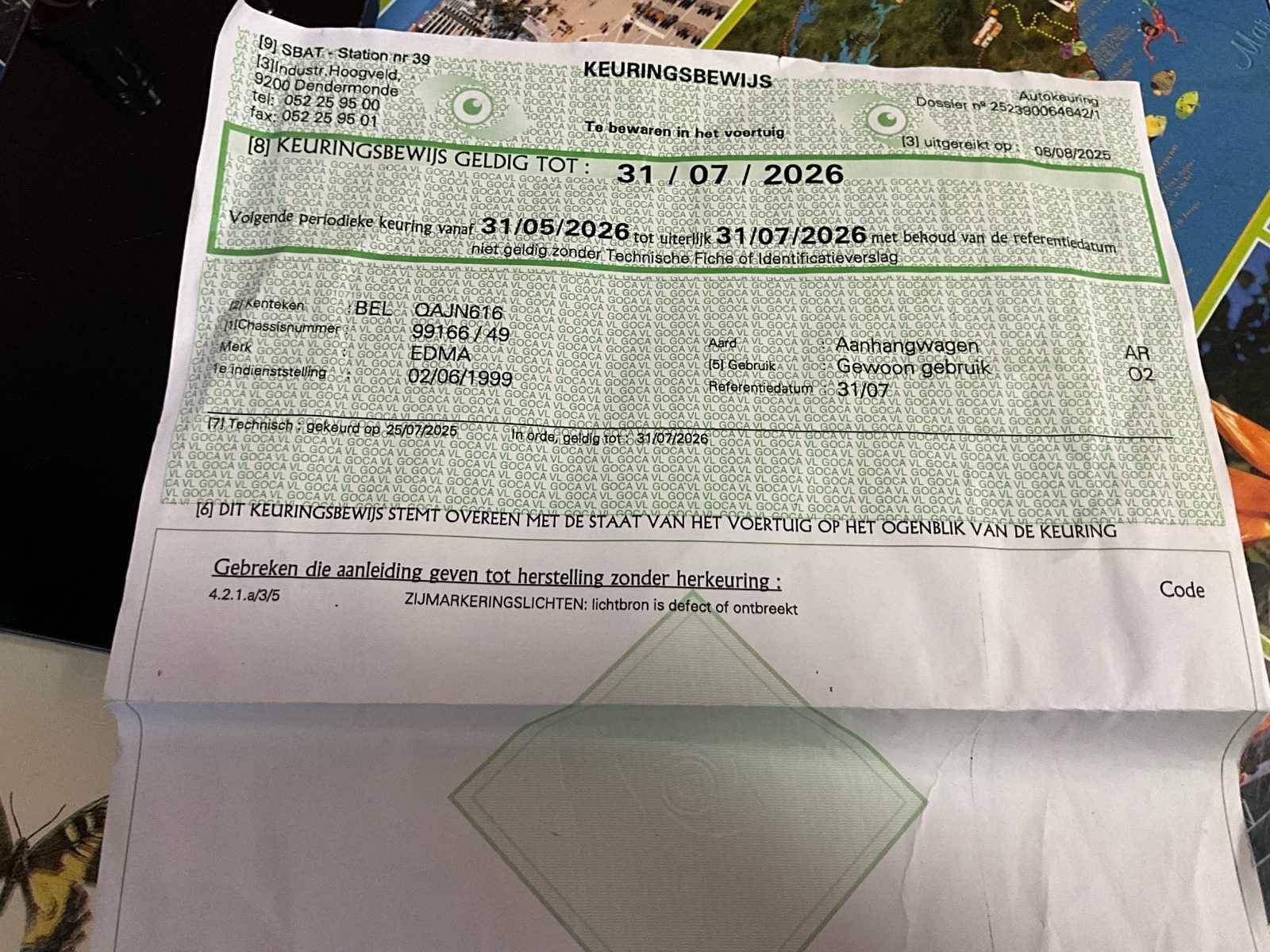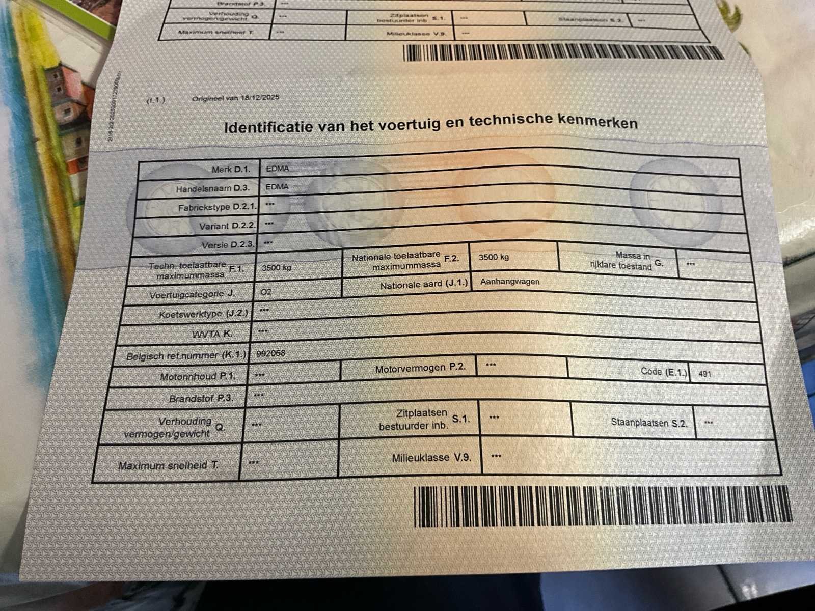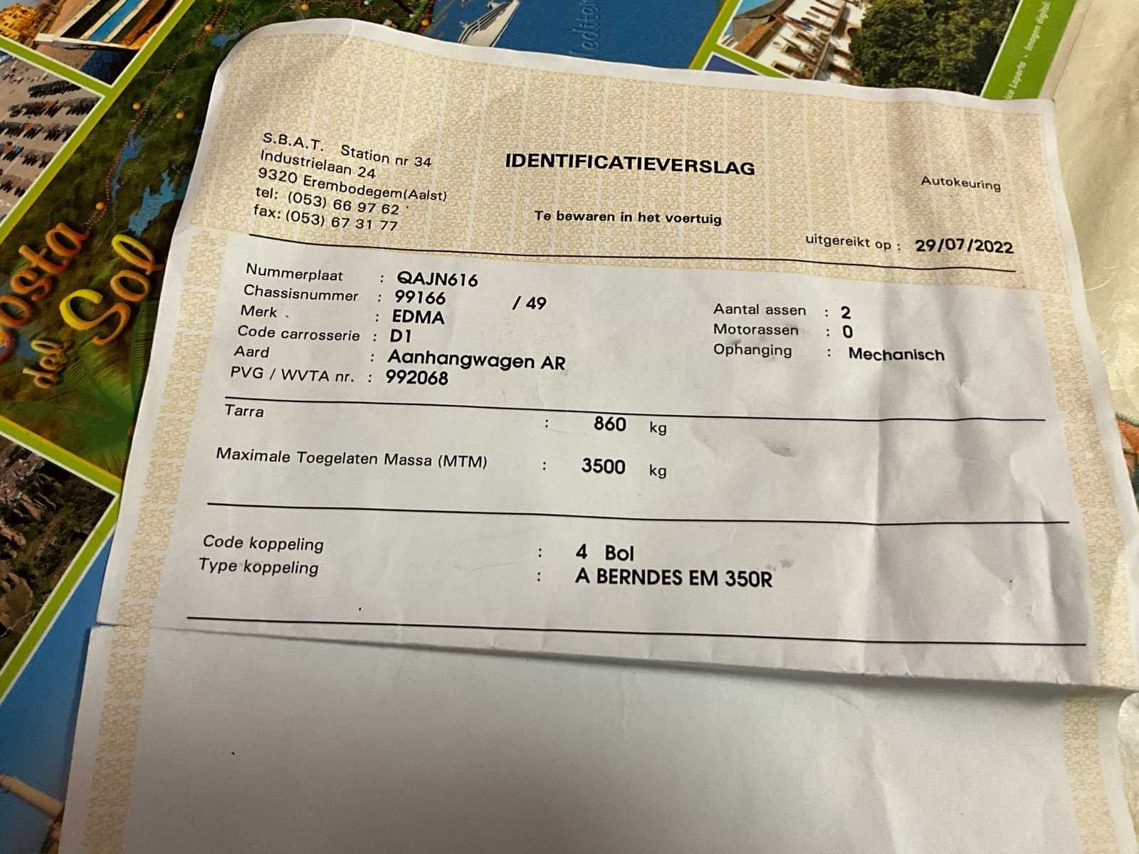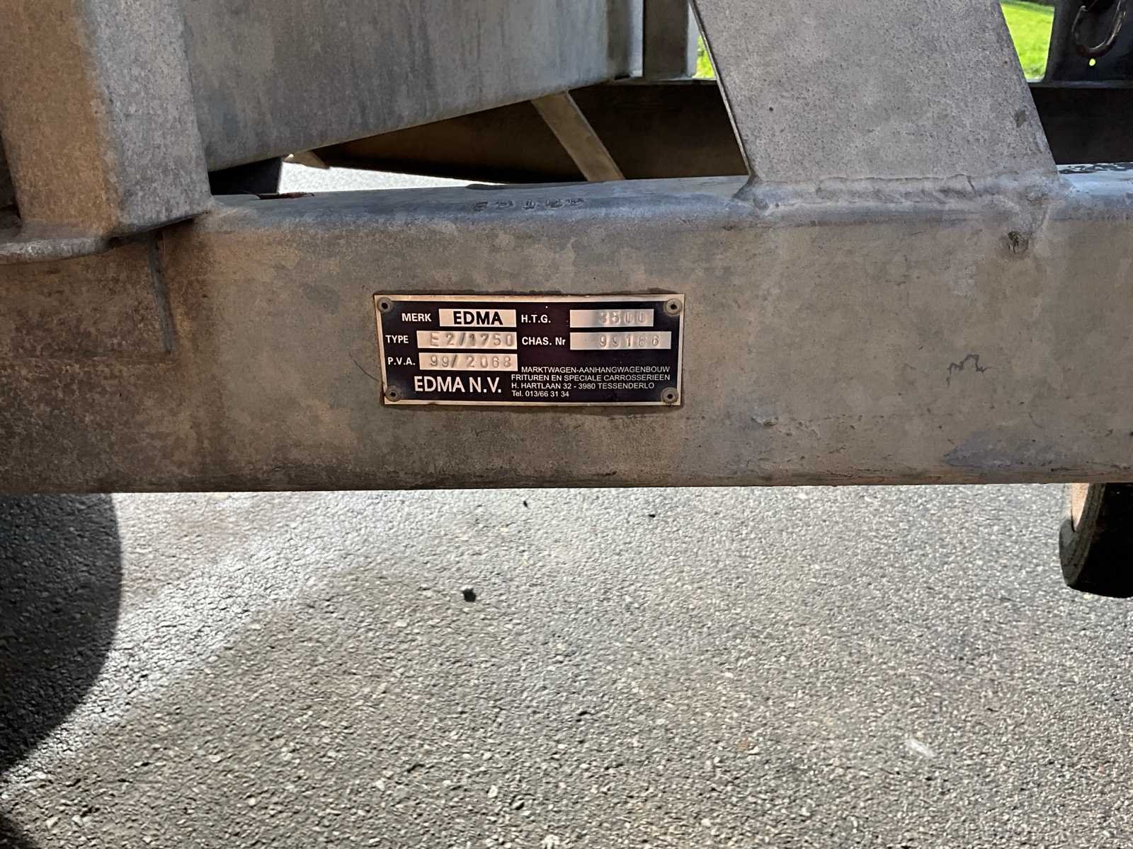 400x190x61 1zijsteun ontbreek Kan omgevormd worden tot 1 plateau voor het laden van transport No Merk: Edma Type: E2/1750 Chassisnummer: 99166 Aantal assen: 2 Datum eerste toelating: 02061999 Nationaliteit documenten: Belg