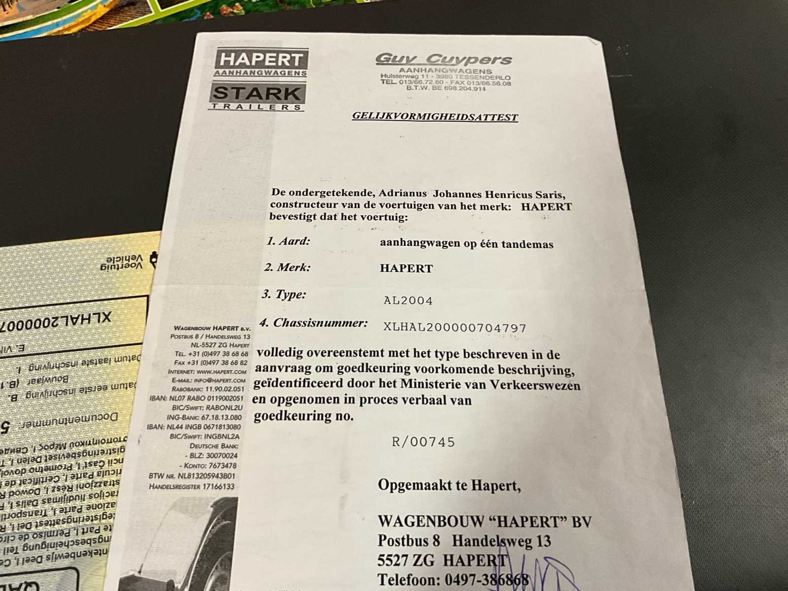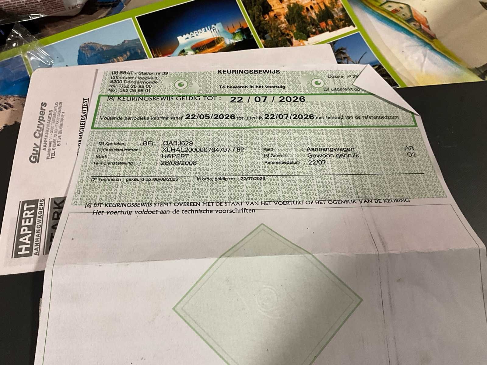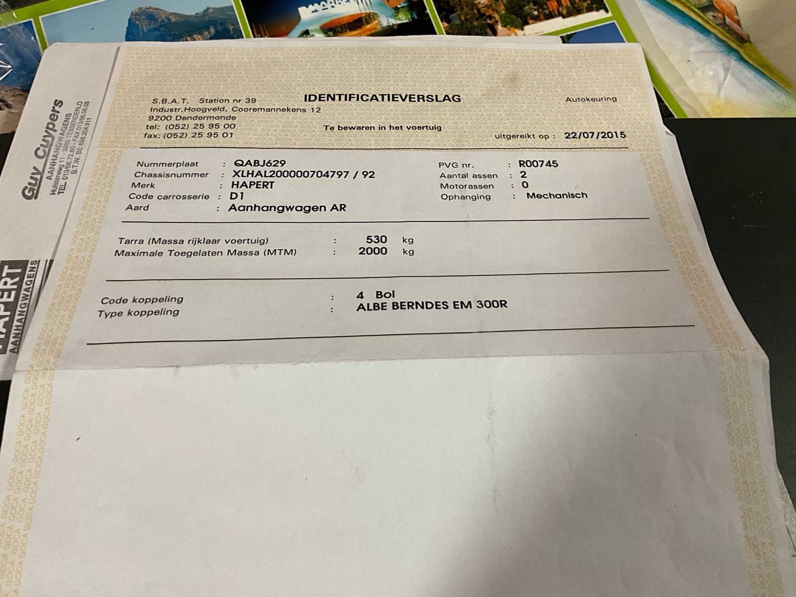 335x200 Rijdende staat No Merk: Hapert Type: AL2004 Bouwjaar: 2008 Chassisnummer: XLHAL200000704797 Aantal assen: 2 Ledig gewicht: 530kg Laadvermogen: 2000kg