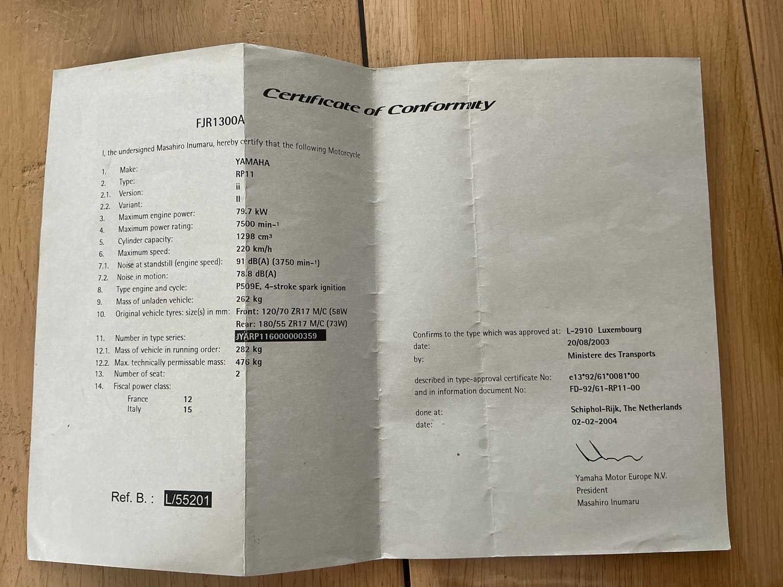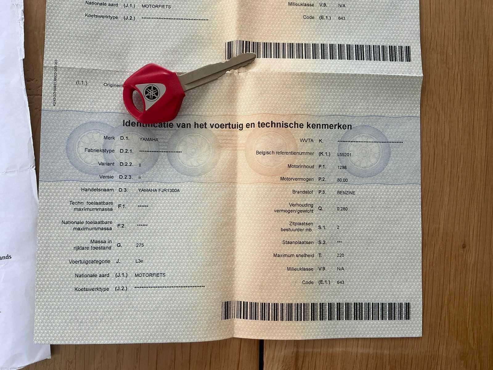 Gekeurde uitlaat met bijhorende certificaat. Nee Merk: Yamaha Model: FJR1300 Brandstof: Benzine Chassisnummer: JYARP116000000359 Cilinderinhoud: 1298cc Datum eerste toelating: 09/02/2004 Gewicht: 275kg Vermogen (kW): 80kW Afgelezen kilometerstand: 41706km Transmissie: Handgeschakeld Nationaliteit documenten: BE Boorddocumenten aanwezig?: true Aantal sleutels: 2 Startinformatie: Start, rijdt, remt Bouwjaar: 2004