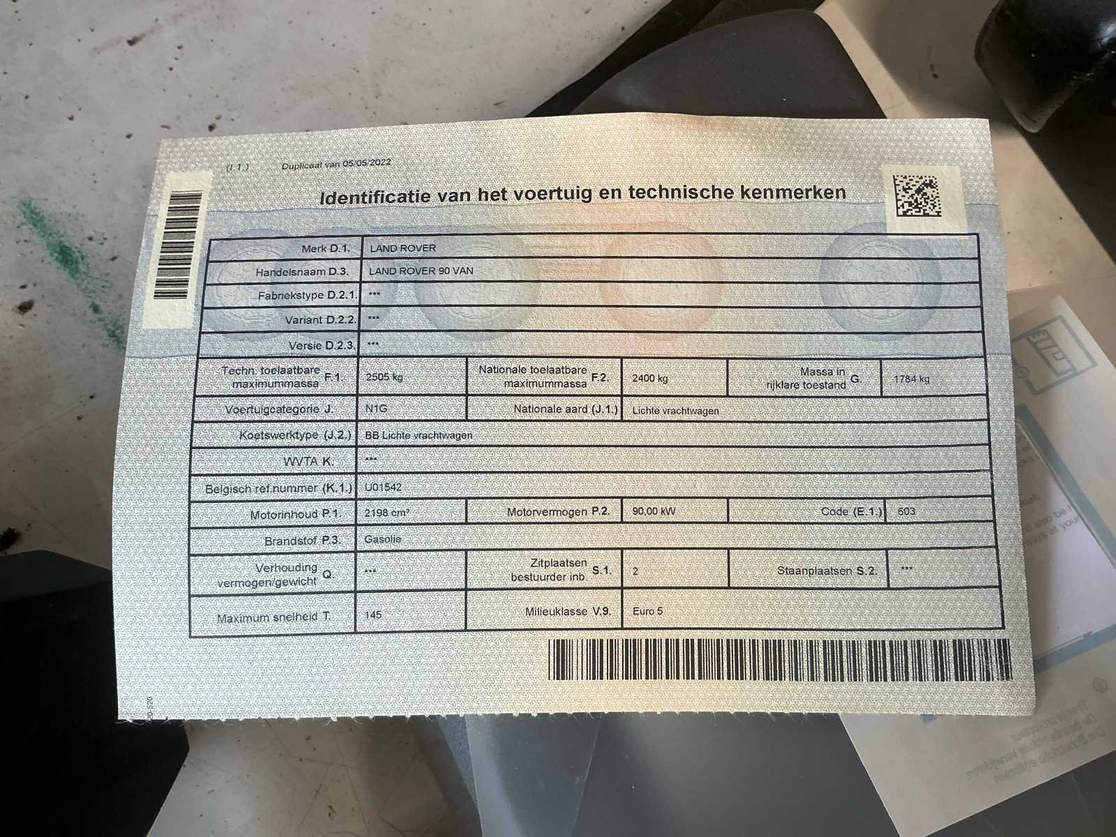 Geremapt naar 150pk - fiscale pk 12 - narbrons met zwart - spoorverbreders inclusief - nieuwe led lichten No Kenteken: 1FYC460 Merk: Land Rover Model: 90 VAN Afgelezen kilometerstand: 97657km Cilinderinhoud: 2198cc Vermogen (kW): 90kW Brandstof: Diesel Chassisnummer: SALLDWNP8CA427627 Datum eerste toelating: 08/11/2012 Transmissie: Handgeschakeld Emissieklasse: Euro 5 Nationaliteit documenten: Belgische Start en rijdt: Ja Keuringsrapport geldig tot: 20/04/2026 Vavato voert geen technische keuring uit.: true Inschrijvingsbewijs - deel 1 : Aanwezig Inschrijvingsbewijs - deel 2: Aanwezig