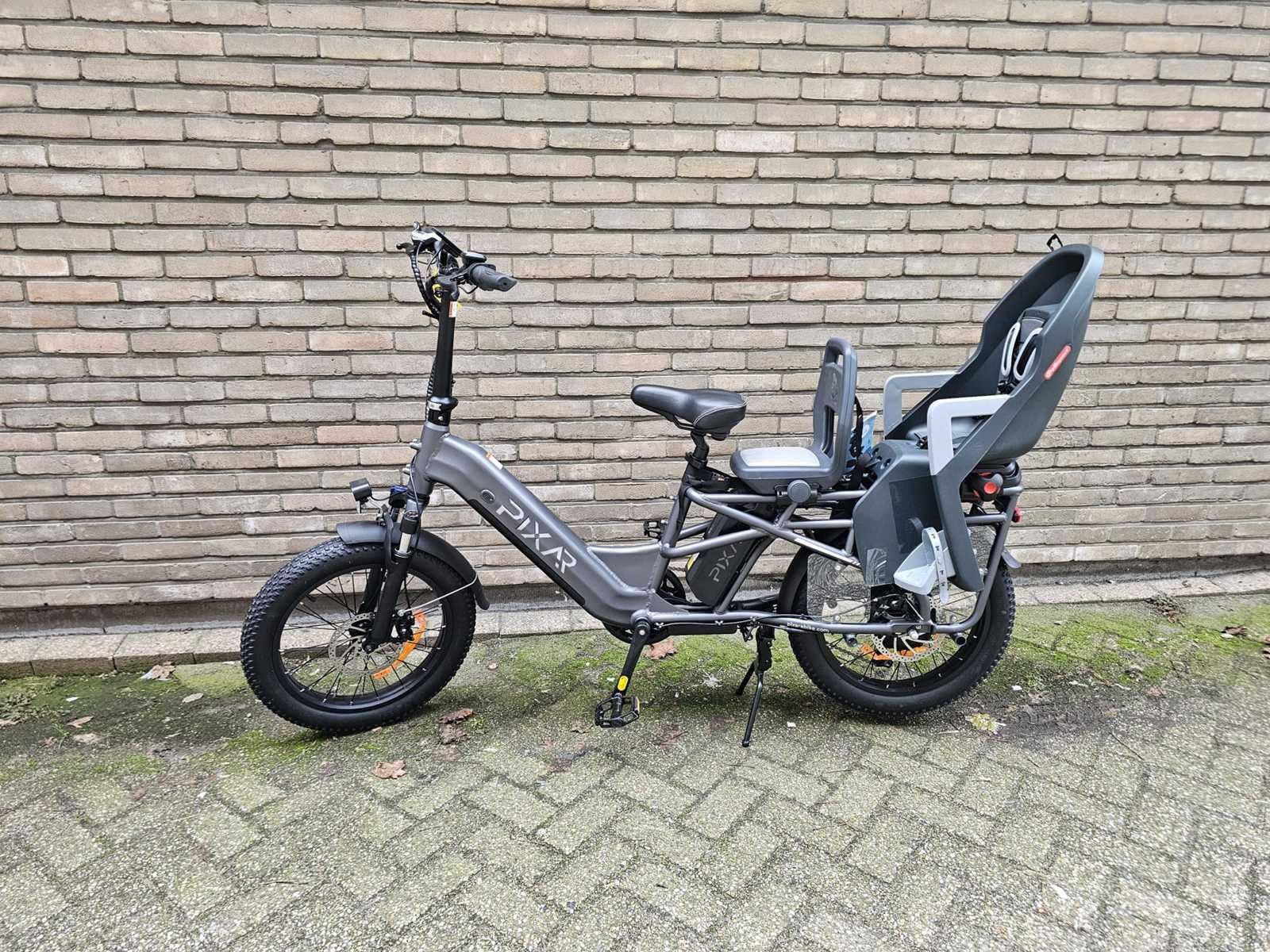 De kinderzadels in de foto zijn ter illustratie en kunnen tegen meerprijs aangeschaft worden. Batterijcapaciteit: 20Ah 48V Bereik: 50 - 100 km Frame: 20'' staal Netto/max gewicht: 33kg / 120 kg Max snelheid: 25 km/h Versnelling: 7 speed Motorvermogen: 250W Wielmaat: 20 x 3 Remtype: schijfrem Nee Merk: Pixar Model: Longtail/Cargo bike Afgelezen kilometerstand: 0km Motorpositie: Achter Remsysteem: Schijfremmen Voorvering: true Versnellingen: 7