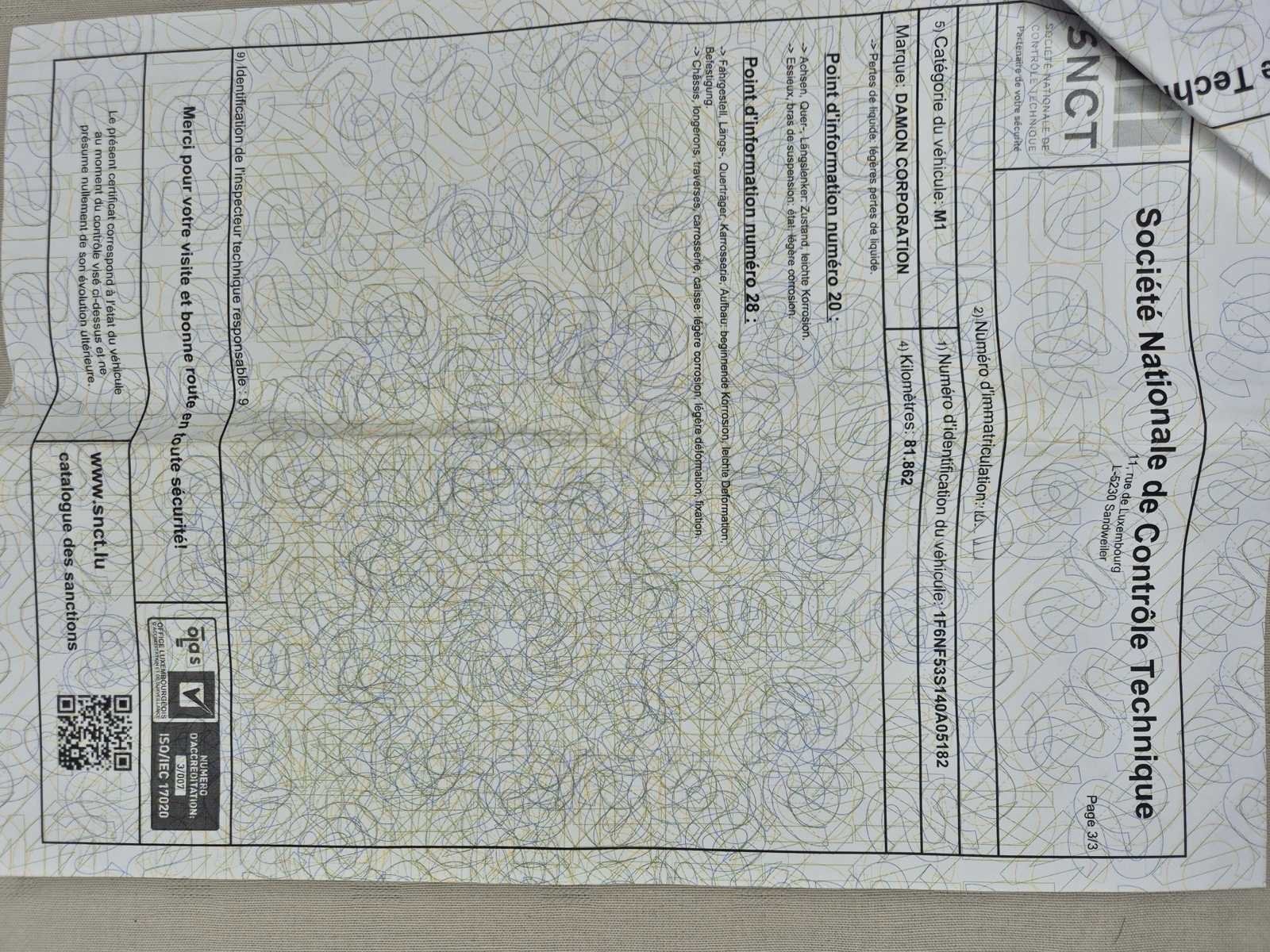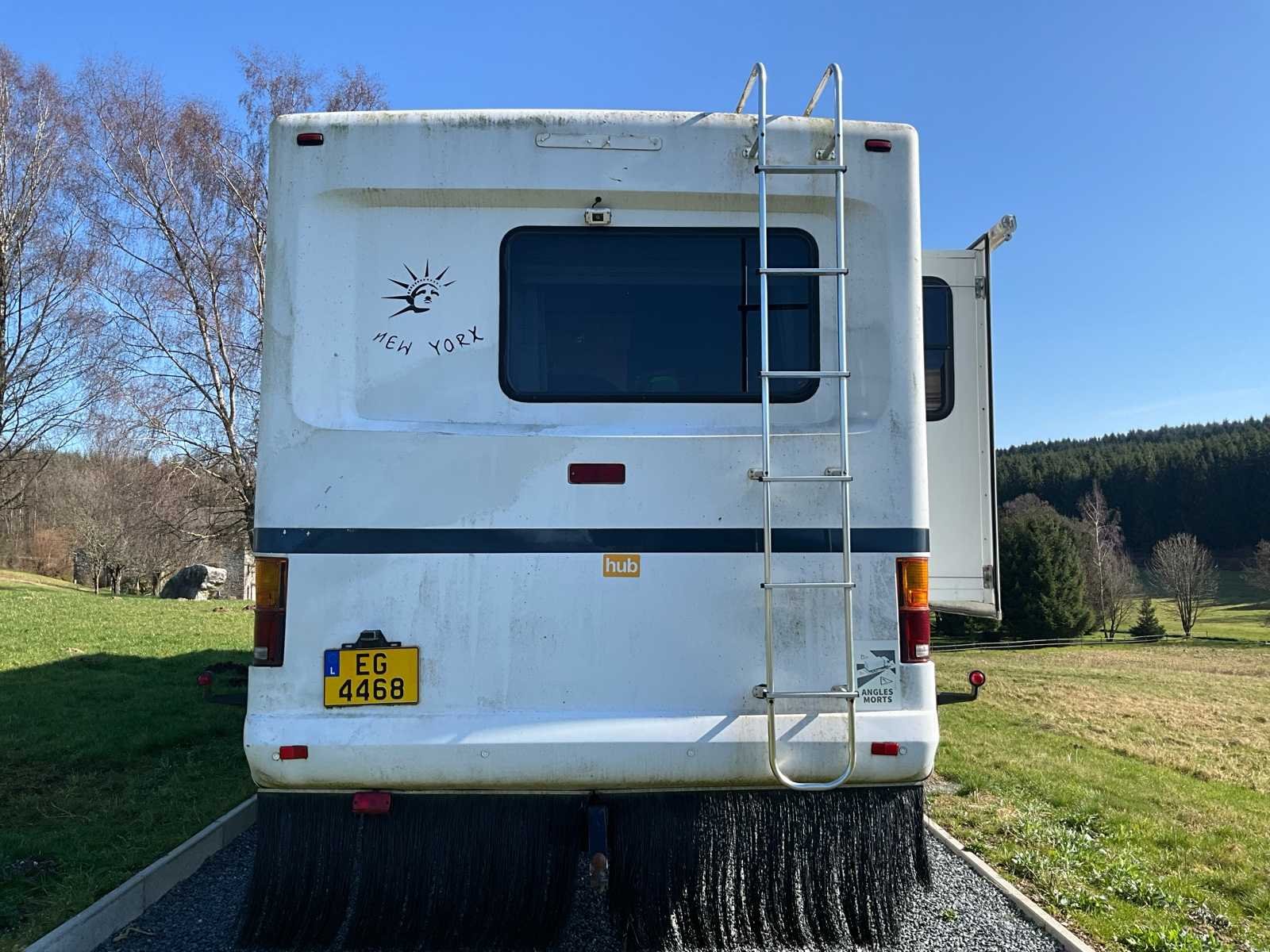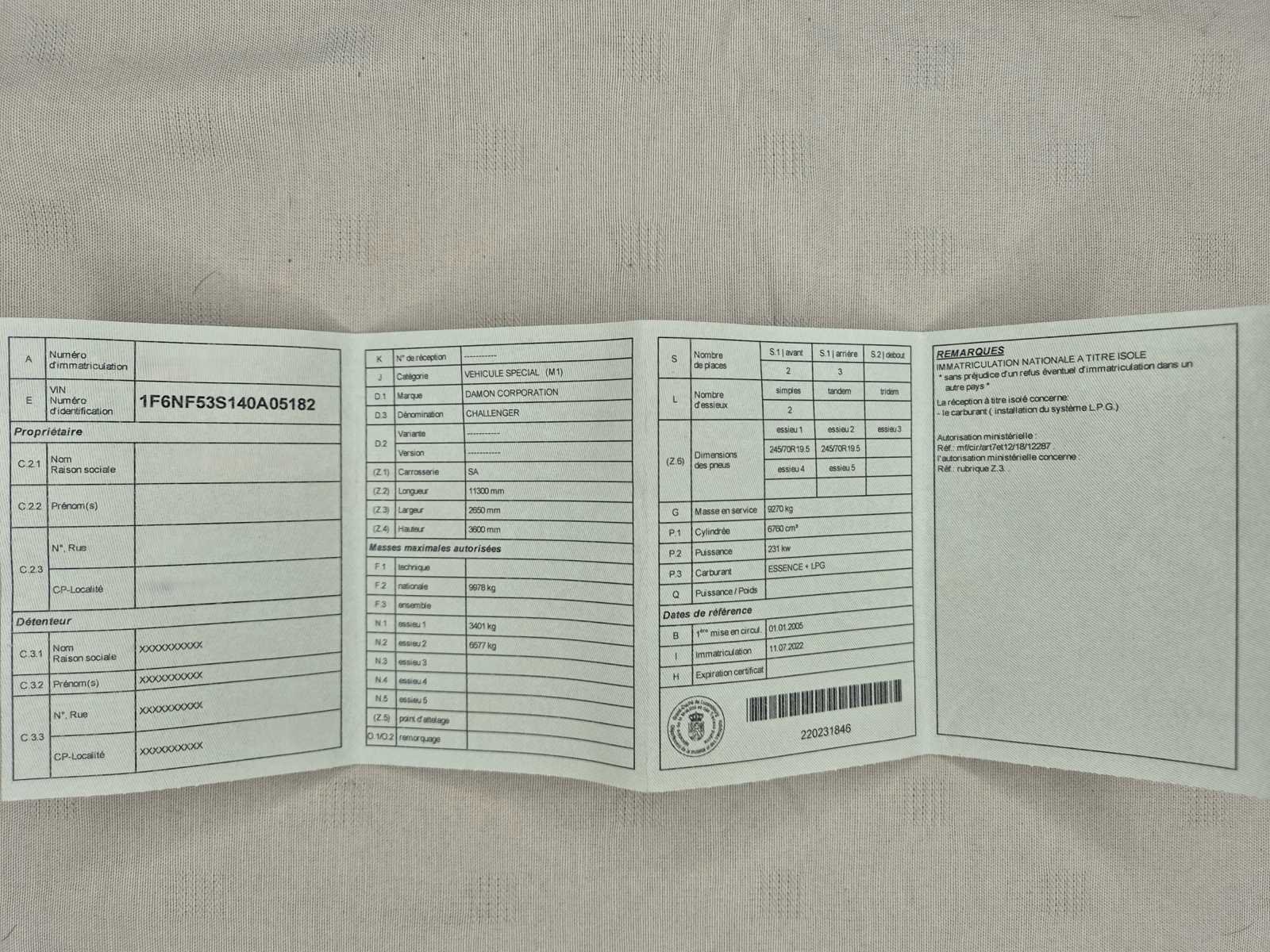 Merk: Damon Corporation Model: Challenger Jaar: 2005 Kilometer: 85.000 mijl Massa: 9270 kg GVW : 12,65 T Vergunning vereist: C-vergunning Afmetingen (L x W x H): 11,30 x 2,65 x 3,60 m Luxemburgse nationaliteitsdocumenten BASIS Chassis: Ford F-350 Motor: Ford Trytton V10 6.8L benzine + LPG (geldig tot 2030) Vermogen: 370 pk. Transmissie: Allison, 6-traps automaat CEL Zijverlengingen: 2 schuif uit Aantal wegplaatsen: 5 Aantal ligplaatsen: 4 Volumes van schoonwatertanks / grijs / zwart: 400L / 200L / 200L UITRUSTING Automatische satellietantenne, 2 LED-tv-schermen, US Koelkast, Magnetron, Gasoven, Dubbele gootsteen, Omkeerbare airconditioning, slaapkamer + woonkamer LPG-verwarming, 5 kW benzinegeneratorset, Zonnepanelen, Koolstofgelbatterij jaar 2021 Hitch, Stabiliserende cilinders, Achteruitrijcamera, Motorairconditioning, Elektrische opstapje, Elektrische luifel, Luifels bij de ramen, Dubbel glas, Getinte ramen, enzovoort. Wasmachine Technische controlenotitie: speel in één lager (moet alleen nog aangedraaid worden) Defecte voor- en achterpositielamp (lampen vervangen) Vervang de terugveerveer van de stabilisatorcilinders. No Model: Damon corporation Type: Challenger Chassisnummer: 1F6NF53S140A05182 Transmissie: Automatisch Datum eerste toelating: 01/01/2005 Bouwjaar: 2005 Afgelezen mijlenstand: 85000mi Vermogen (pk): 370hp Cilinderinhoud: 6760cc Brandstof: Benzine+LPG Kleur: Wit Lengte: 1130cm Breedte: 265cm Hoogte: 360cm Ledig gewicht: 9270