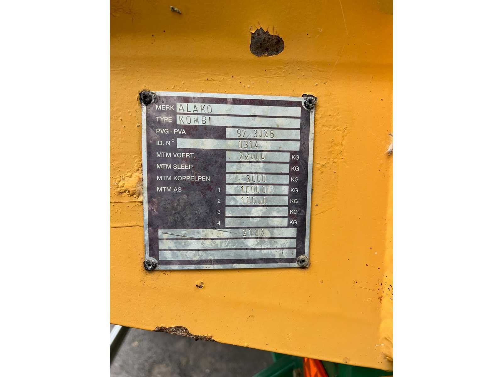 Met demonteerbare kleppen - Boorddocumenten compleet - Tarra 7420kg - MTM 22000kg - Nuttig laadvermogen 14580kg Nee Merk: Alako Type: Kombi Bouwjaar: 2006 Serienummer: 0314(03) Aantal assen: 2 Bandenmaat: 24R20.5 Totaal max. gewicht: 22t Afdeksysteem: true Eigen gewicht: 7420kg Totale afmeting L: 7500mm Totale afmeting Breedte: 2800mm Totale afmeting Hoogte: 3450mm