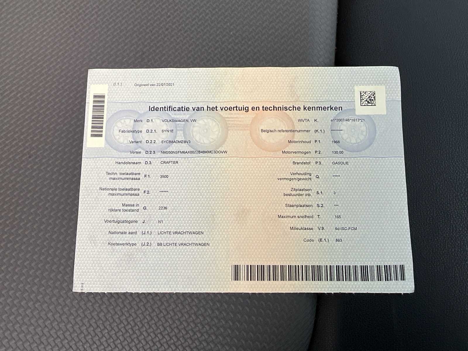 In zeer nette staat. De wagen start en rijdt zonder problemen. Documenten aanwezig, geen opmerkelijke schades. Zie foto’s voor details. No Merk: Volkswagen Model: Crafter Bouwjaar: 2021 Chassisnummer: WV12 Afgelezen kilometerstand: 203926km Cilinderinhoud: 1968cc Vermogen (kW): 130kW Brandstof: Diesel Datum eerste inschrijving: 22/07/2021 Transmissie: Handgeschakeld Aantal zitplaatsen: 3 Kleur: Wit Nationaliteit documenten: Belgie Aantal sleutels: 2 Emissieklasse: 6d-ISC-FCM