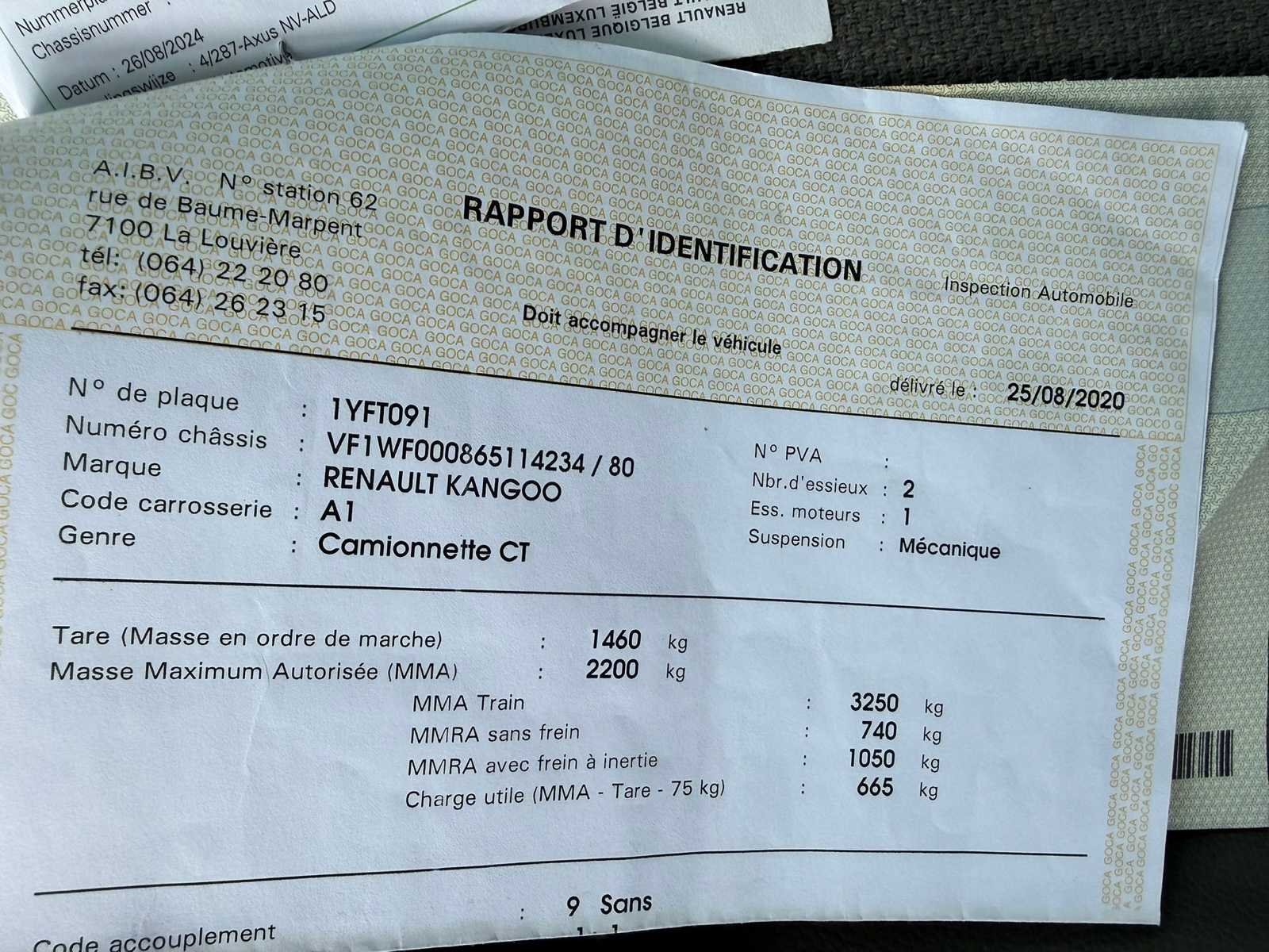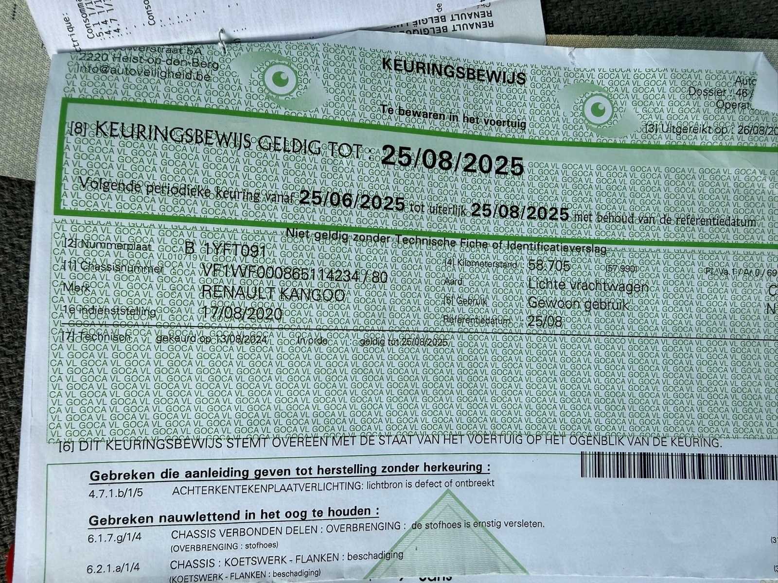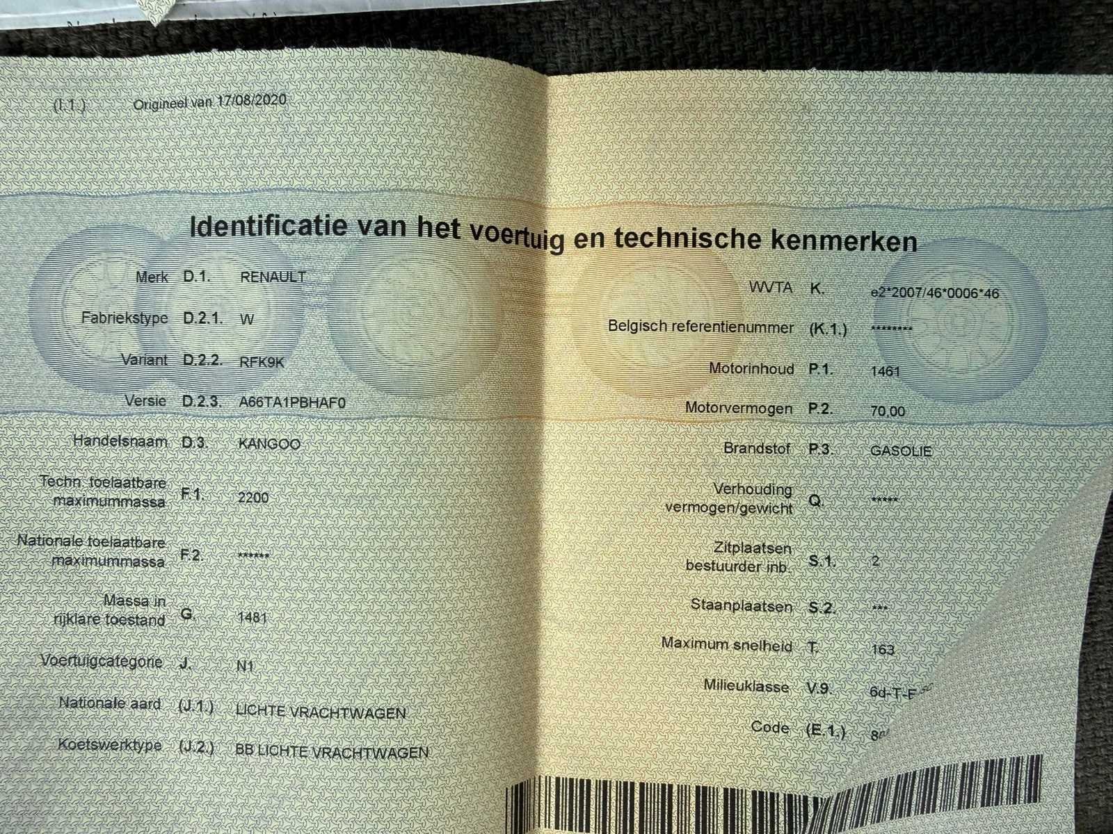 Start, rijdt, remt, onmiddellijk inzetbaar - algemeen nette staat, lichte carrosserie-schade (zie foto’s) - 6 versnellingen No Merk: Renault Model: Kangoo Bouwjaar: 2020 Afgelezen kilometerstand: 66975km Cilinderinhoud: 1461cc Vermogen (kW): 70kW Brandstof: diesel Chassisnummer: VF1WF000865114234 Laadvermogen: 665kg Datum eerste toelating: 17/8/2020 Aantal zitplaatsen: 3 Kleur: wit Transmissie: manueel Emissieklasse: Euro 6d Aantal deuren: 5 Aantal sleutels: 2 Nationaliteit documenten: B Gelijkvormigheidsattest aanwezig: true Start en rijdt: ja Keuringsrapport geldig tot: 25/8/2025 Zichtbare schade: ja Vavato voert geen technische keuring uit.: true Inschrijvingsbewijs - deel 1 : aanwezig Inschrijvingsbewijs - deel 2: aanwezig