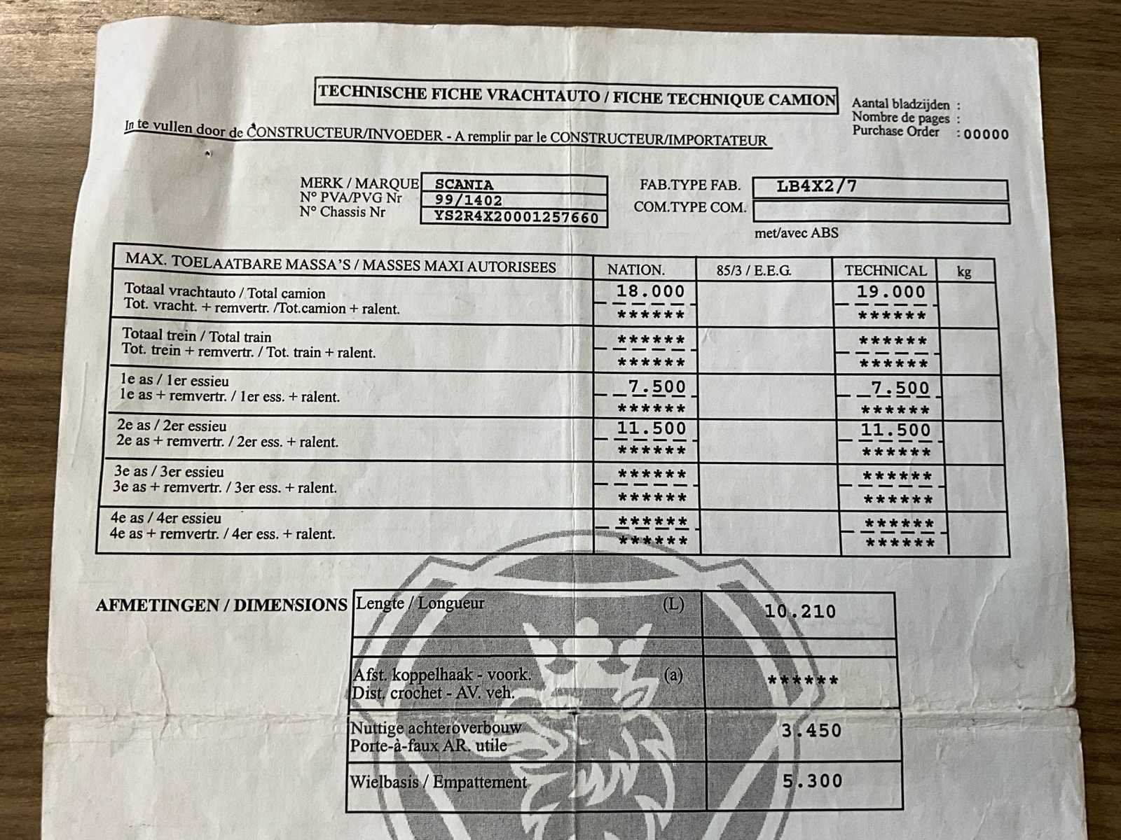 Functioneel, onmiddellijk inzetbaar - lichte schade aan carrosserie (zie foto’s) maar over algemeen nette staat No Merk: Scania Bouwjaar: 2000 Chassisnummer VIN: YS2R4X20001257660 Kilometerstand bij opname: 607634km Datum eerste toelating: 8/3/2000 Type transmissie: Handmatig Aantal assen: 2 Slaapcabine: true Eigen gewicht: 11700kg Totale afmeting L: 10210mm Nationaliteit documenten: B Kentekenpapieren compleet?: true Aantal zitplaatsen: 2 Handgeschakelde versnellingsbak: true