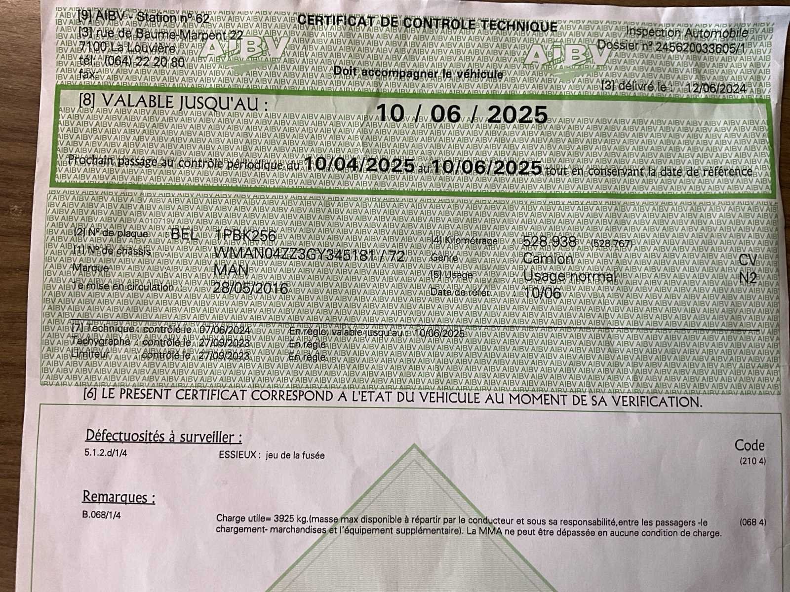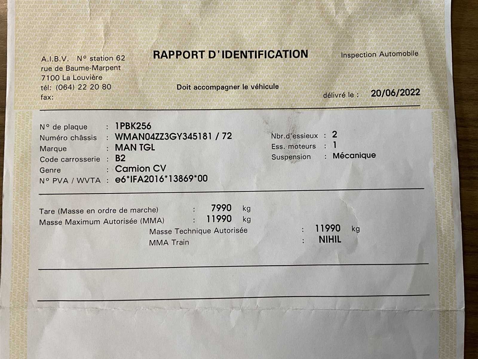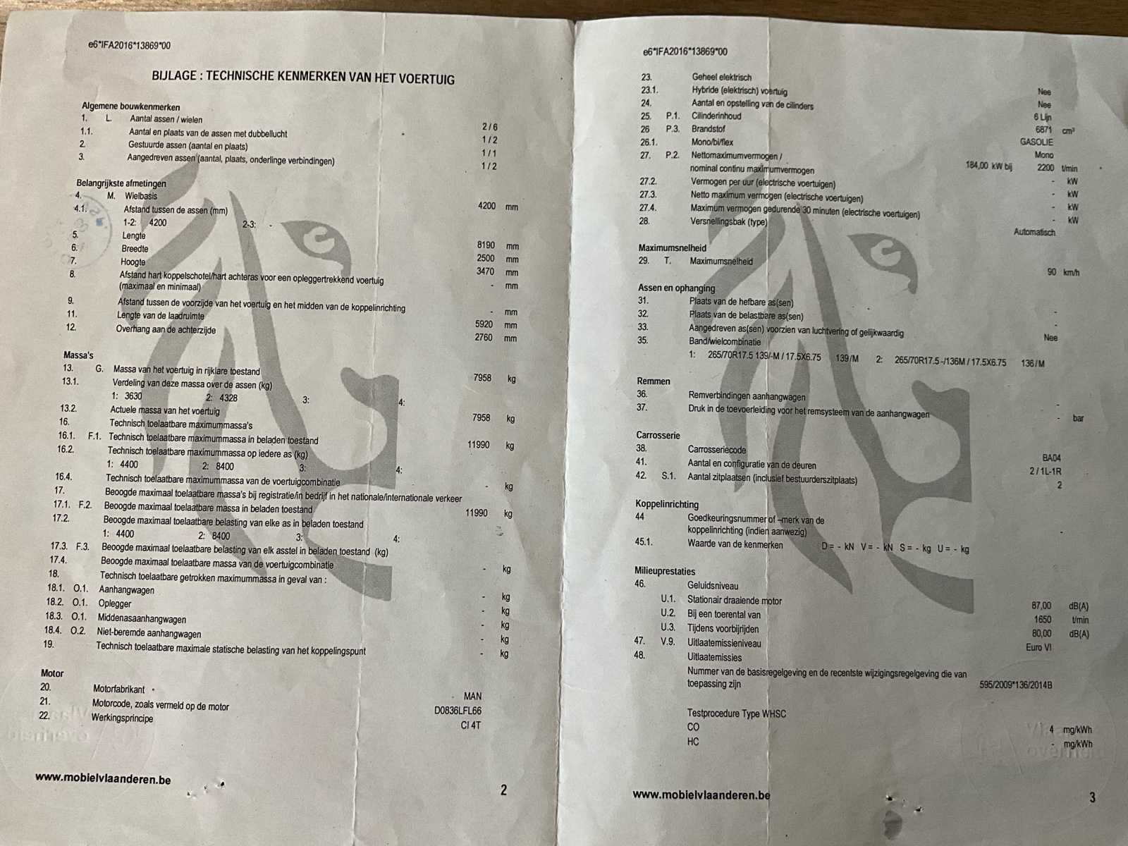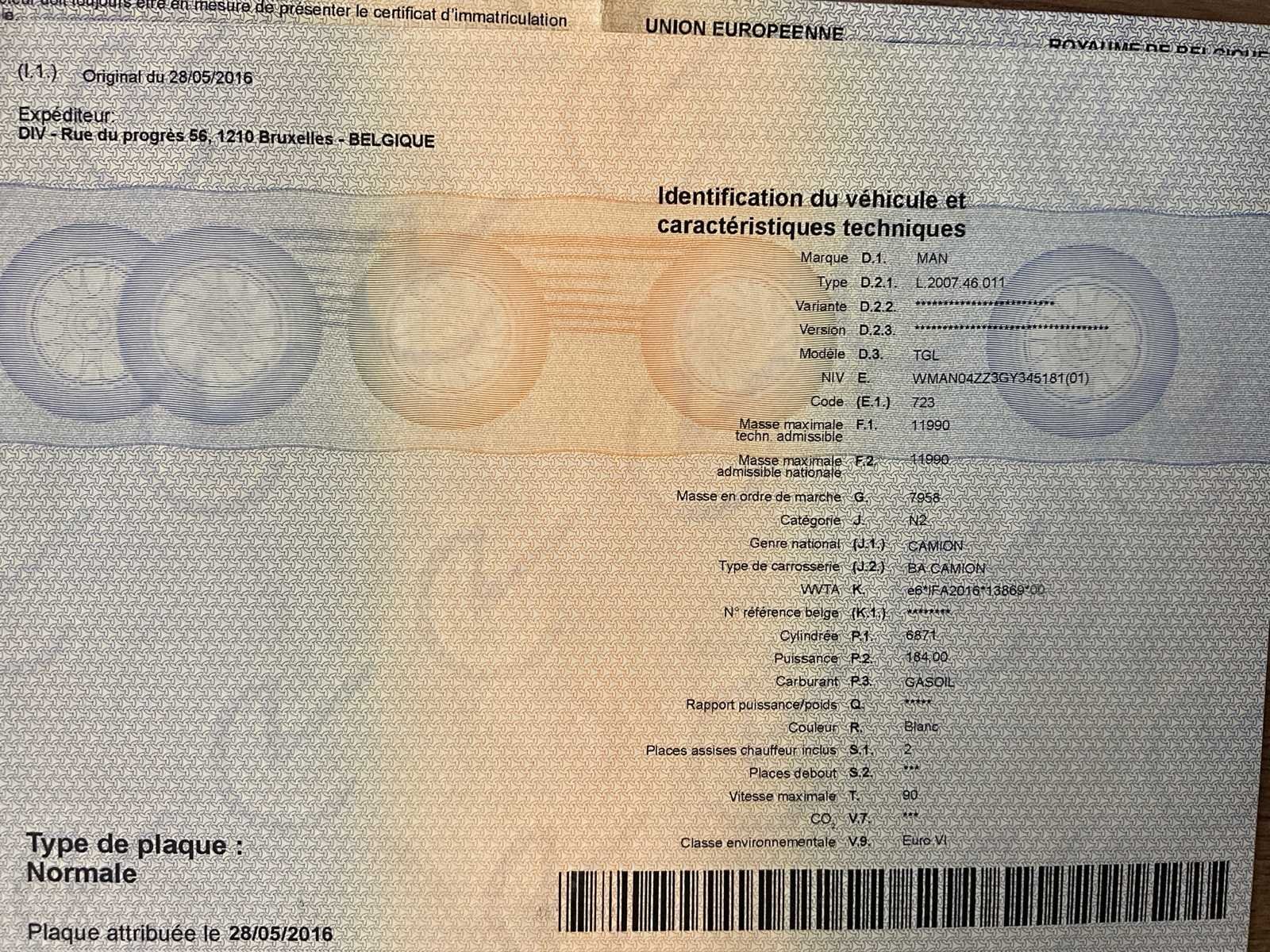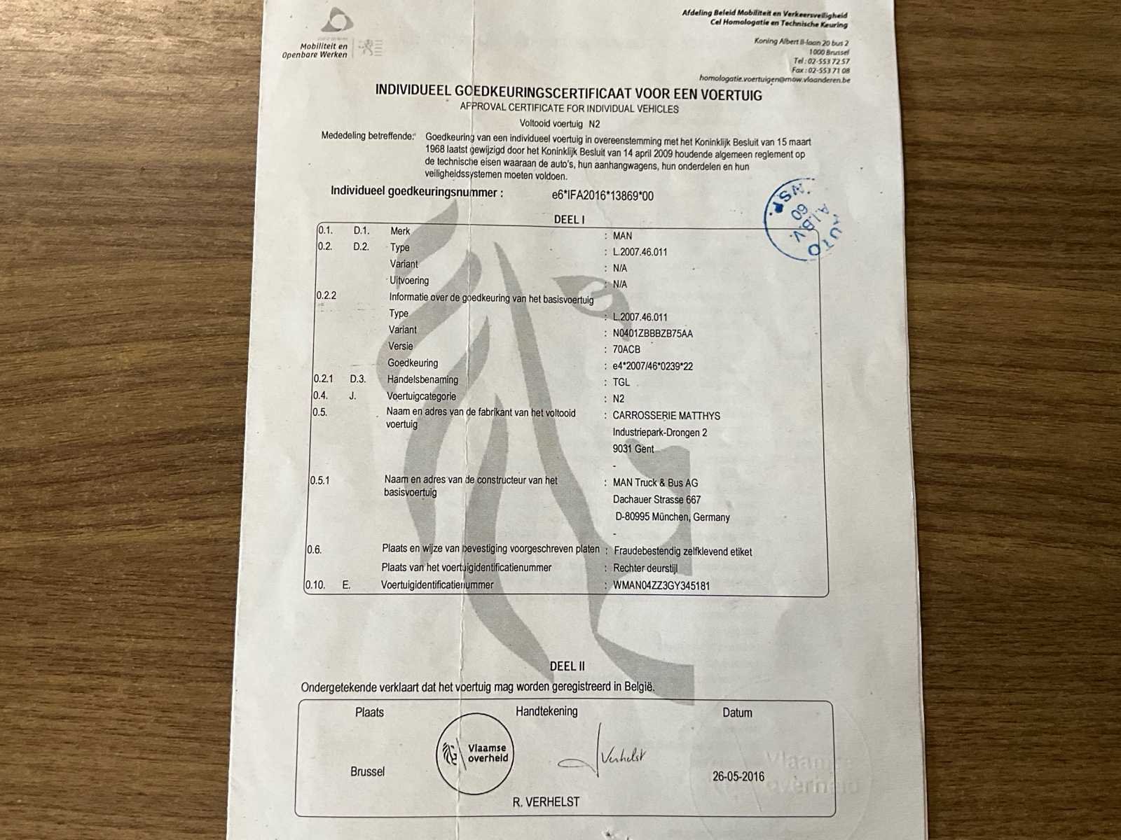 Koel/vries transport - automaat - koeling & hydraulische laadklep zijn functioneel (zie video en foto’s) - lichte gebruikssporen hier en daar (zie foto’s) maar over algemeen nette staat - Voertuig start en rijdt. Tijdens het opstarten verschijnt een melding op het dashboard met betrekking tot de luchtdruk/versnellingsbak (“Pression alimén. – Blocage chang. vit.”). oorzaak: batterij is te zwak. nadat deze is opgeladen, verdwijnt melding No Merk: MAN Type: TGL 12.250 Thermoking T-1000r koel/vries Bouwjaar: 2016 Chassisnummer VIN: WMAN04ZZ3GY345181 Cilinderinhoud: 6871cc Kilometerstand bij opname: 574576km Datum eerste toelating: 28/5/2016 Type transmissie: Automatisch Aantal assen: 2 Fuel Type: Diesel Emissieklasse: Euro 6 Hydraulische laadklep: true Eigen gewicht: 7990kg Totale afmeting L: 8190mm Totale afmeting Breedte: 2500mm Totale afmeting Hoogte: 3470mm Nationaliteit documenten: B Kentekenpapieren compleet?: true