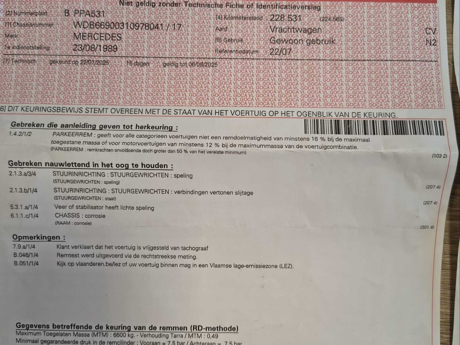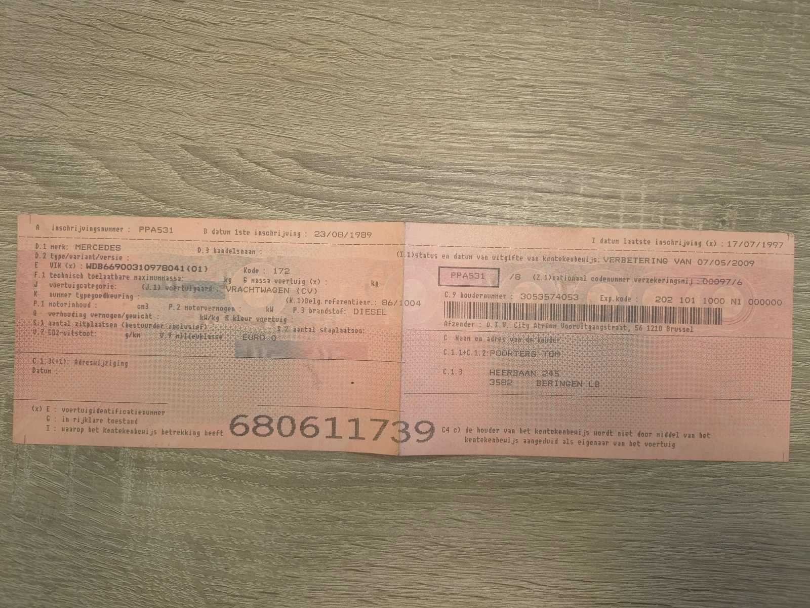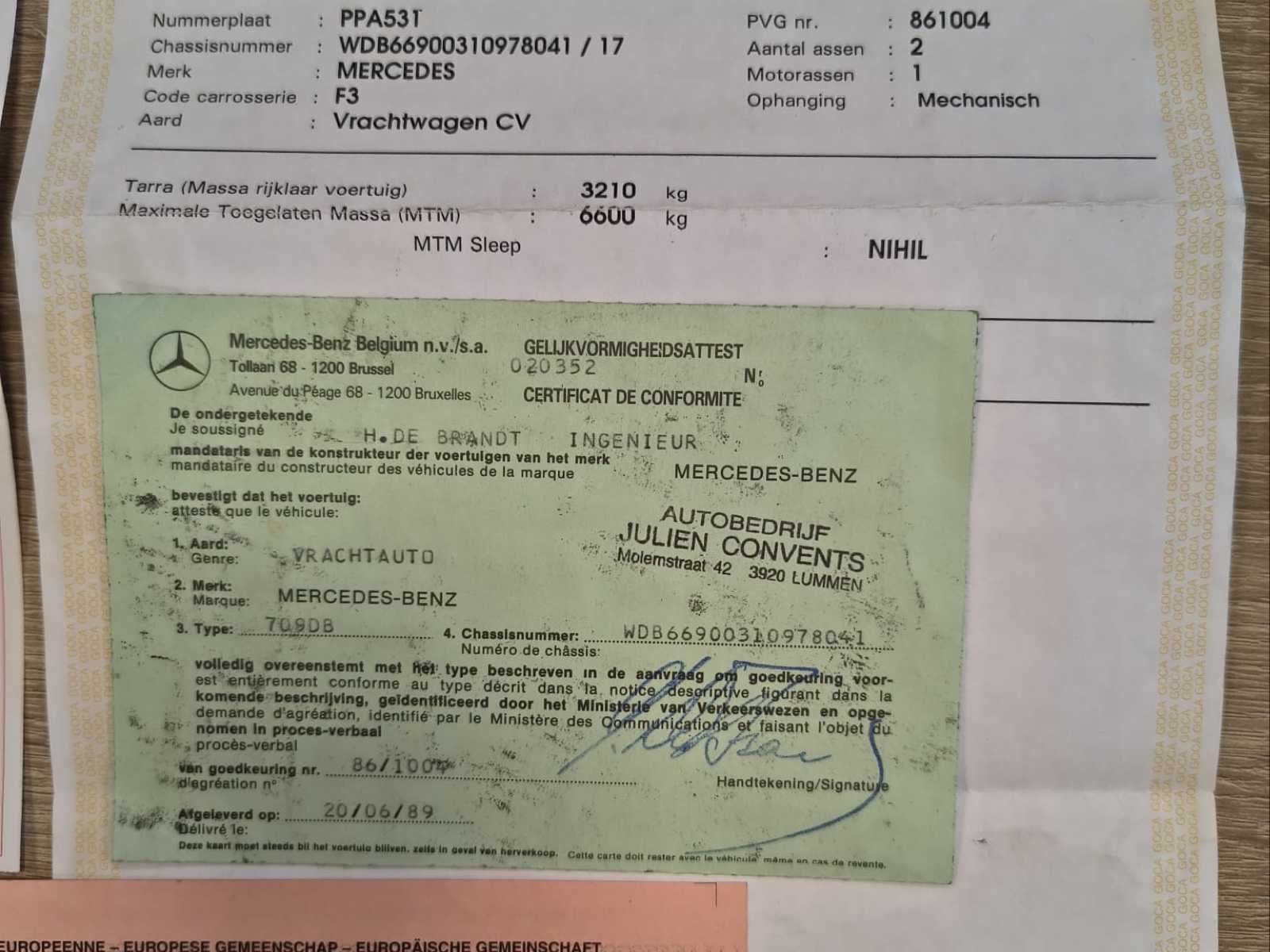 Dient gerestaureerd te worden - start momenteel niet (batterij stuk) en rode technische keuring (zie verslag) Nee Merk: Mercedes Type: 709D Bouwjaar: 1989 Chassisnummer VIN: WDB66900310978041 Kilometerstand bij opname: 228567km Datum eerste toelating: 23/8/1989 Type transmissie: Handmatig Fuel Type: Diesel Eigen gewicht: 3210kg Nationaliteit documenten: B Kentekenpapieren compleet?: true Aantal zitplaatsen: 3 Handgeschakelde versnellingsbak: true