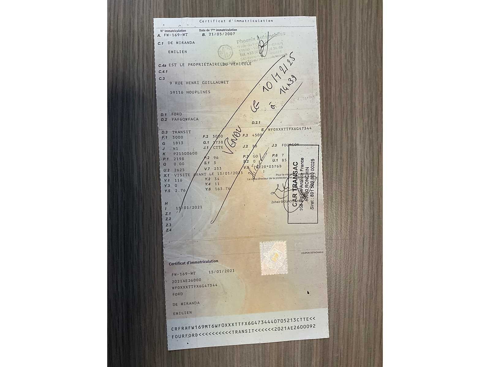 Nee Merk: Ford Type: Transit Bouwjaar: 2007 Chassisnummer: WF0XXXTTFX6G47344 Afgelezen kilometerstand: 230069km Cilinderinhoud: 2198cc Vermogen (kW): 96kW Datum eerste inschrijving: 21/05/2007 Transmissie: Geschakeld Aantal zitplaatsen: 3 Nationaliteit documenten: FR Aantal deuren: 5