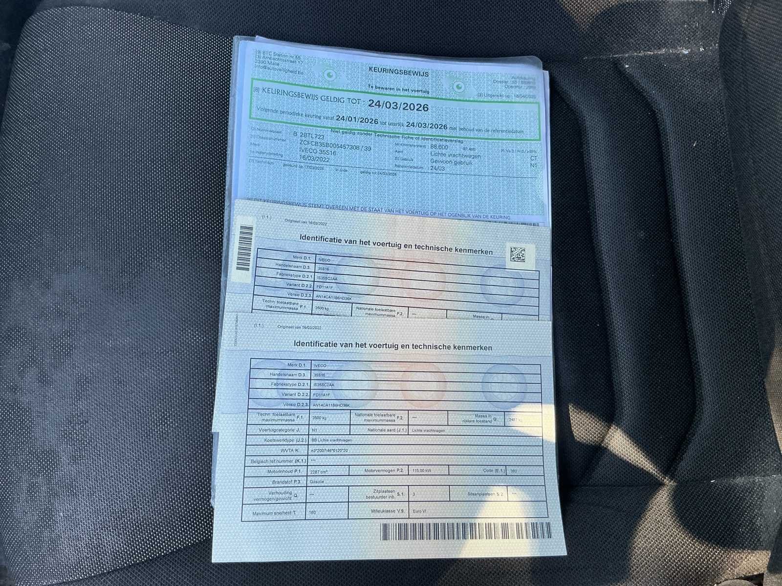 No Merk: Iveco Model: Daily Type: Bestelbus Bouwjaar: 2022 Afgelezen kilometerstand: 110250km Cilinderinhoud: 2287cc Vermogen (kW): 115kW Brandstof: Diesel Chassisnummer: ZCFCB35B005457308 Datum eerste toelating: 16/3/2022 Vermogen (pk): 156hp Energielabel: Euro VI Aandrijving: FWD Aantal zitplaatsen: 3 Kleur: Wit Transmissie: Automaat Stuurwiel: Links Emissieklasse: Euro 6 Aantal deuren: 5 Aantal sleutels: 2 Ledig gewicht: 2487kg Aantal cilinders: 4 Nationaliteit documenten: Belgische Onderhoudshistorie: Aanwezig Gelijkvormigheidsattest aanwezig: true Carpass: true Start en rijdt: Ja Keuringsrapport geldig tot: 24/3/2026 startinformatie : Start en rijdt Self drive export possible : true Vavato voert geen technische keuring uit.: true Airconditioning: true Navigatie: true Inschrijvingsbewijs - deel 1 : Aanwezig Inschrijvingsbewijs - deel 2: Aanweziga