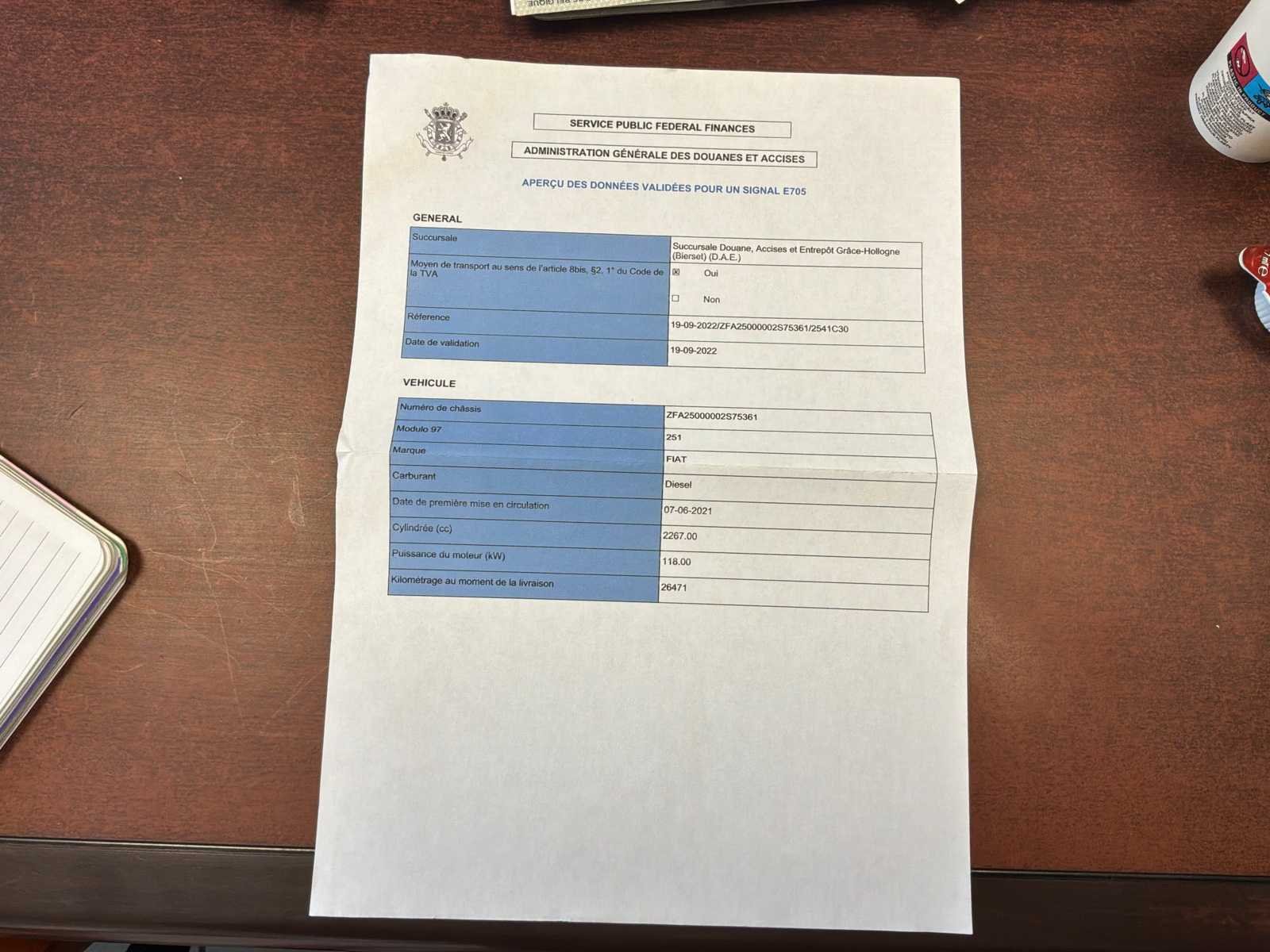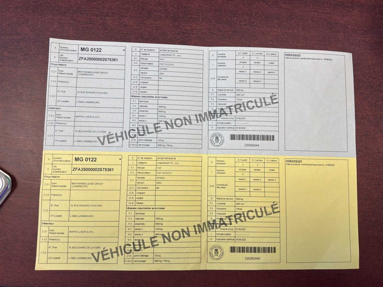 Voertuig met douanegoedkeuring No Merk: Fiat Type: 250 Model: Ducato maxi Bouwjaar: 2021 Chassisnummer: ZFA25000002S75361 Afgelezen kilometerstand: 26650km Cilinderinhoud: 2287cc Brandstof: Diesel Datum eerste inschrijving: 01/06/2021 APK vervaldatum: 04/08/2022 Kleur: Donkergrijs Nationaliteit documenten: Luxemburgs Stuurwiel: Links Aantal deuren: 2 Aantal sleutels: 2 Energielabel: Euro6