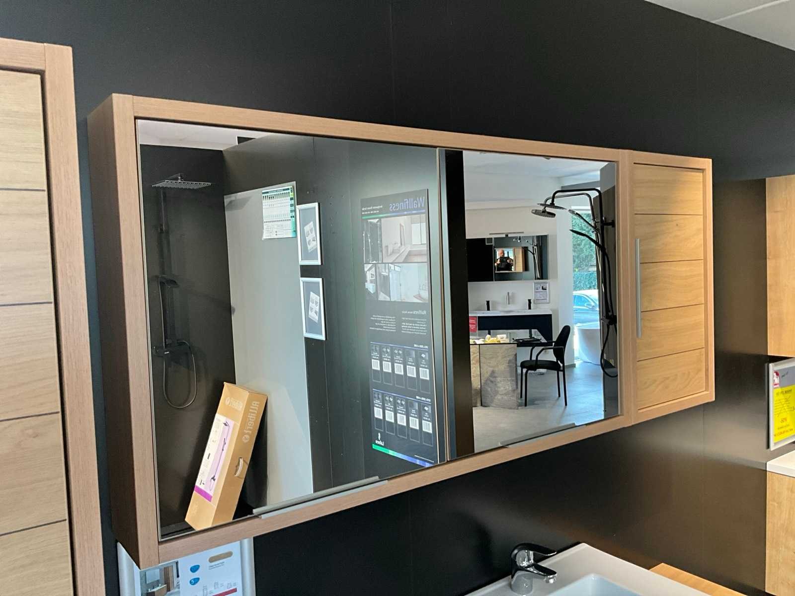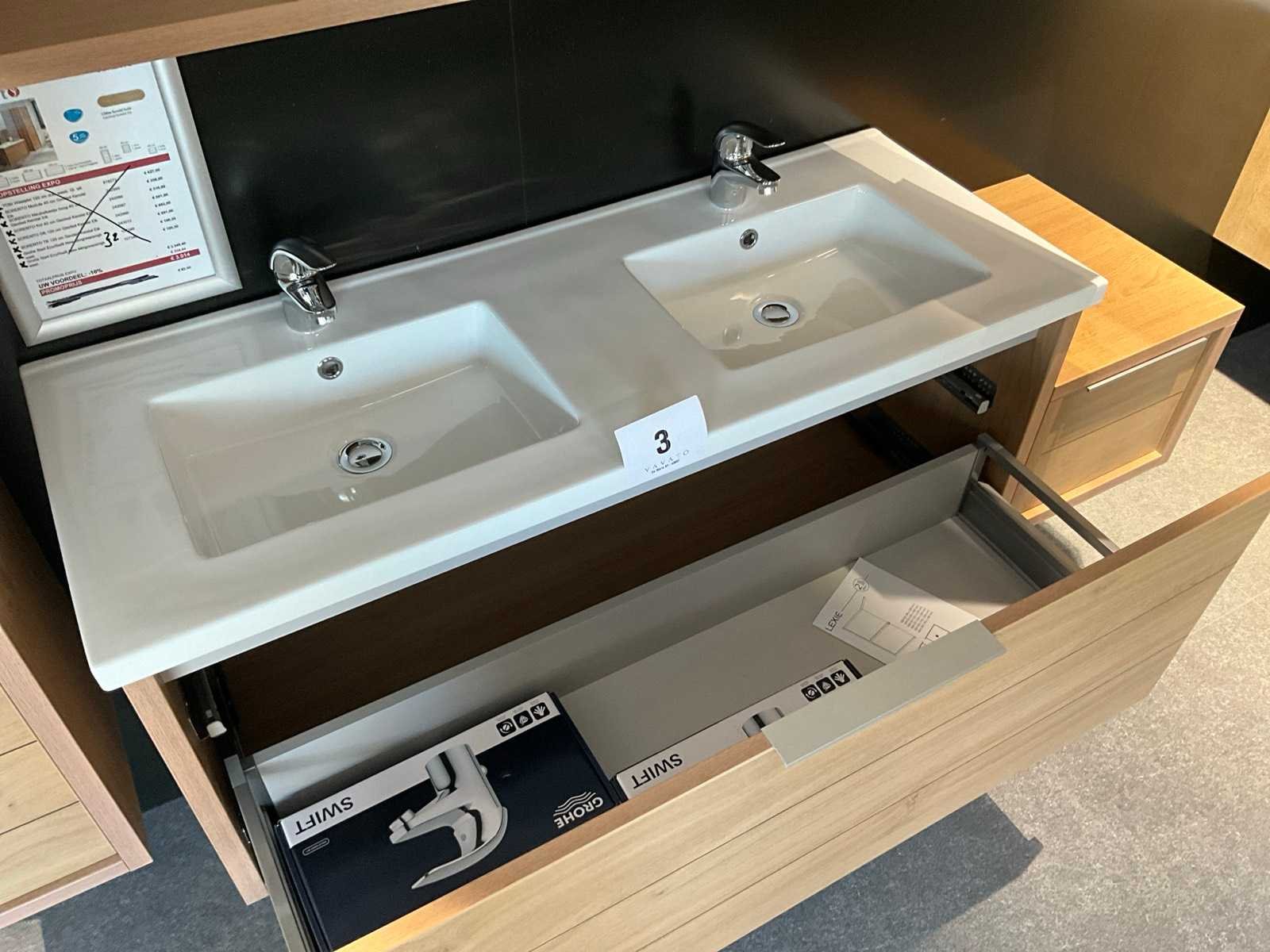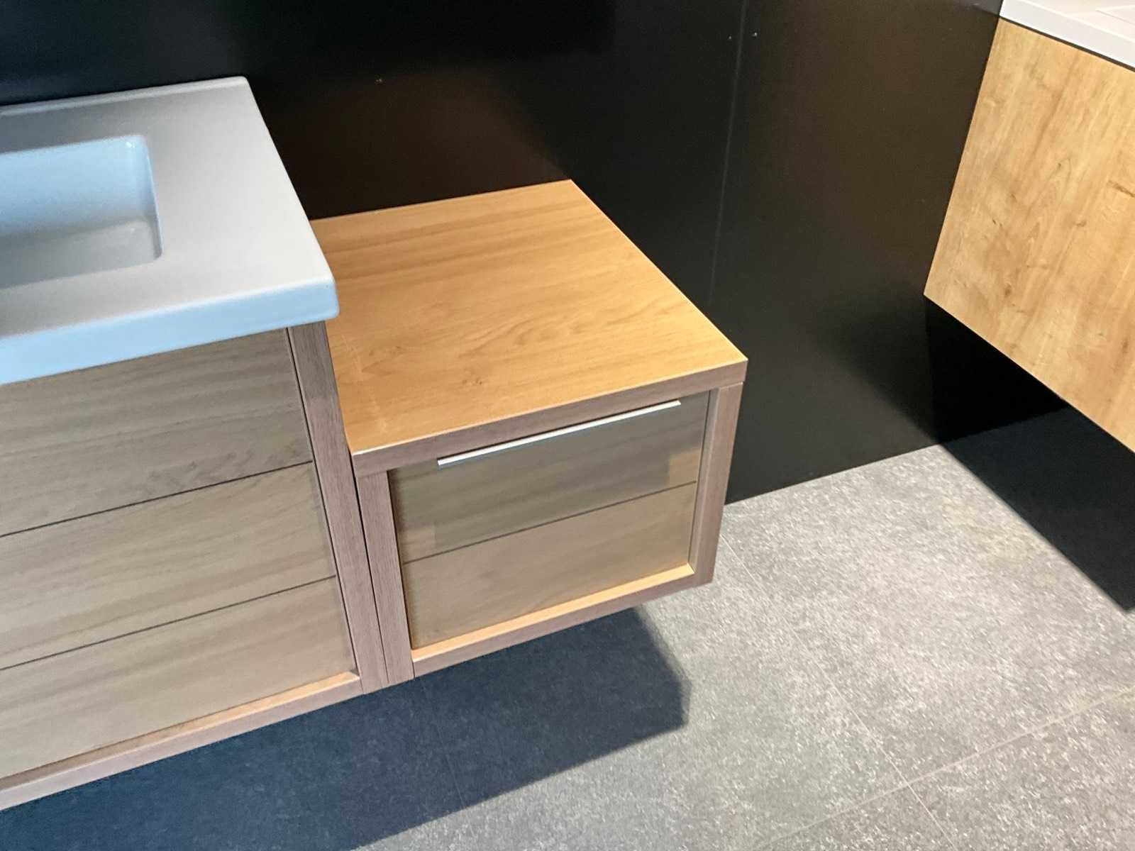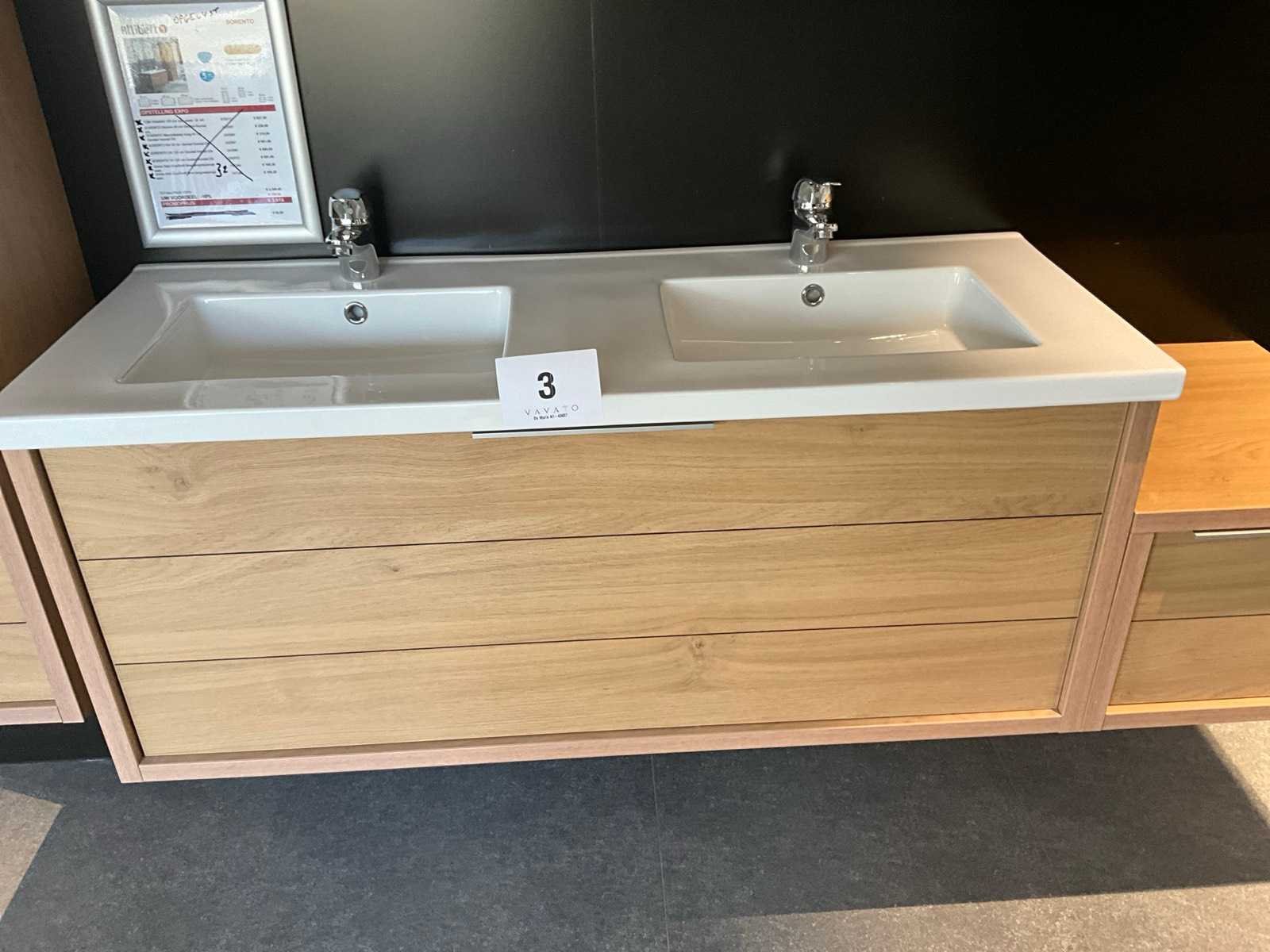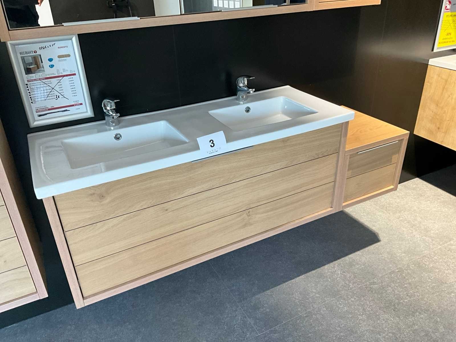 Bestaande uit onderkast voorzien van 1 lade met afmetingen:120x50x50cm, bijzetkast met afmetingen:40x46x32cm, kolomkast voorzien van 1 deur met afmetingen:43x35x156cm, dubbele wastafel , 2x mengkraan ALLIBERT, spiegelkast voorzien van 3 deuren met afmetingen:160x16x69cm Nee Merk: Allibert Product type: Sorrento
