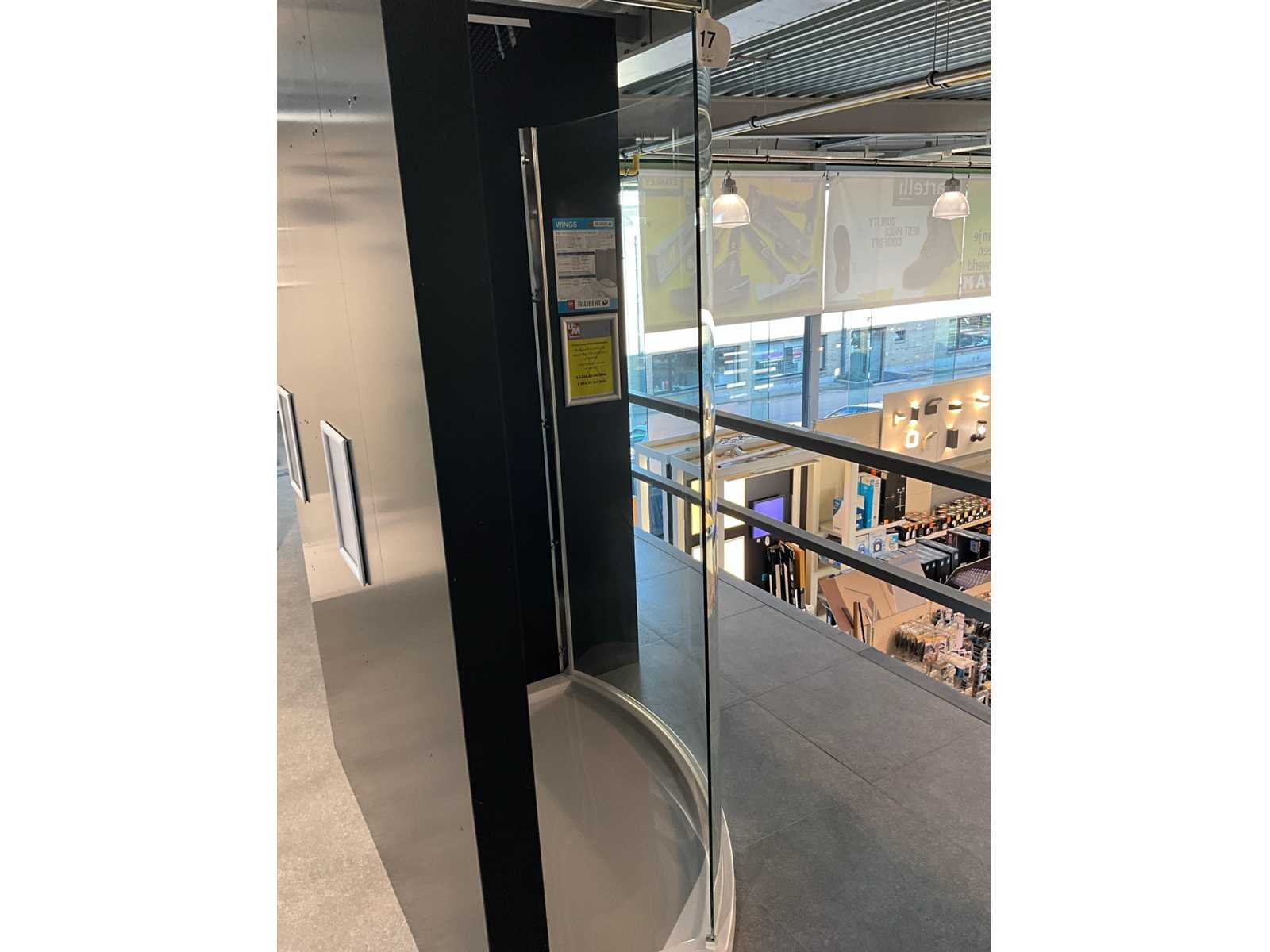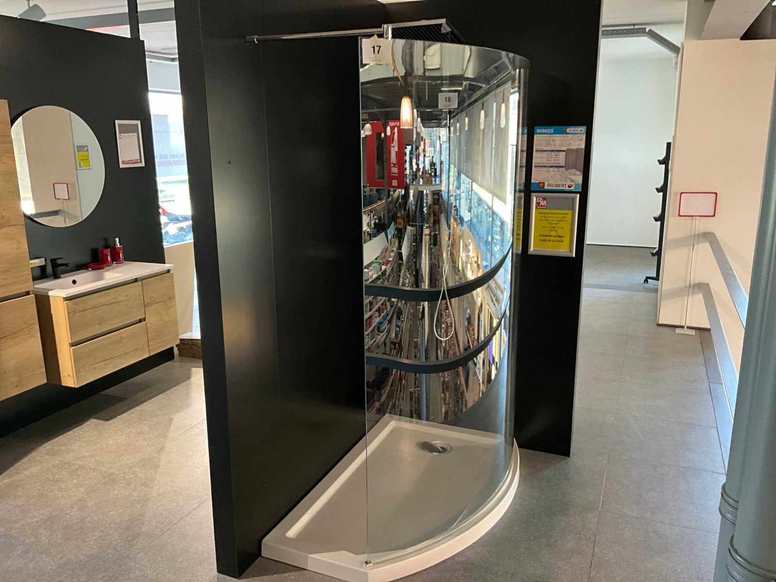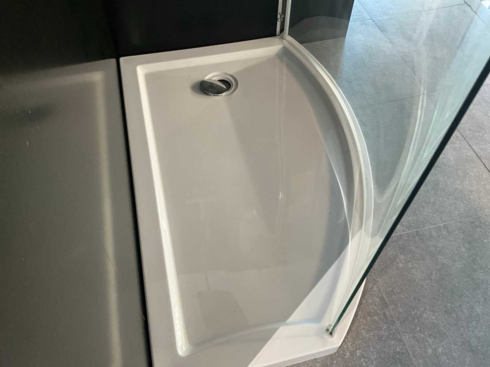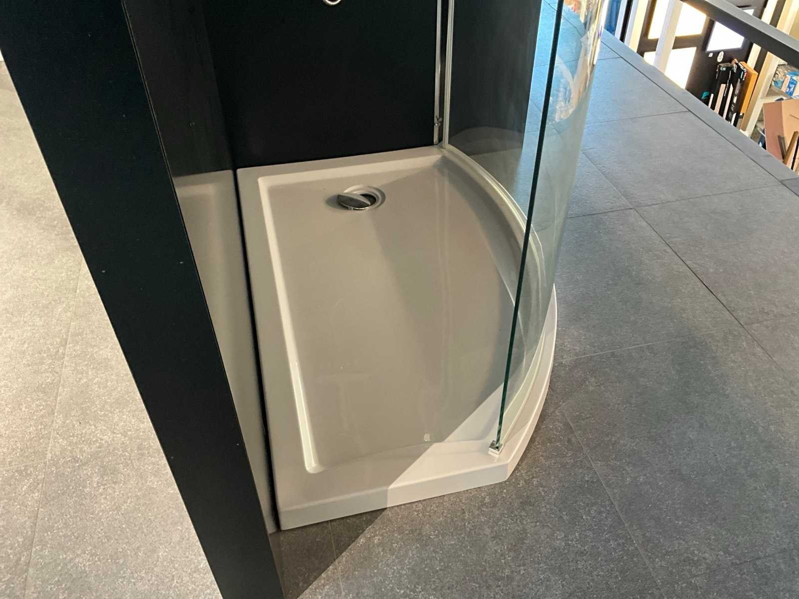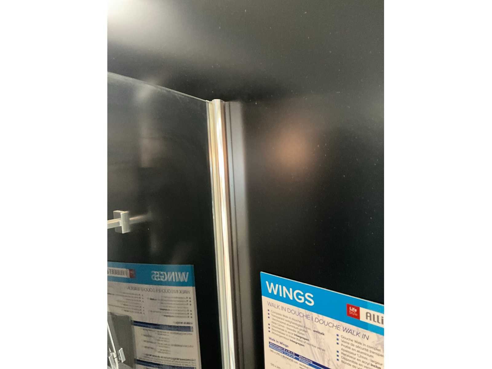 Compleet met douchebak, zonder douchekolom Nee Merk: Allibert Model: Wing walks Lengte: 90cm Breedte: 140cm Hoogte: 210cm