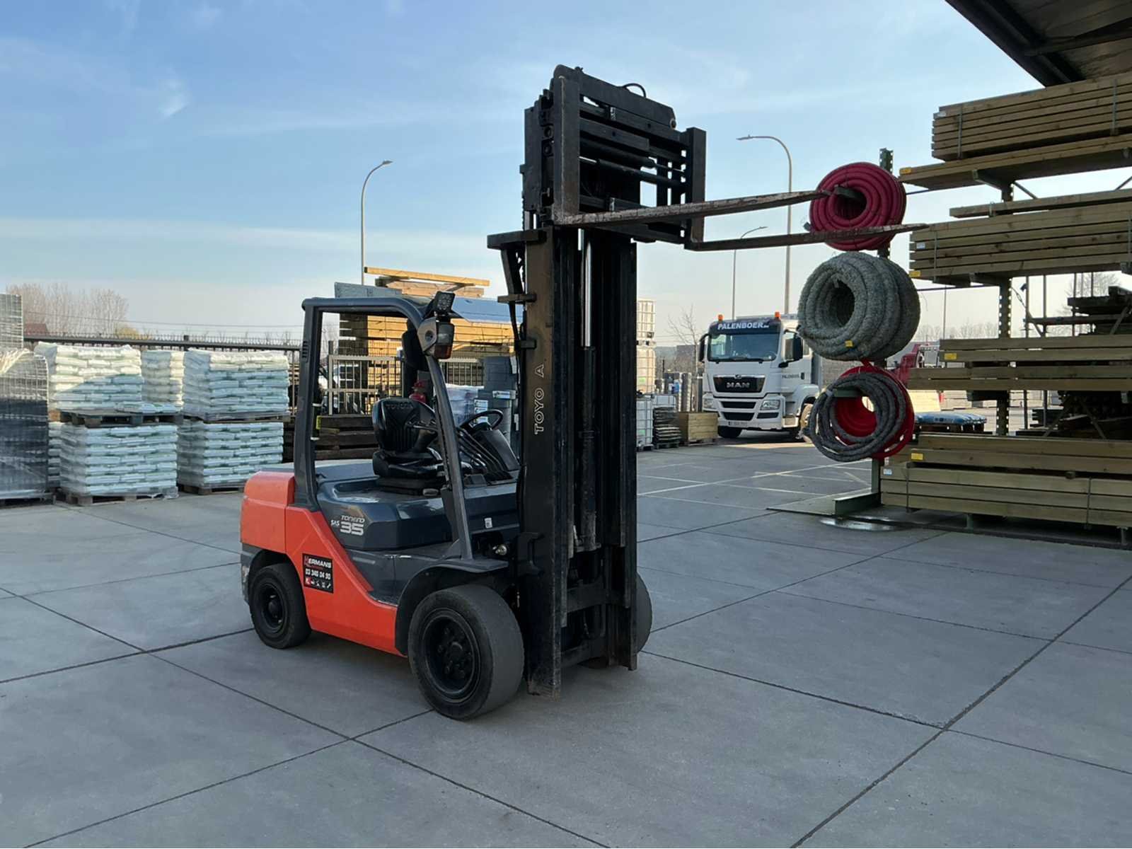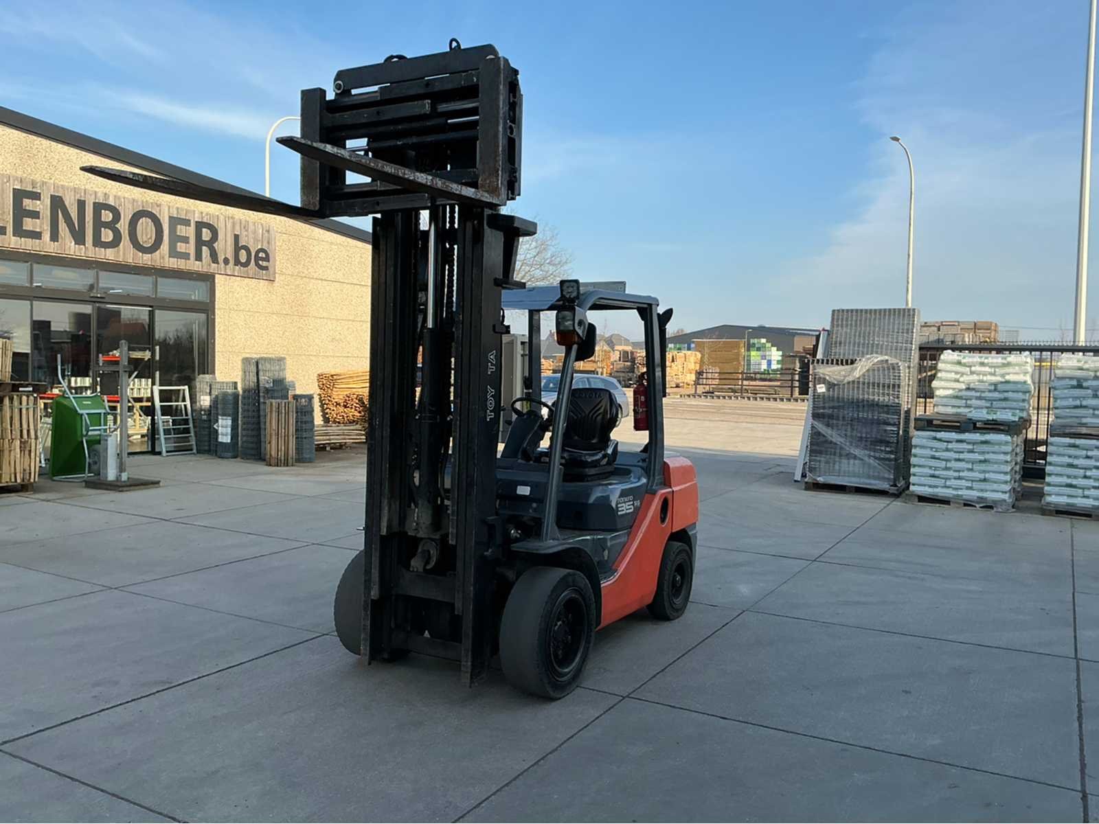 Toyota heftruck in uitstekende staat met weegschaal en met inschrijvingsbewijs voor de openbare weg. Nee Merk: Toyota Type: FSV E911A 3.5T Bouwjaar: 2010 Brandstof: Diesel Afgelezen urenstand: 5255 Free-lift: true Side-shift: true Triple mast: true Eigen gewicht: 5350kg Hefvermogen: 3500kg Max. hefhoogte: 4700mm Vol rubber banden: true