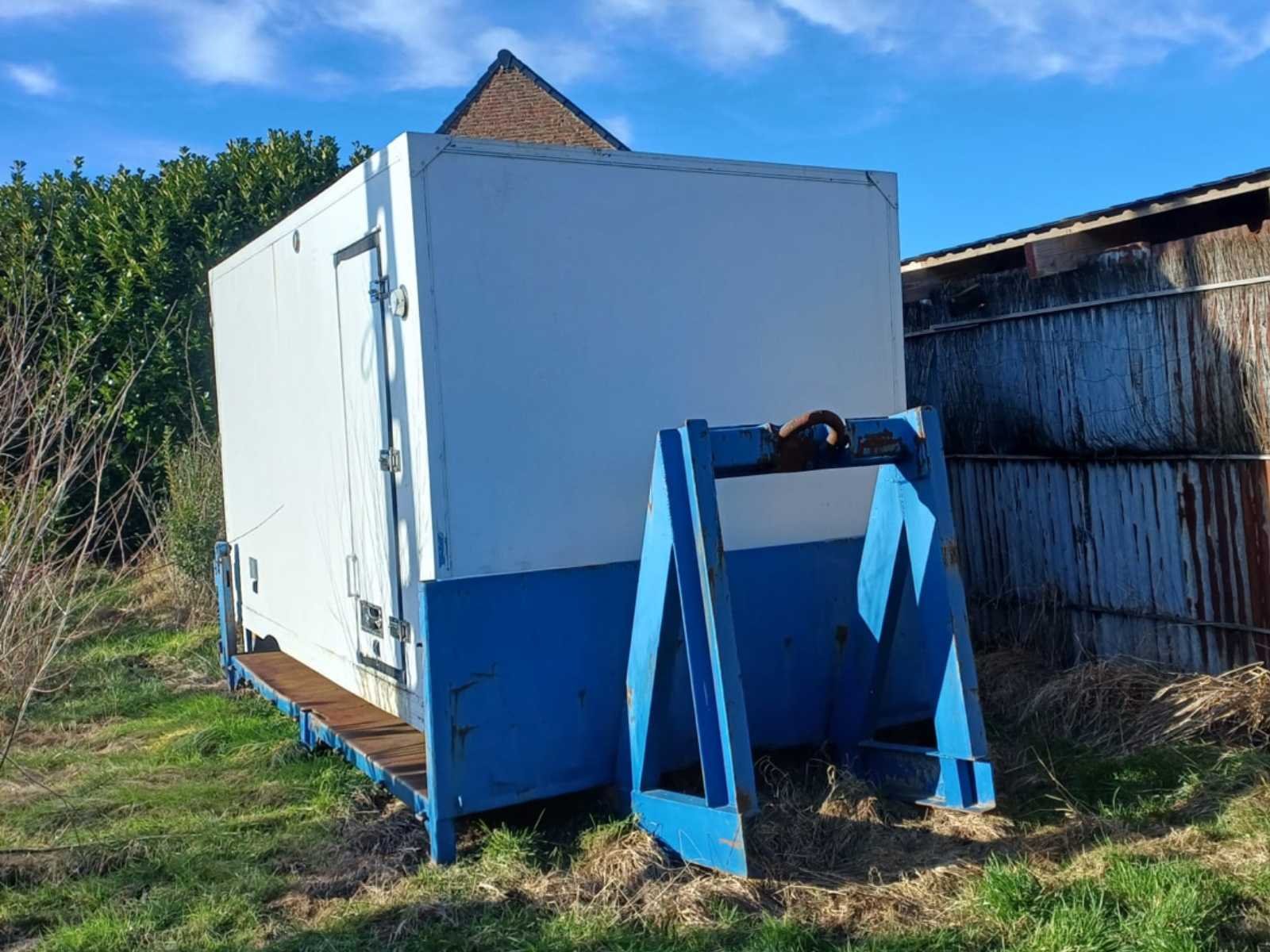 Dit lot wordt verkocht in combinatie. Containerplateau + opslagunit. (Unit bestaat uit 2 compartimenten, kan nog gebruikt worden als opslagunit of ombouw naar keuze.)// van op de grond gemeten tot bovenkant van de box is het 2m65cm hoog en de lengte van de container is +- 5m50 Nee Totale afmeting L: 5500mm Totale afmeting Hoogte: 2650mm