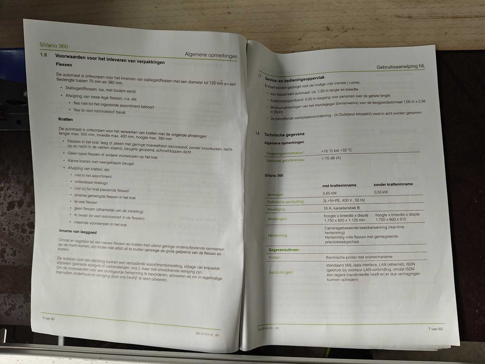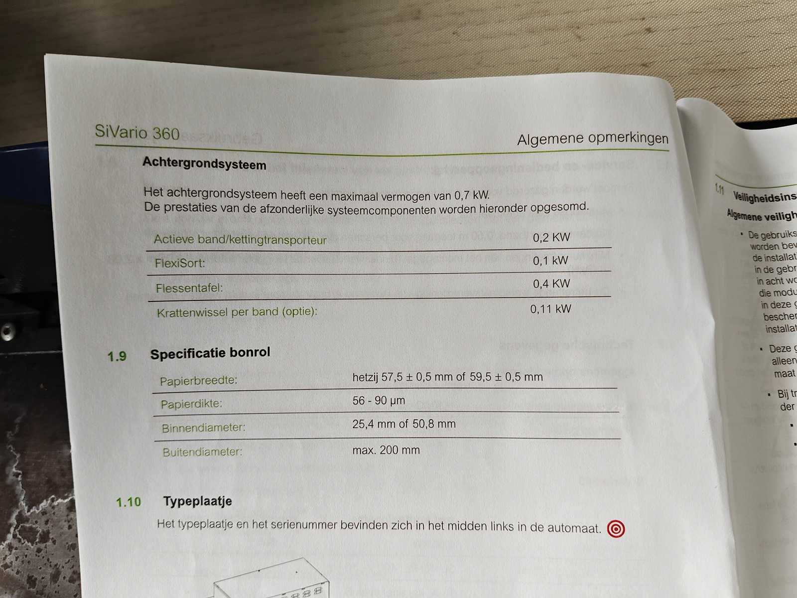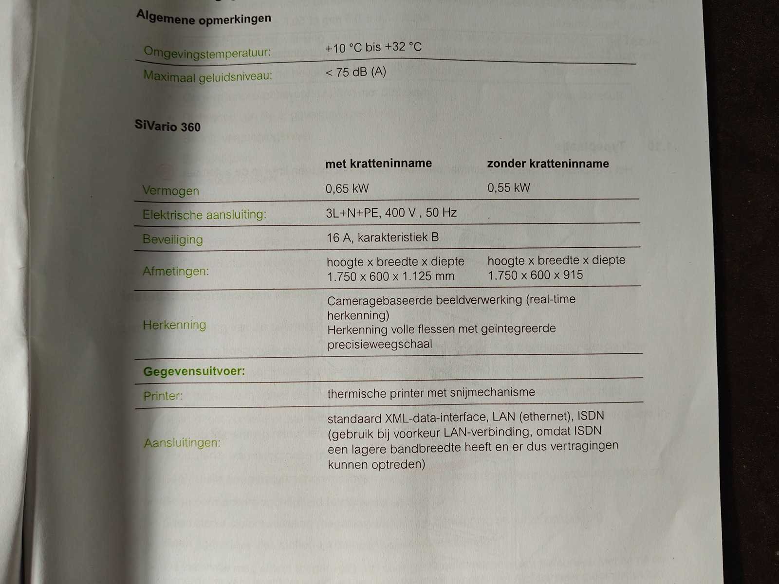 400 volt / 3 phase (Meer technische details op de foto's) Voorzien van originele nederlandstalige handleiding Details afmetingen: - Automaat: (BxDxH): 620mm x 1270mm x 1930mm - lange bruine tafel (3000mm x 950mm x 1800mm) - Blauwe bochtige rollenbaan(1700mm x 800mm x 470mm) - Blauwe rechte rollenbaan (2050mm x 590mm x 330mm) - lage bruine net na automaat ( 1050mm x 690mm x 51mm) Gratis geladen op vrachtwagen. No Merk: Sielaff Model: Sivario 360 Gewicht: 400kg