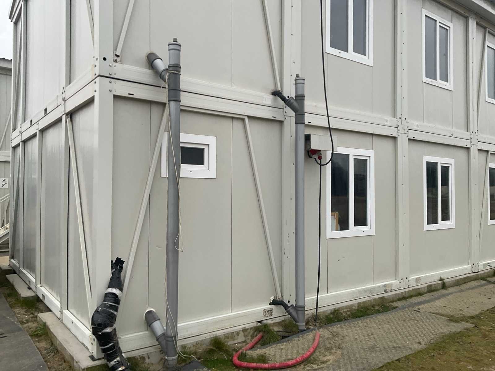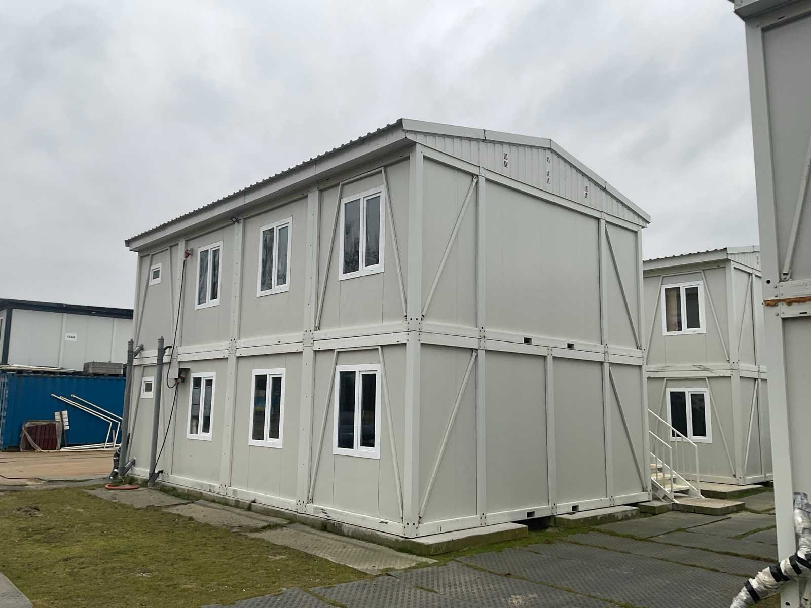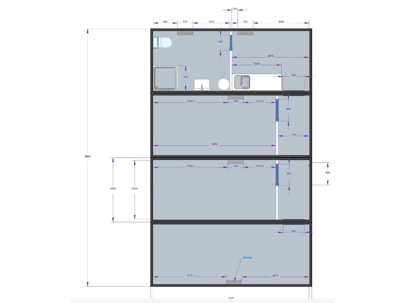 Bestaat uit 8 geschakelde containers; voorzien van dakconstructie en trap; uitgerust met: 2x keukenblok, 2 x toilet, 2 x douches; 2 x boiler met capaciteit 80L, 2 handwasser, 10 elektrische bijverwarming; 8 grote ramen en 2 x klein kantelraam, / afmeting individuele container: 2000x6000x2560mm; trap heeft 14 + 1 treden en een dubbele balustrade, Aankoopprijs per huis (8 containers + dak) in 2022 = 75.000 euro Nee Schakelunit: true Aantal ramen: 10 Keukenblok: true Toilet: true Totale afmeting L: 9600mm Totale afmeting Breedte: 6000mm Totale afmeting Hoogte: 6100mm