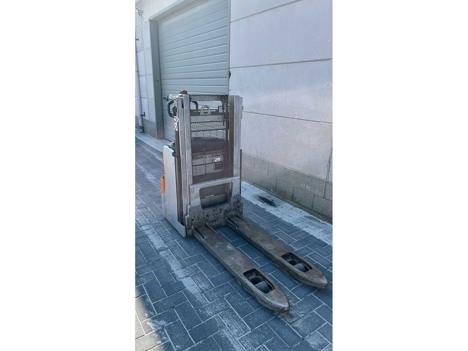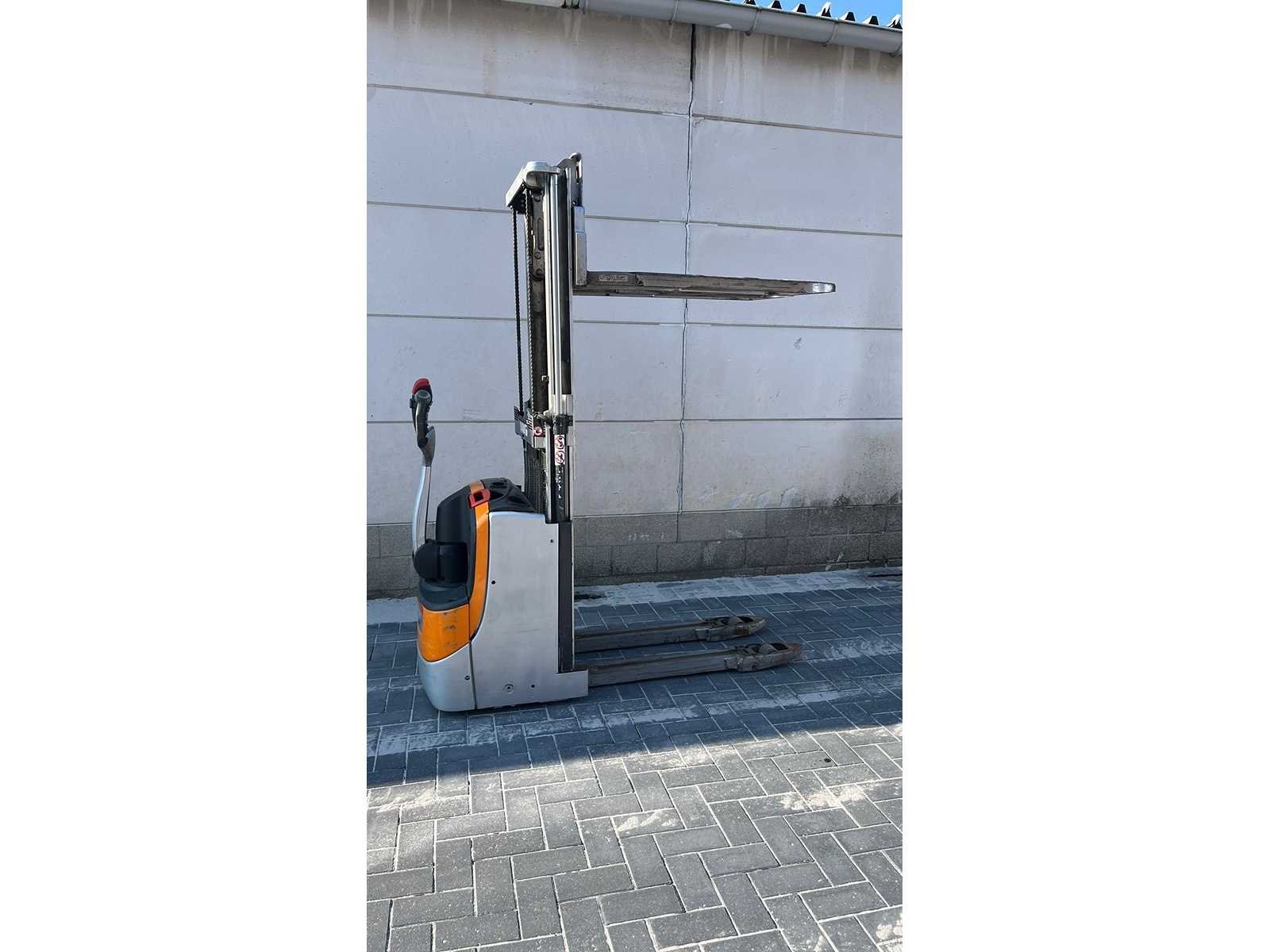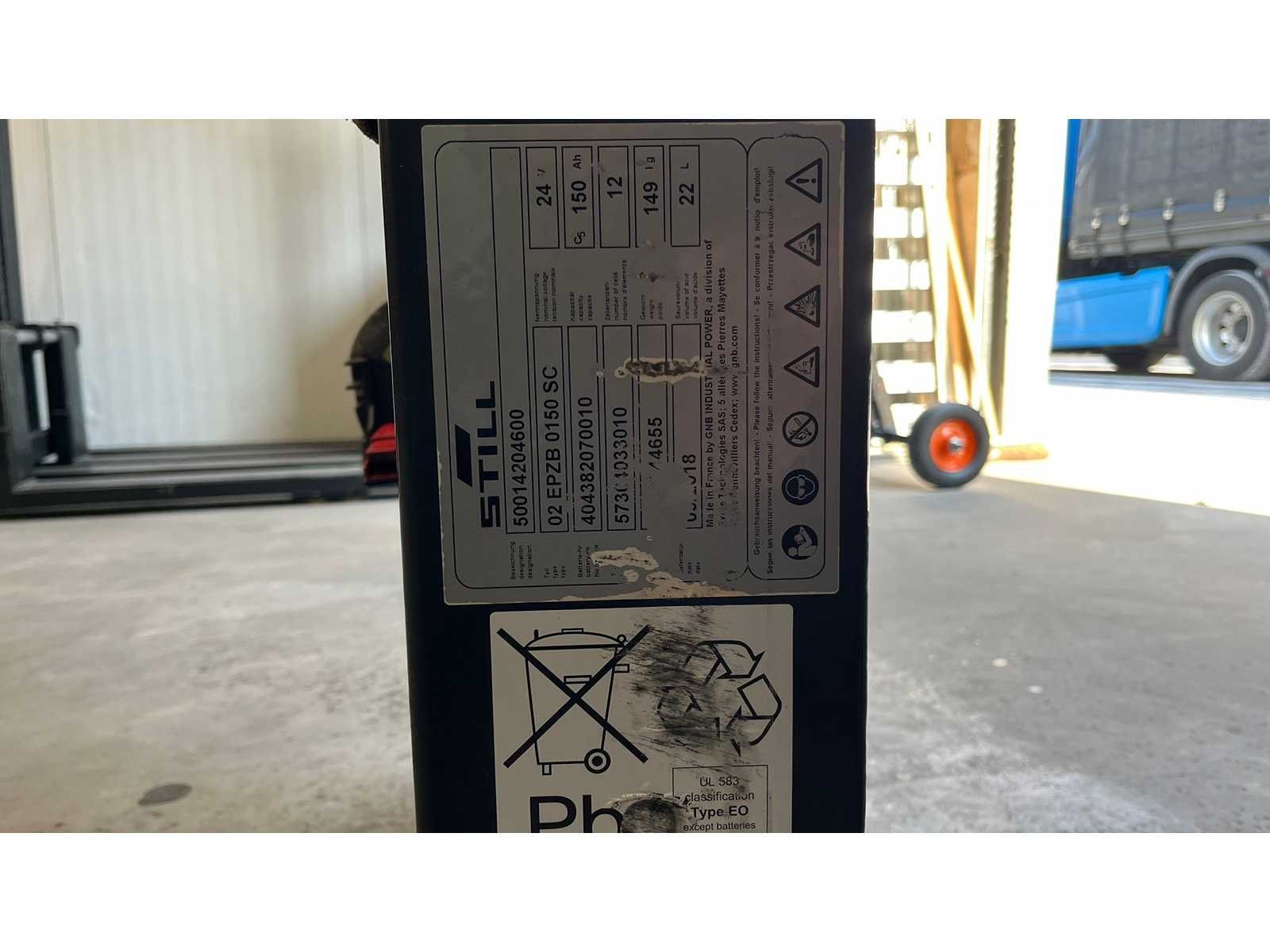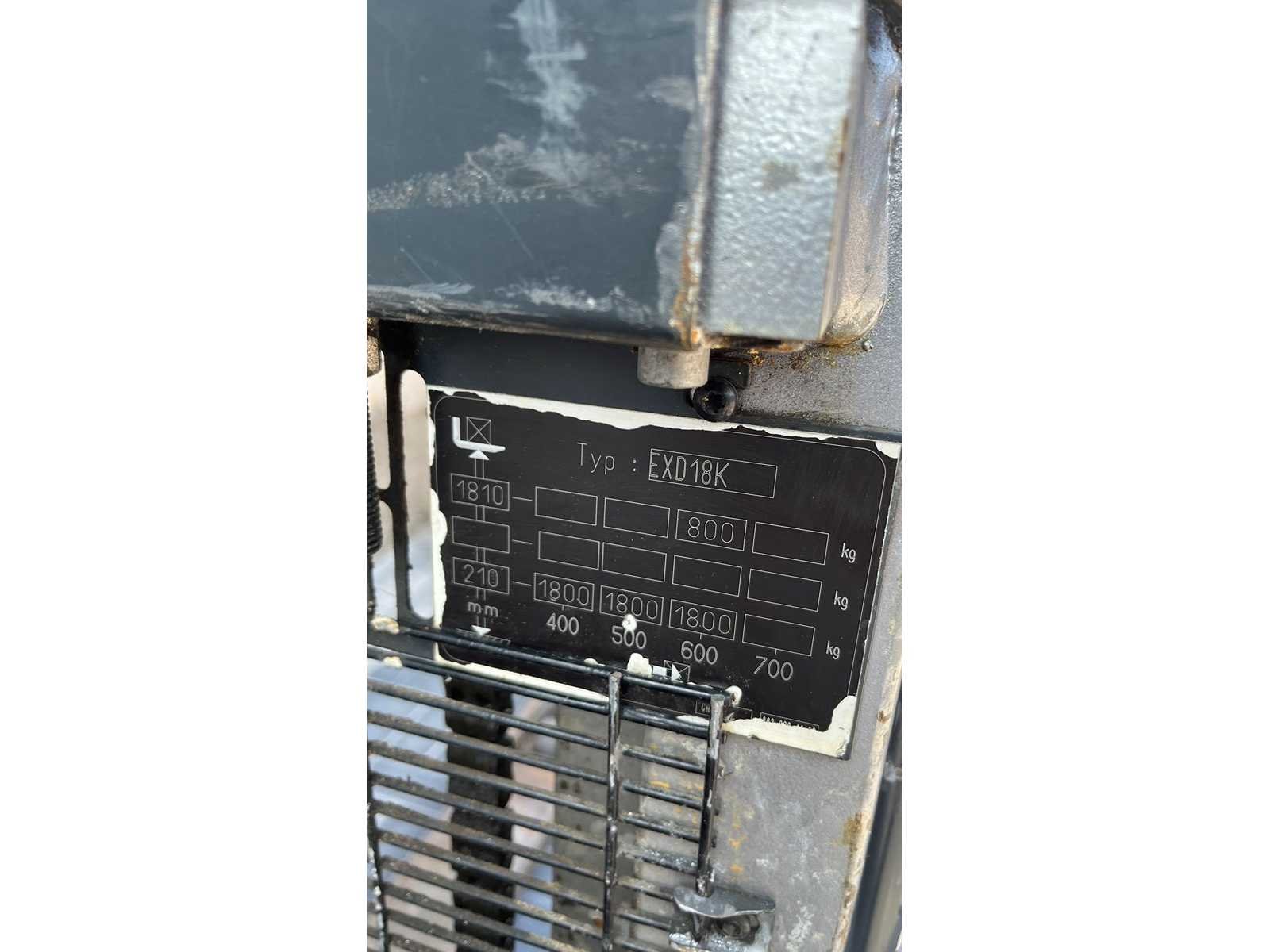 Technisch gegevens ( nieuwe toestel) Nominale belasting (bij koers over grond): 1.8 t Wielbasis: 1413 mm Standard banden: 1x-2/2 Transportatie lengte: 1949 mm Transport breedte: 720 mm Transport hoogte: 1290 mm Zwaartepunt: 600 mm Hefhoogte: 1574 mm tractiemotor: 1.2 kW hijsmotor: 1.2 kW Capaciteit batterij: 24/150 V/Ah Gewicht: 713 kg Gewicht van de batterij: 141 kg Rijsnelheid met / zonder lading: 6/6 km/h Hijsen met / zonder last: 0.12/0.15 m/s Neerlaten met last: 0.24 m/s Draaicirkel: 1641 mm Model serie: EXD No Merk: Still Type: EXD18K Bouwjaar: 2018 Hefvermogen: 1800kg Lepellengte: 1150mm Accu lader: true Afgelezen urenstand: 406 Eigen gewicht: 700kg Totale afmeting L: 1950mm Totale afmeting Hoogte: 1300mm