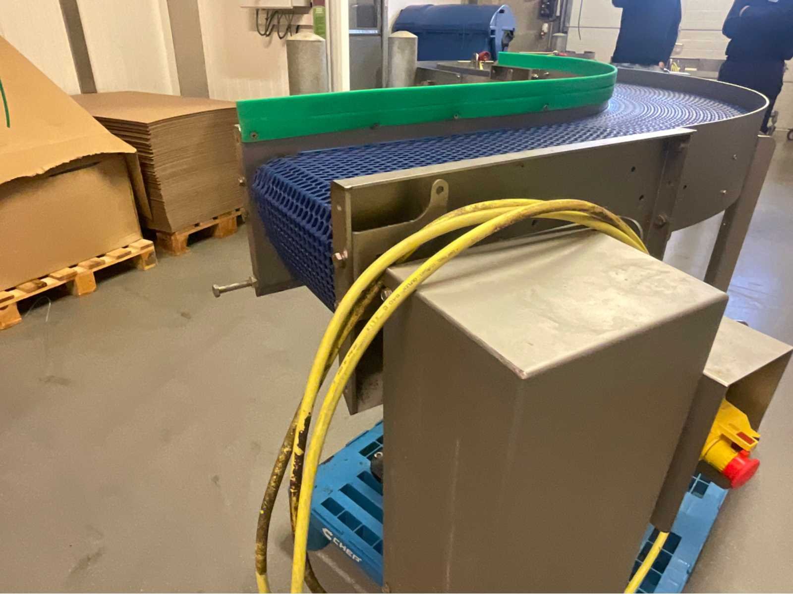 Marvu Blue Modular Belt Conveyor, Model 1000-7801/P10, ontworpen voor voedsel- en dranken- of verpakkingstoepassingen. – Merk: Marvu – Jaar: 2018 – Buighoek: 90° – Spanning: 400 V / 50 Hz – Roestvrijstalen constructie – Blauwe modulaire plastic tape – Groene HDPE-zijgids – Verstelbare voeten met glijbanen – Elektrische kast met noodstop Non Merk: Marvu Type: 330 Bouwjaar: 2018 Serienummer: 100 -7801/P10 Band afm. b: 300mm Totale afmeting L: 900mm
