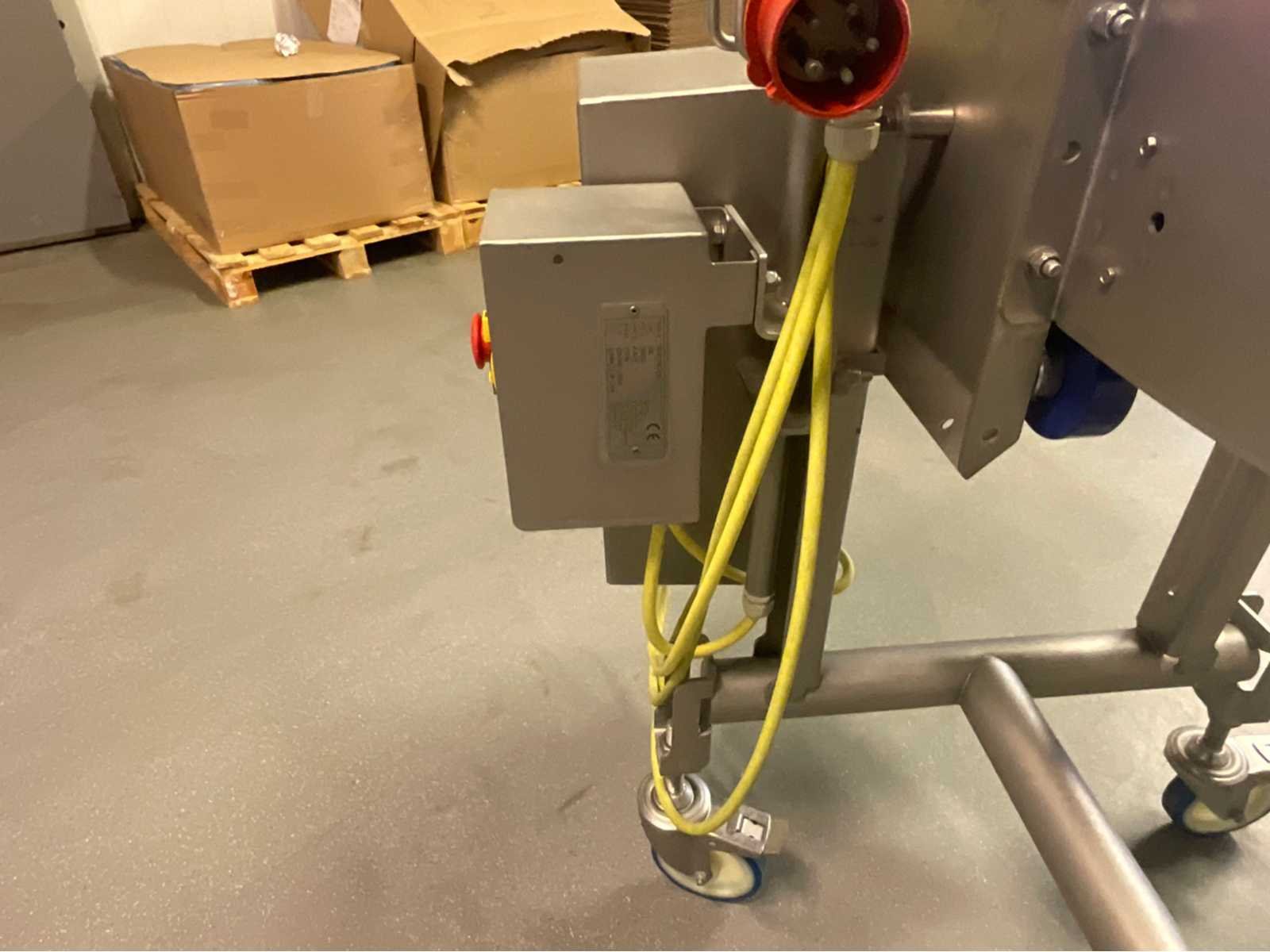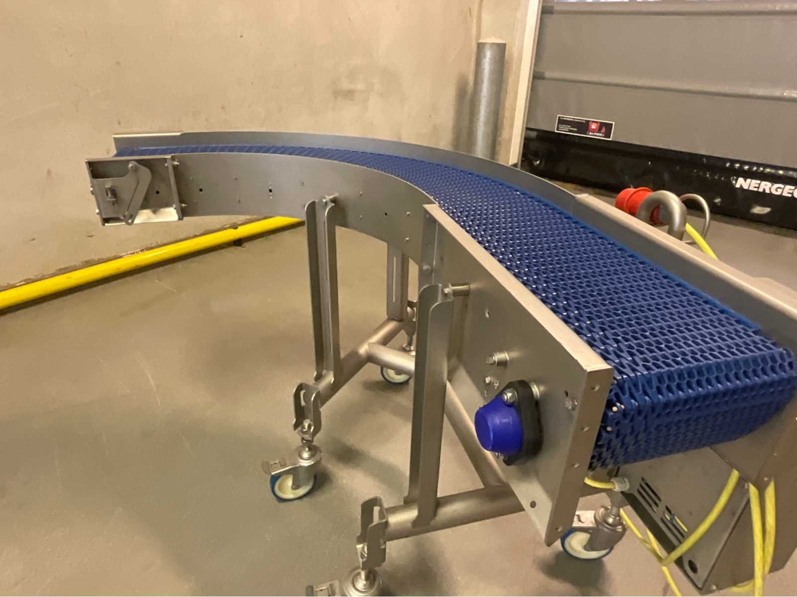 Marvu Blue Modular Belt Conveyor, Model 1000-7801/P10, ontworpen voor voedsel- en dranken- of verpakkingstoepassingen. – Merk: Marvu – Jaar: 2018 – Buighoek: 90° – Spanning: 400 V / 50 Hz – Roestvrijstalen constructie – Blauwe modulaire plastic tape – Groene HDPE-zijgids – Casters – Elektrische kast met noodstop Non Merk: Marvu Type: 330 Bouwjaar: 2018 Serienummer: 100 -7801/P10 Band afm. b: 300mm Totale afmeting L: 900mm