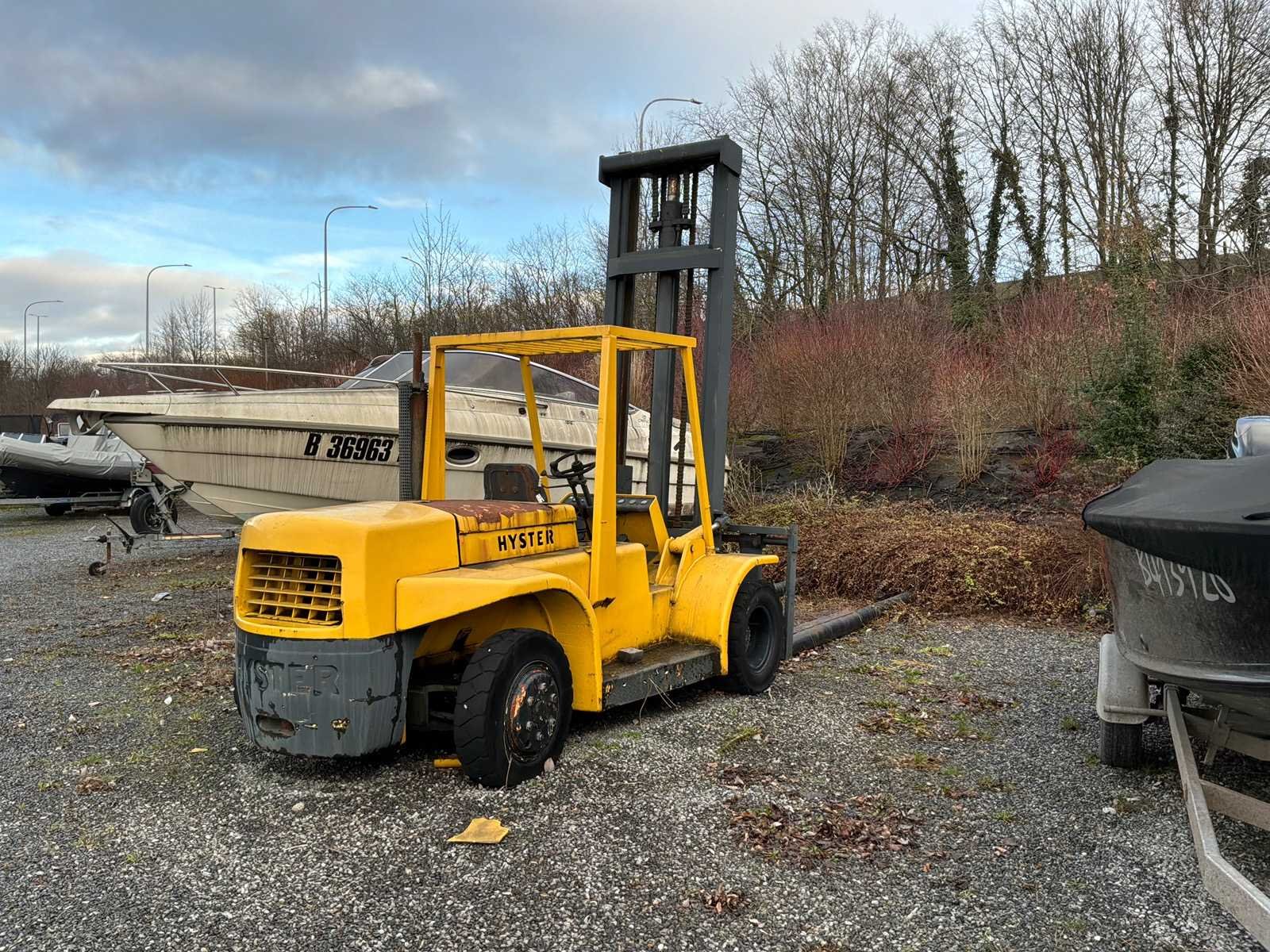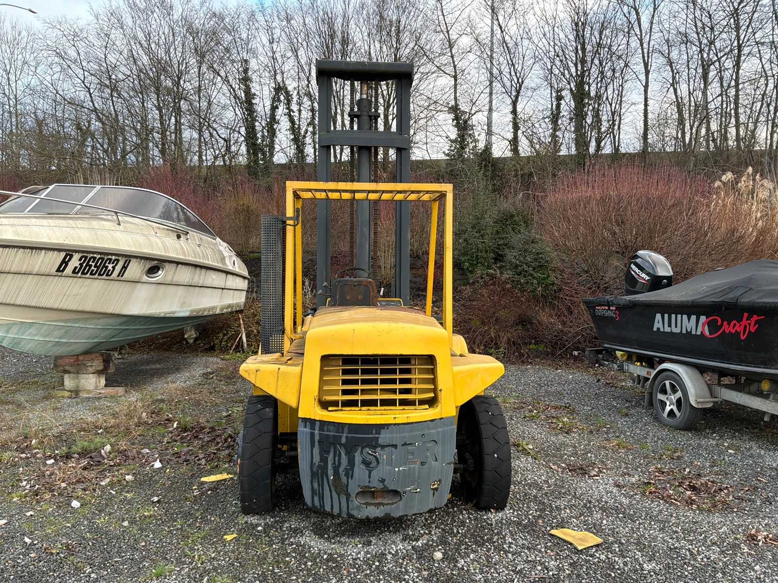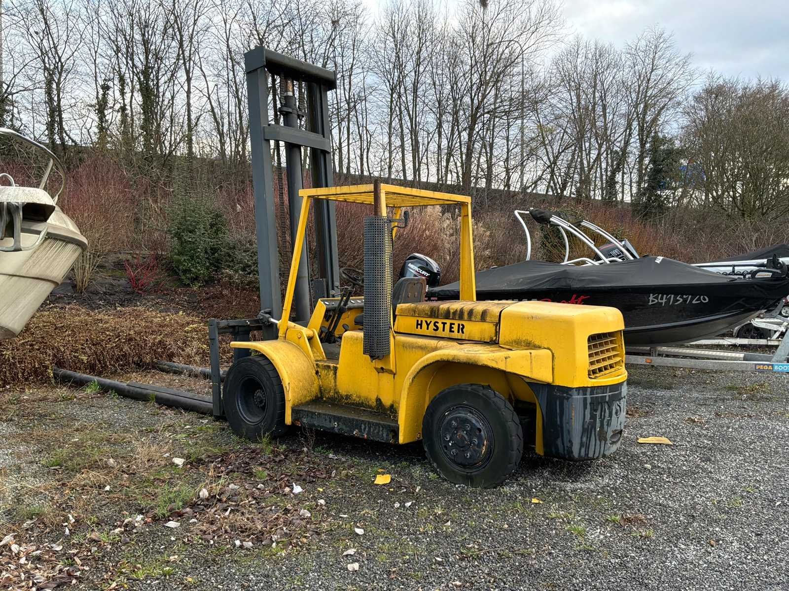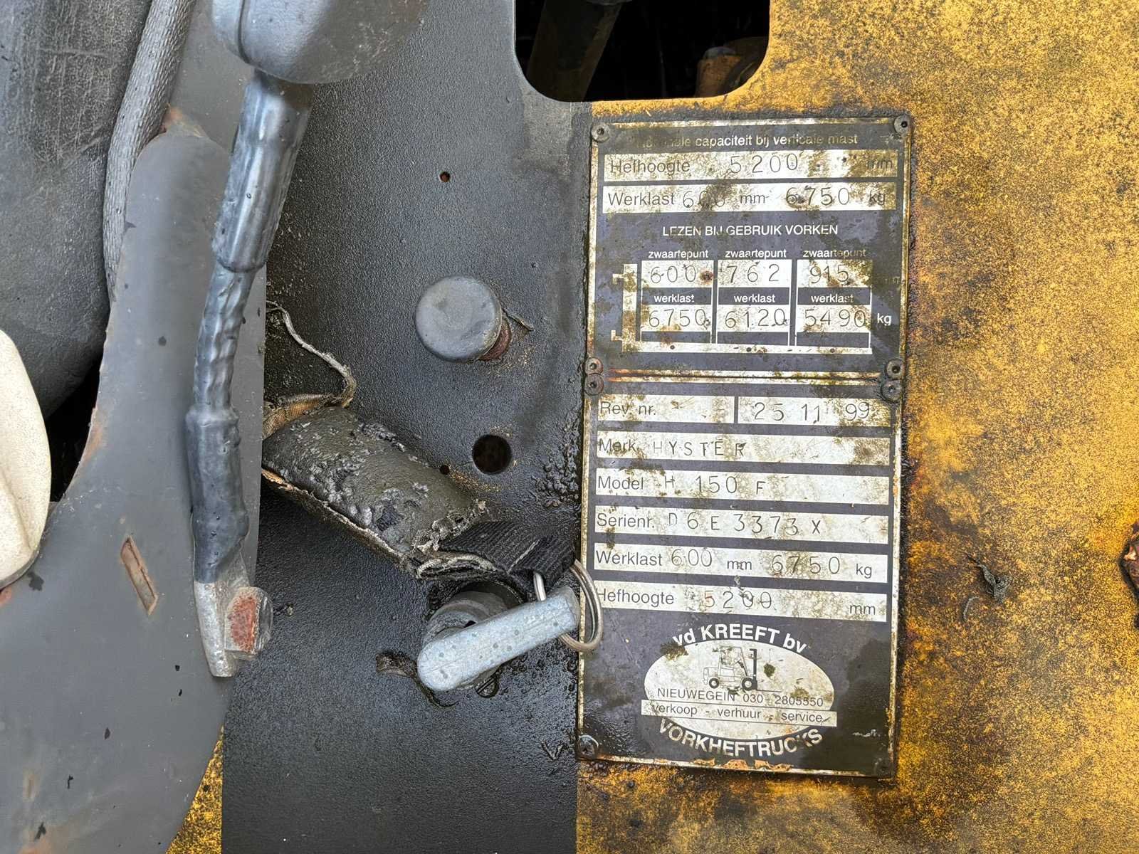 No Merk: Hyster Type: H150F Serienummer: D6E3373X Brandstof: Diesel Mast: Verticaal Aantal wielen: 4 Afgelezen urenstand: 13728 Hefvermogen: 6750kg Hefhoogte: 5200mm Diesel: true